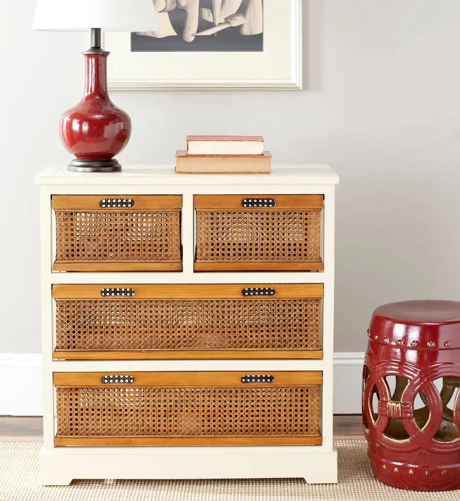 This practical storage unit is built with four roomy drawers in a casual style that's perfect for the kitchen, the entryway, the den, or the bedroom.