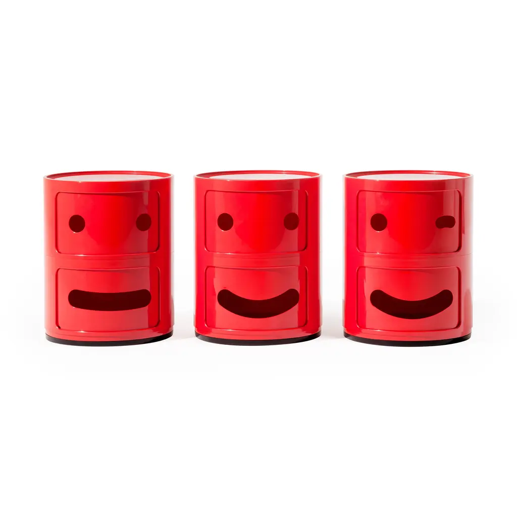 Anna Castelli Ferrieri’s iconic storage unit from 1969, the Componibili, is reinterpreted by designer Fabio Novembre, with the classic round holes re-fashioned as a playful nod to today’s emoticons—and as a way of bringing a smile to the face of anyone who uses it. The Componibili Smile is the result of a design competition that was held to commemorate the 50th anniversary of the Componibili. From all of the various artist and designer interpretations of the iconic design, Smile was the only one that made it into mass production. Made from red, water-resistant ABS plastic by Kartell, a manufacturer in MoMA’s collection, the Componibili Smile is perfect for a children’s room, but adults can also enjoy it for use in other areas of the home as well. It's useful for holding items such as housewares, cosmetics, towels, toys, books, tools, electronics and more. The tongue-and-groove design allows the doors to seamlessly slide open. It has a round shape with a recessed top and two shelves. Produced by Kartell, a manufacturer with work in MoMA’s collection. The Componibili Smile measures 15.75h x 12.6"diam. with 5.6h x 9.25w x 12"d shelves. Please note that the Componibili is not meant to be stacked.