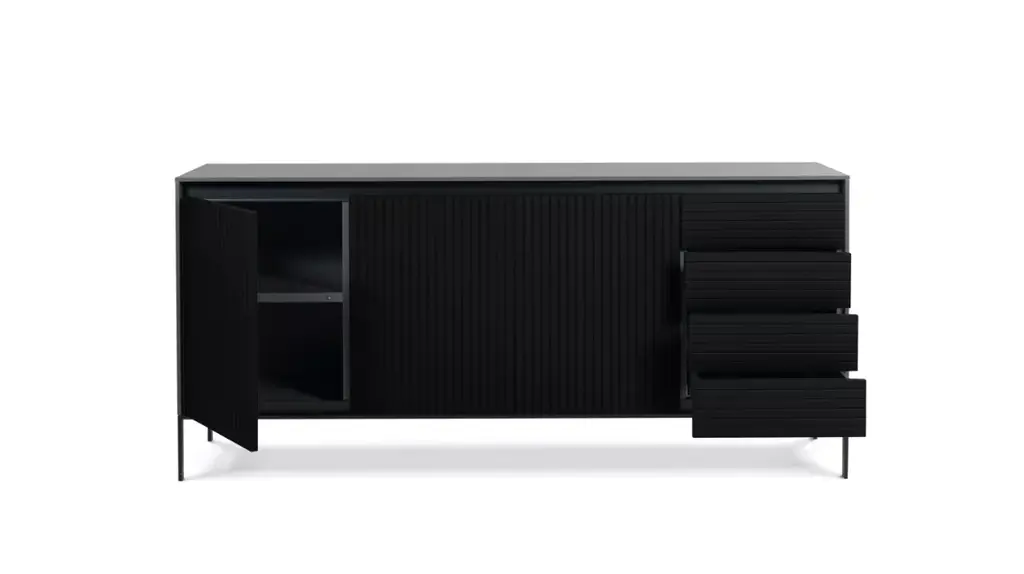 The KEEEN collection is a range of storage units with sober lines, offering modularity and customization thanks to a wide choice of veneers and lacquers. Supported and reinforced by a metal base and frame for great strength, the fronts reveal a subtle interplay of vertical (flaps) and horizontal (drawers) grooves.