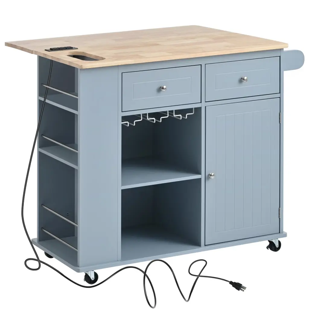 Ktmbdw 40" Kitchen Island With Power Outlet & Drop Leaf, Kitchen Rolling Island With Spice Rack, Kitchen Island Cart With 5 Wheels For Kitchen, Blue