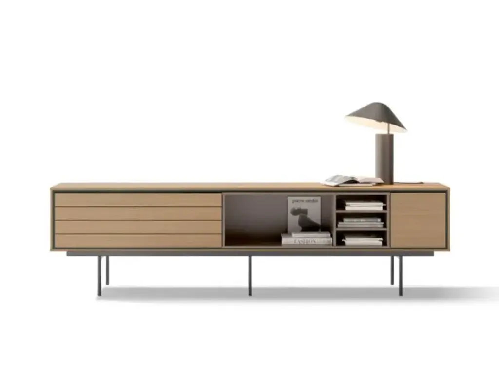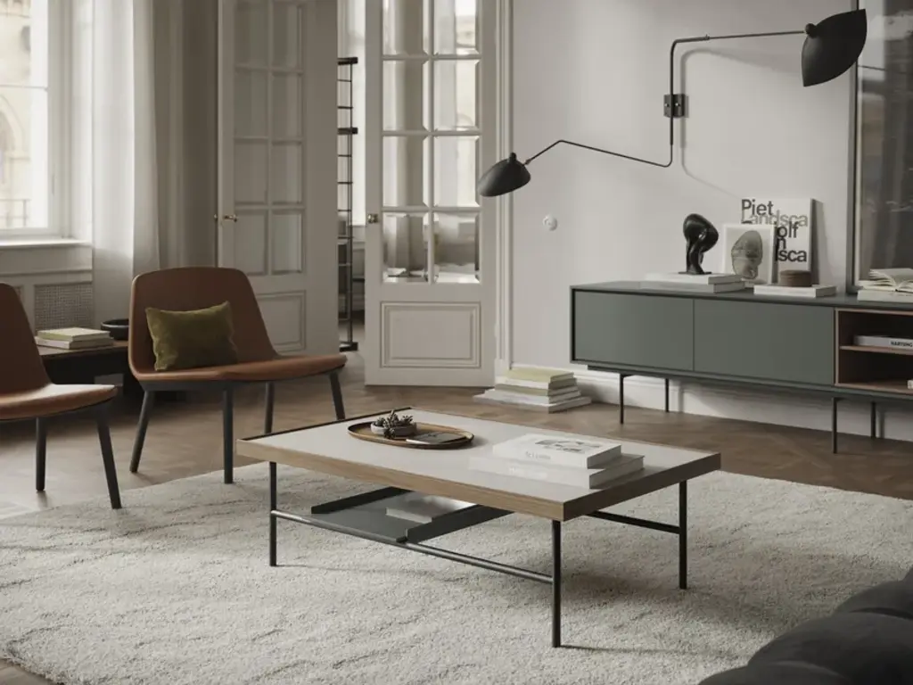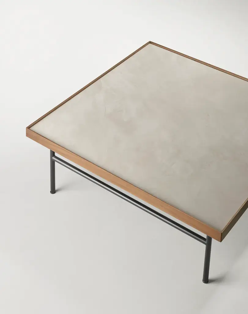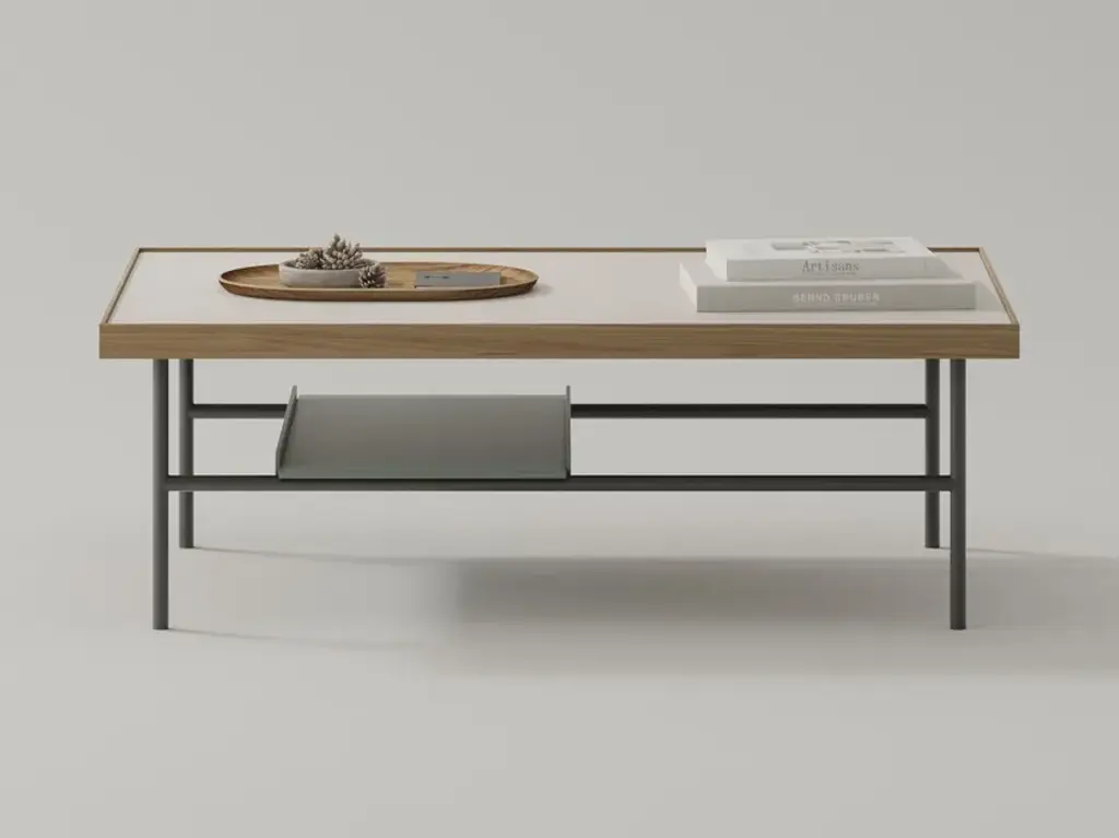 Composition in the Photo:– Top: Porcelain stoneware– Edge: Organic Oak– Storage unit: GraphiteFor additional finishes and color combinations, please contact our customer service center.Kutxa is a coffee table available in a square and rectangular shape, which can be equipped with a shelf. The wooden top can be decorated with a ceramic top.Everything stems from a drawing that came up unexpectedly. That sketch already showed the idea of a box suspended within a very simple and architectural structure. The play of contrasts was also present, between the sturdiness of wood and the delicacy of metal. All the pieces in the Kutxa collection have a sculptural touch, but without direct reference to artists or their work. The idea is that this furniture contributes to creating more peaceful, cared-for spaces, rather than simply optimising storage space. We were keen to create a furniture collection with different figures, where each piece has its own personality and fulfils a function within a visual framework.