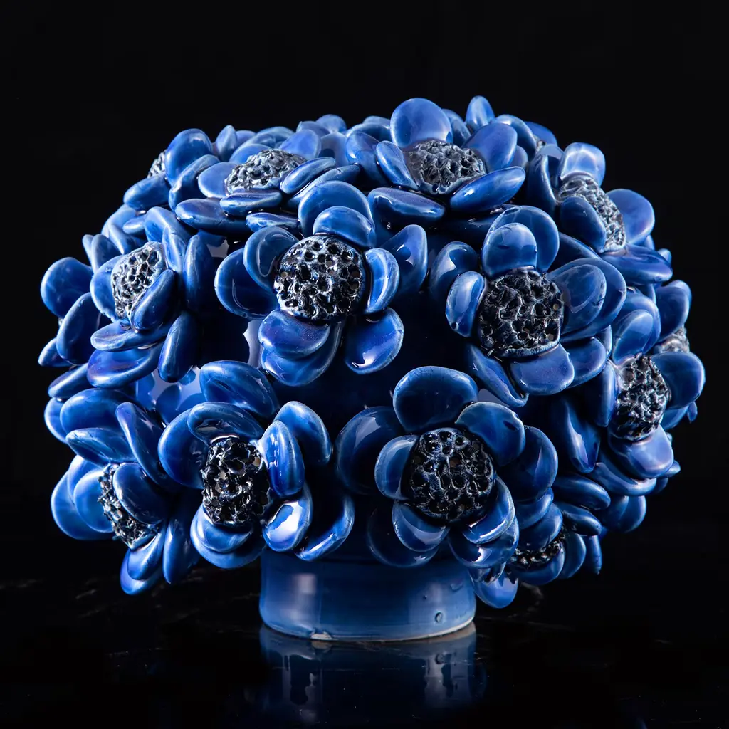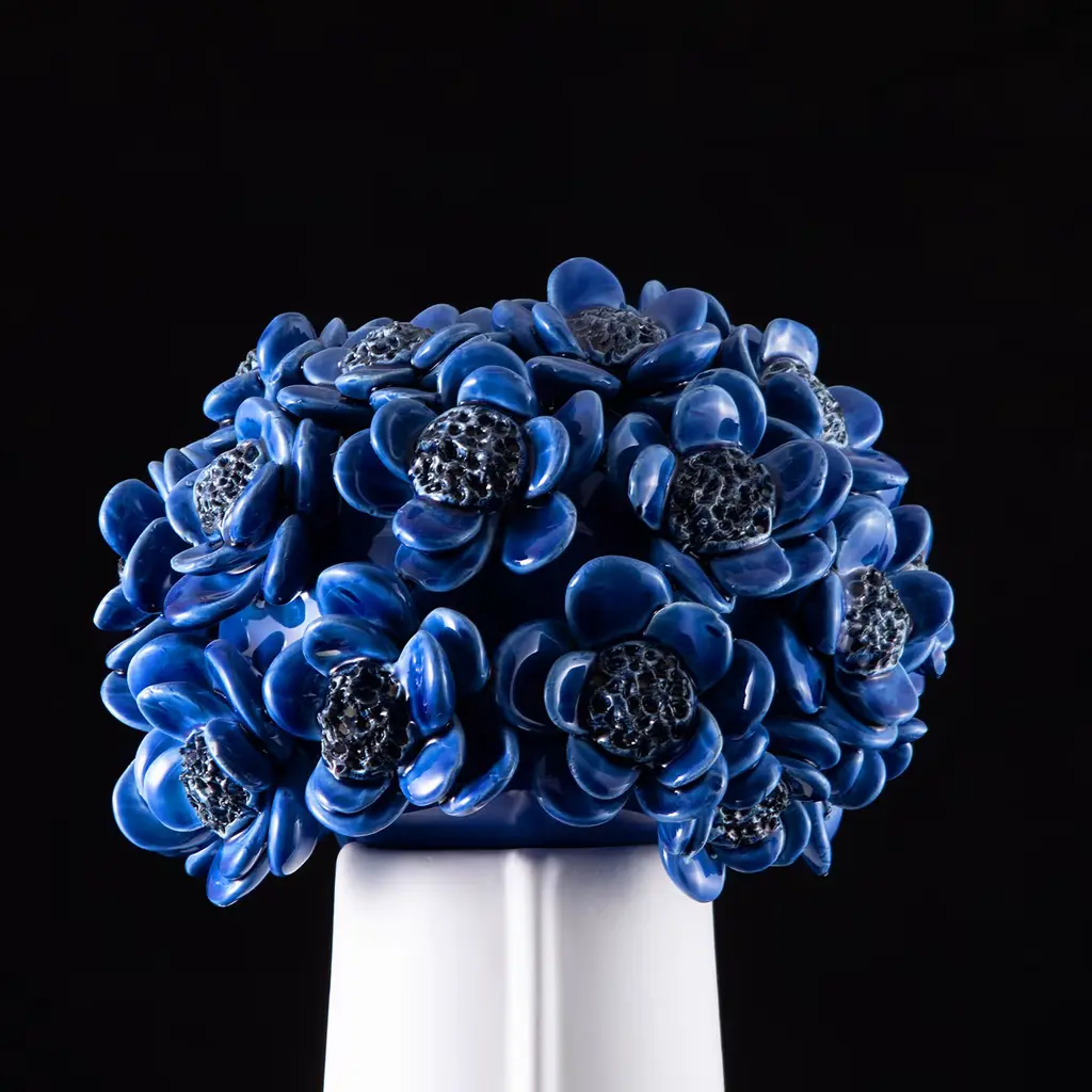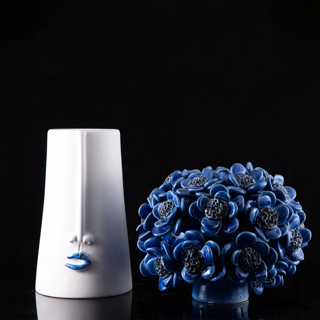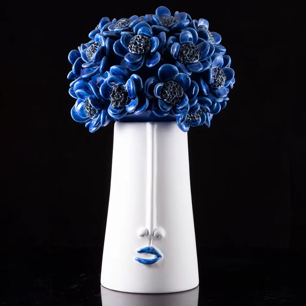 A lid of blossoming deep-blue windflowers states this design's unmistakably decorative value at first glance. The bright-white ceramic body it is set onto sports elegant anthropomorphic traits and conceals a practical storage unit on the inside for collecting anything desired. Playful and sculptural, the design comes in multiple versions available in the Artemest catalog.