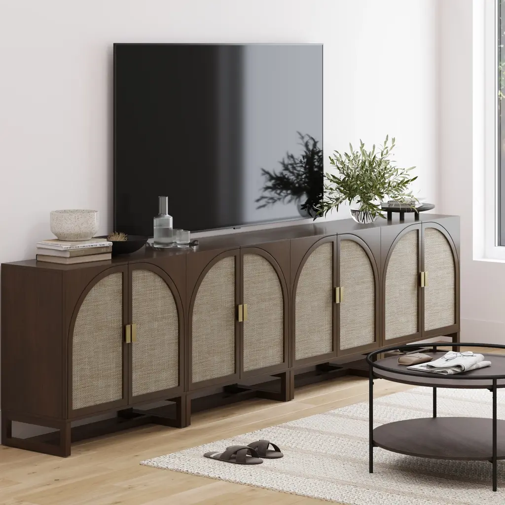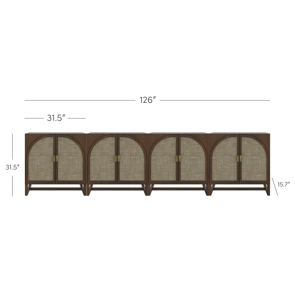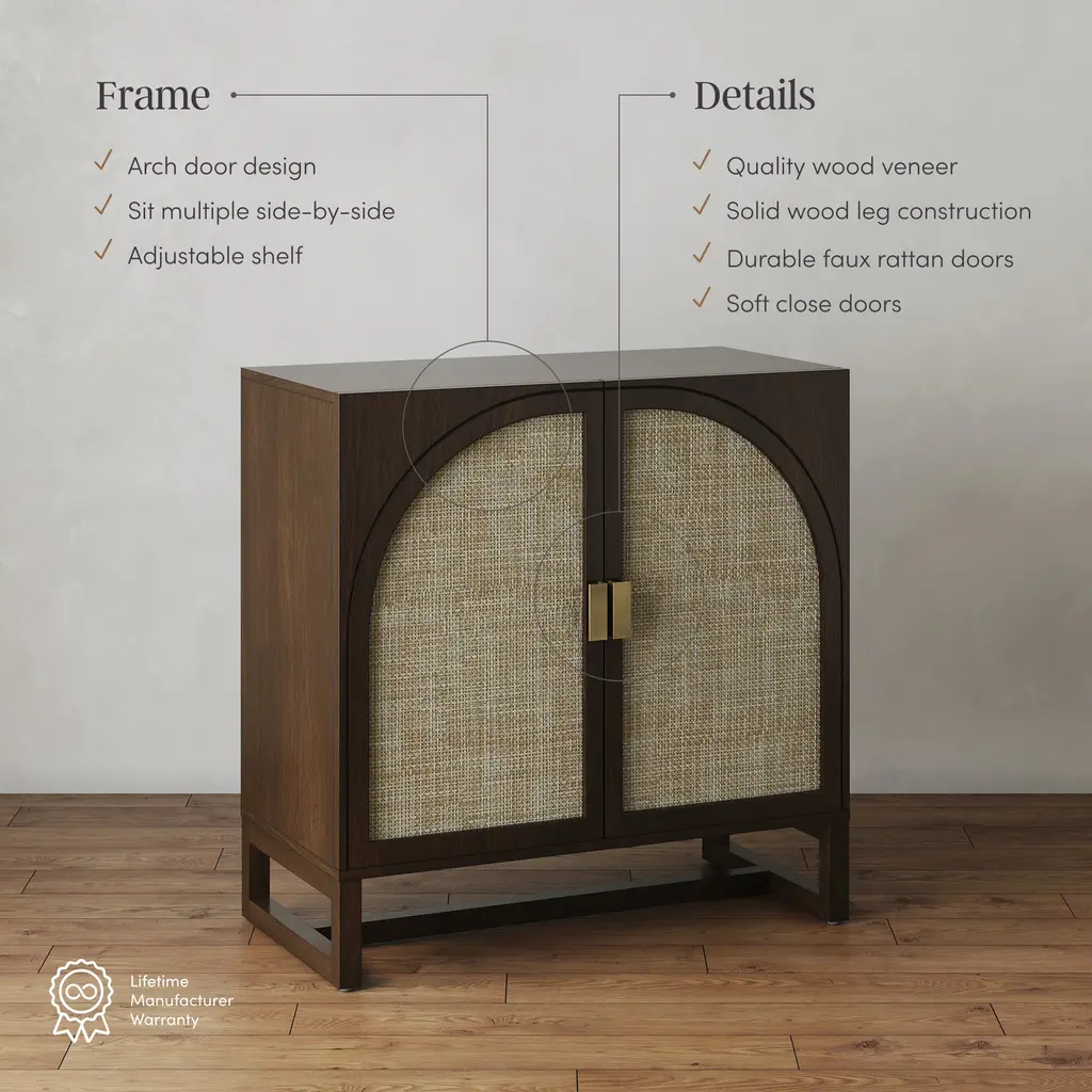 Create a seamless, high-impact storage solution with this set of Paxton Storage Cabinets. Finished in dark walnut with arched faux rattan doors and brushed brass accents, each unit blends mid-century warmth with practical versatility. Adjustable shelving inside makes them ideal for use as a bar cabinet, sideboard, or media console. Designed to sit flush in multiples, Paxton scales beautifully--whether you need two or a full wall of storage. Solid wood legs and leveling protectors offer lasting support.