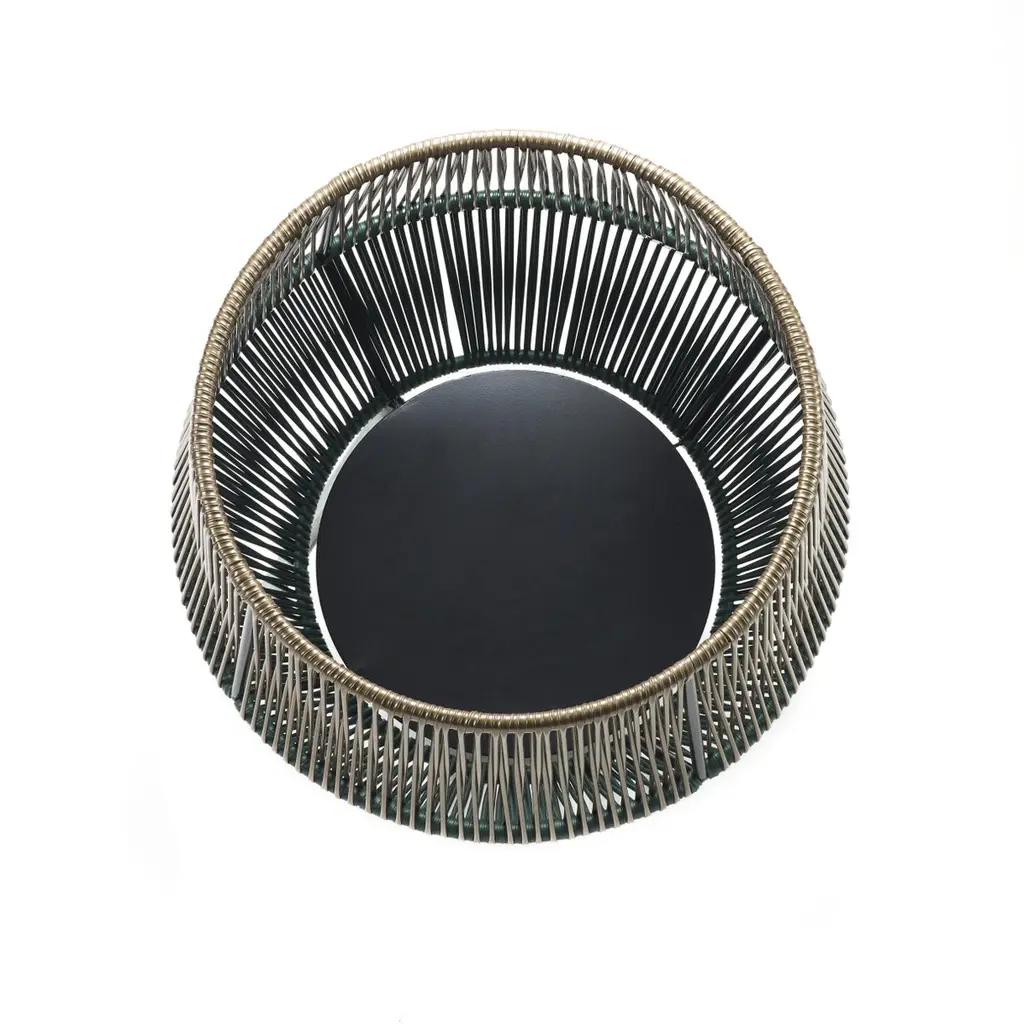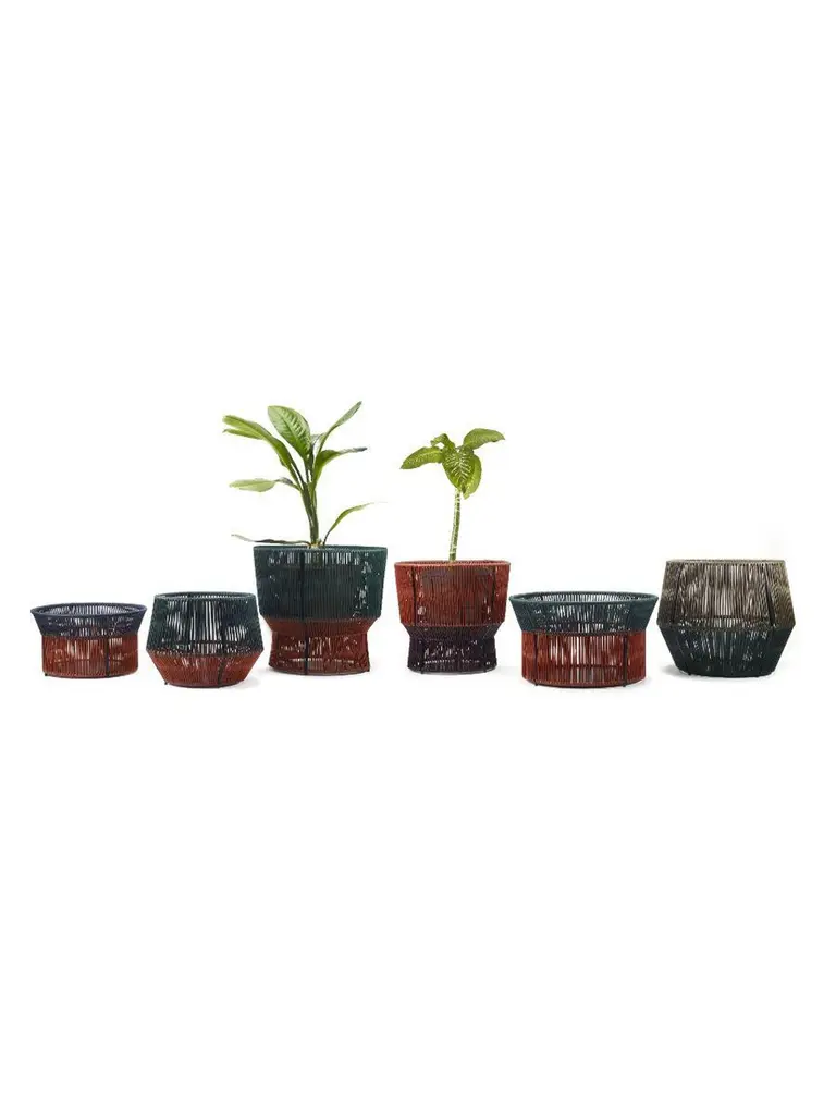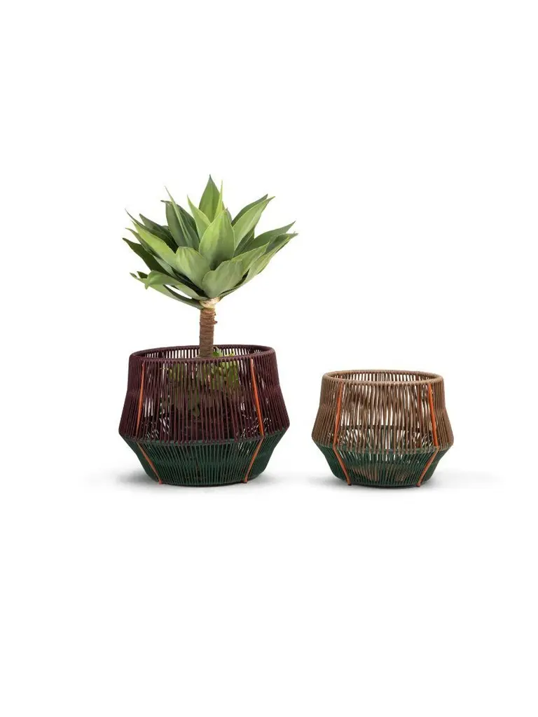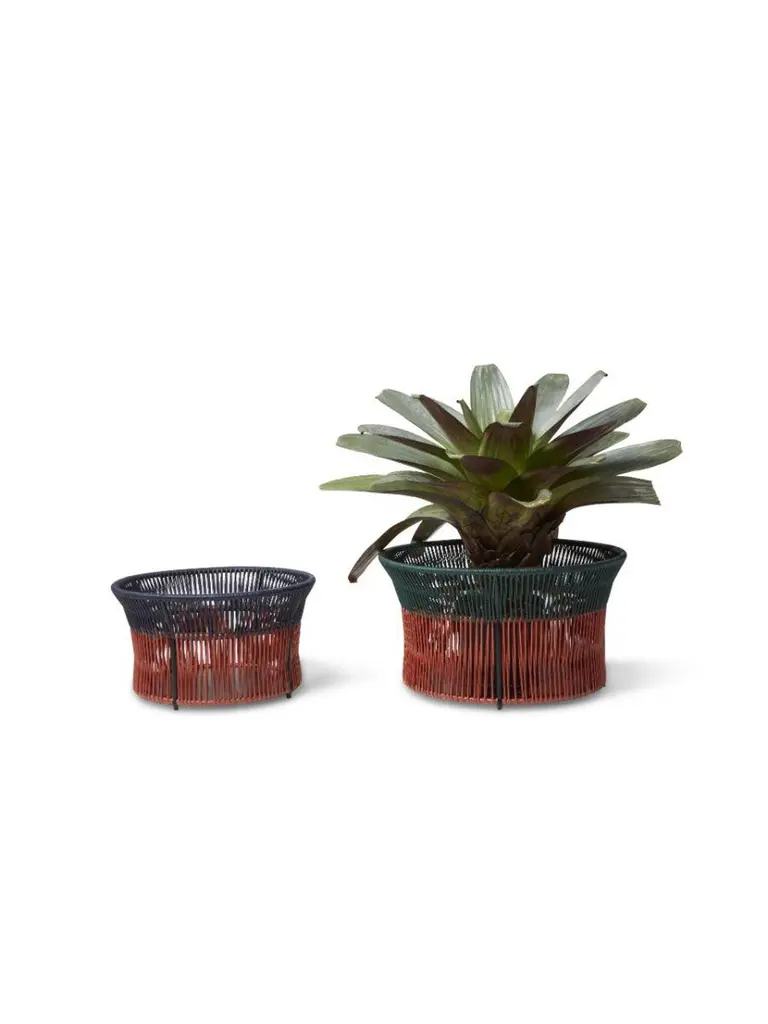 Large Caribe Chic basket 2 by Sebastian HerknerMaterials: Galvanized and powder-coated tubular steel. PVC strings are made from recycled plastic.Technique: Made from recycled plastic and weaved by local craftspeople in Colombia. Dimensions: W 56.2 x D 46 x H 47.8 cm Available in colors: terra/ green/ black, green/ cobre/ black, blue/ cobre/ black, violet/ green/ black, cobre/ violet/ black, terra/ green/ cobre, violet/ green/ cobre, green/ blue/ cobre. Also available in size Small and in more shapes.The Caribe Chic Basket is an elegant design by Sebastian Herkner and can be used indoors and outdoors as a storage unit or planter. It’s part of our Caribe Chic collection, featuring an intricate hand-woven webbing in contrasting earthy, muted shades. The pieces and colors are inspired by the incredible nature of the Colombian Huila region where the serene Tatacoa desert meets the powerful Rio Magdalena. The baskets are available in two sizes and three different shapes.Each basket is made in Santa Marta, a city on the Caribbean coast of Colombia, by local craftspeople. They weave the PVC strings, which are made from recycled plastic, around the powder-coated tubular steel frame. The weaving technique the artesanos and artesanas use are called Momposino, a traditional method known for intricate patterns. Just the preparation of all the materials takes ten days, while the production of one basket takes three days.German designer Sebastian Herkner is a long-term collaborator of Ames and has visited Colombia multiple times to experience the country’s cities, nature and people first hand. He also visited many of the ateliers that Ames has partnered with to learn about the unique traditional crafts of Colombia's regions. A sought-after contemporary designer and recipient of many industry awards, he has worked with many international design brands, creating intriguing pieces that showcase his intuition for interesting material, color, and texture combinations.