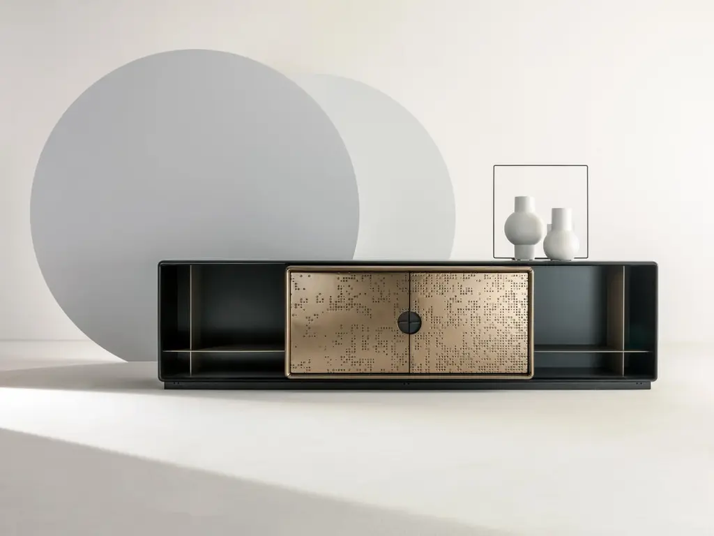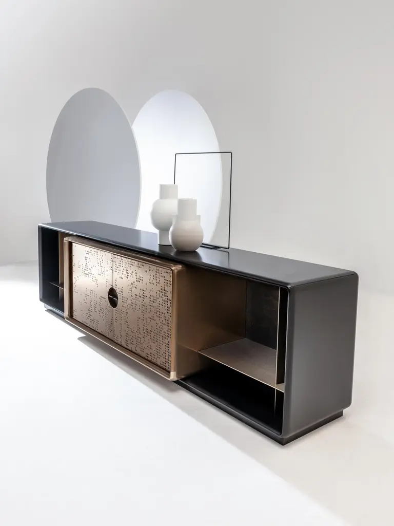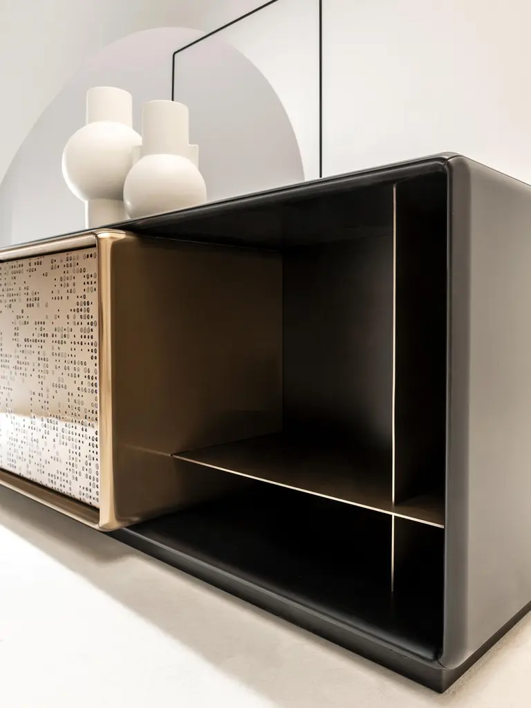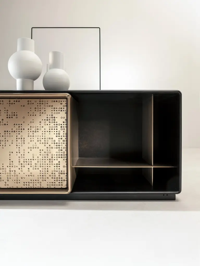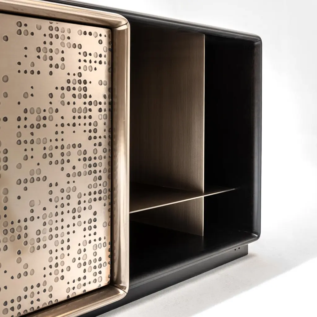 Low storage unit with 2 hinged doors and 2 lateral open compartments. Internally equipped with one shelf and one drawer. Structure in wood with Patina Bronzata Antica finish, central unit in liquid metal bronze with "Unlimited" texture. Handle in burnished brass. Interiors in wood painted Bronze Delabré.FINISH:Patina Bronzata Antica and Liquid Metal bronze "Unlimited"; int. Bronze DelabréTalento is a cabinet with a strong visual impact where craftsmanship and design come together in a wise balance of empty and full and an alternation of different depths and proportions.The rounded edges of the entire structure and the particular recessed handle represent a further detail highlighting the originality of the design. An architectural jewel designed and equipped to store objects.
