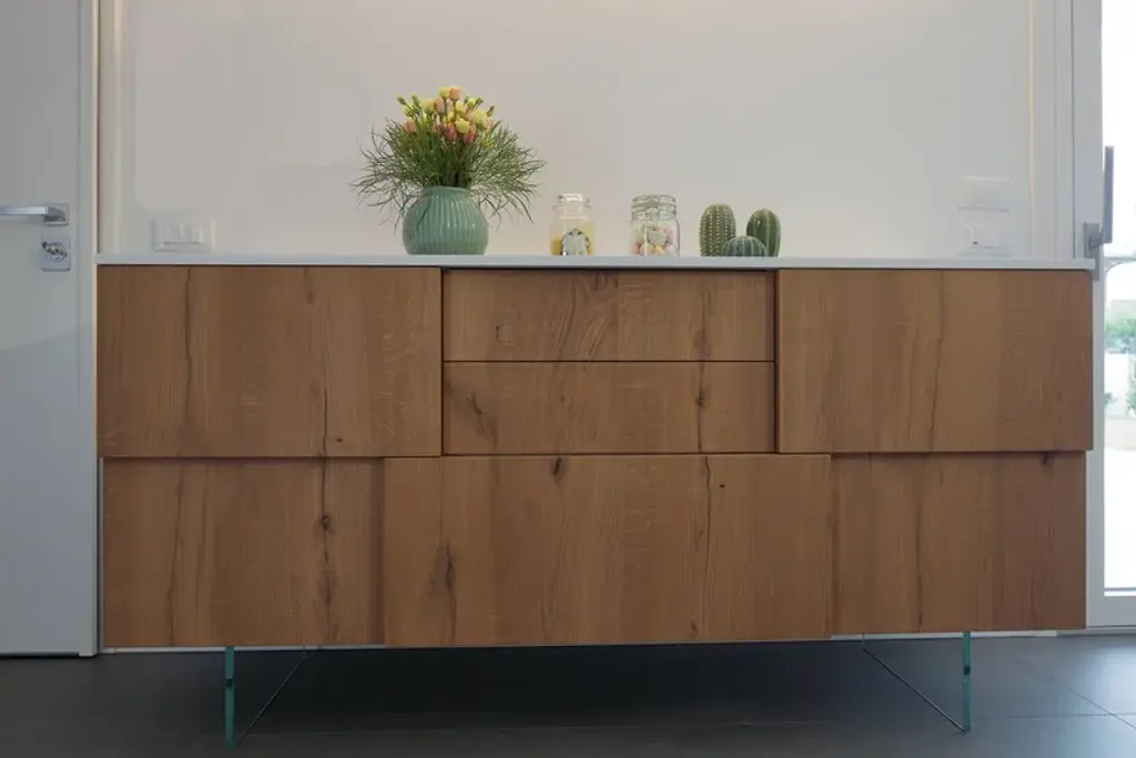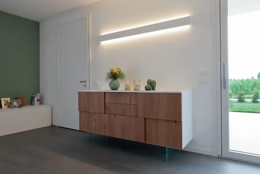 Deodara creates objects that simultaneously serve as display units and storage. Sideboards are essential elements in the living area. Lay also complements the living system with a wide range of storage units in different configurations, such as open compartments, drawers, hinged or flap doors. The versatility of the system is reflected in the variety of finishes, which give rise to objects with characteristics that are unique to each, based on the functionality of the spaces they are designed for and integrated into. For Lay, the internal fittings include shelves and drawers, as well as many optional accessories like cutlery trays, document or pen holders, depending on whether the sideboard serves the dining area or the study. Lay is distinguished by its depths and volumes that protrude and recess, creating a unique and unmistakable design. In this version, the sideboard has a lacquered white wood structure, solid oak drawer fronts, and two sheets of extra-clear glass that act as supports. All tall sideboards can be enhanced with LED lighting both under the base and inside the compartments.