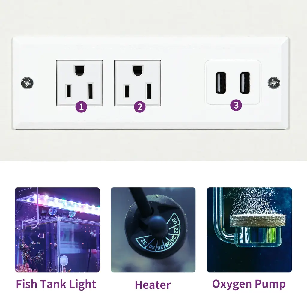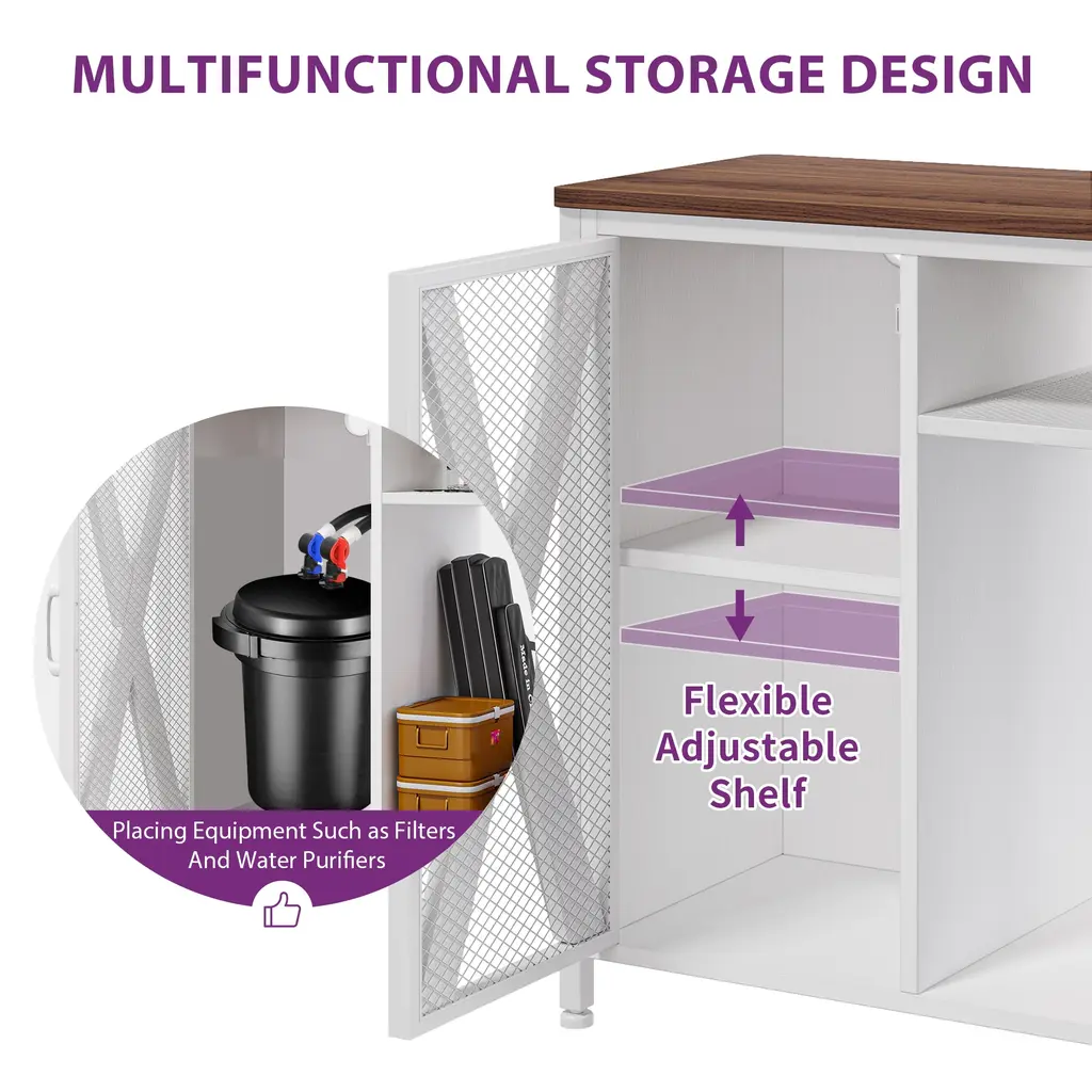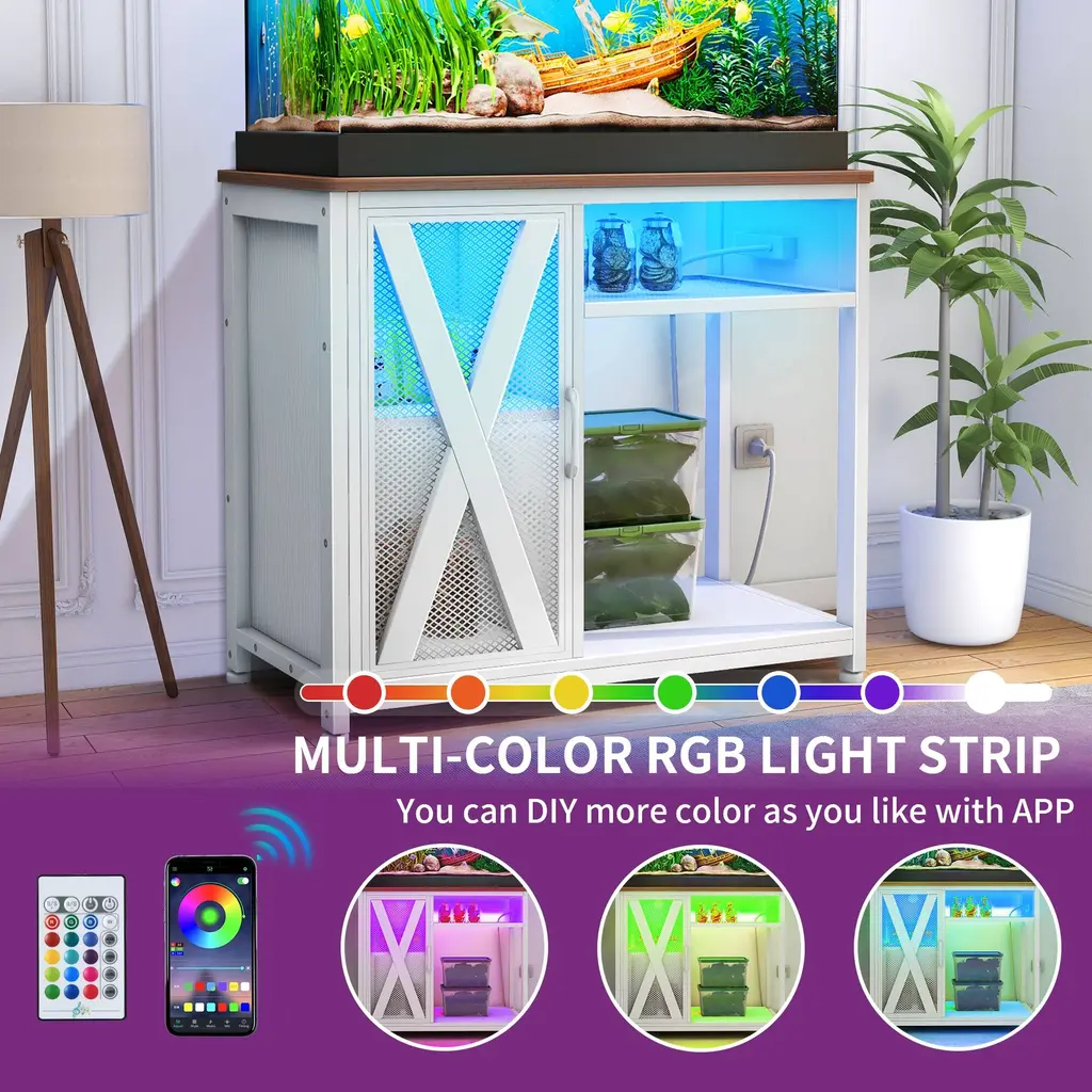 Discover our reliable and stylish Fish Tank Stand, the perfect blend of form and function. Available in two sizes and three colors, this stand boasts an anti-tip device for safety and a 2-in-1 design to accommodate both large and small tanks. The built-in cabinet and adjustable shelves provide ample storage for all your aquarium needs, while the integrated power outlet simplifies the setup of electronic devices. With a 7-color RGB light strip and a unique cross design on the doors, this stand not only organizes but also enhances the ambiance of your space. Plus, its versatility allows it to double as a kitchen buffet cabinet or storage unit for various uses. Features: Product Information: