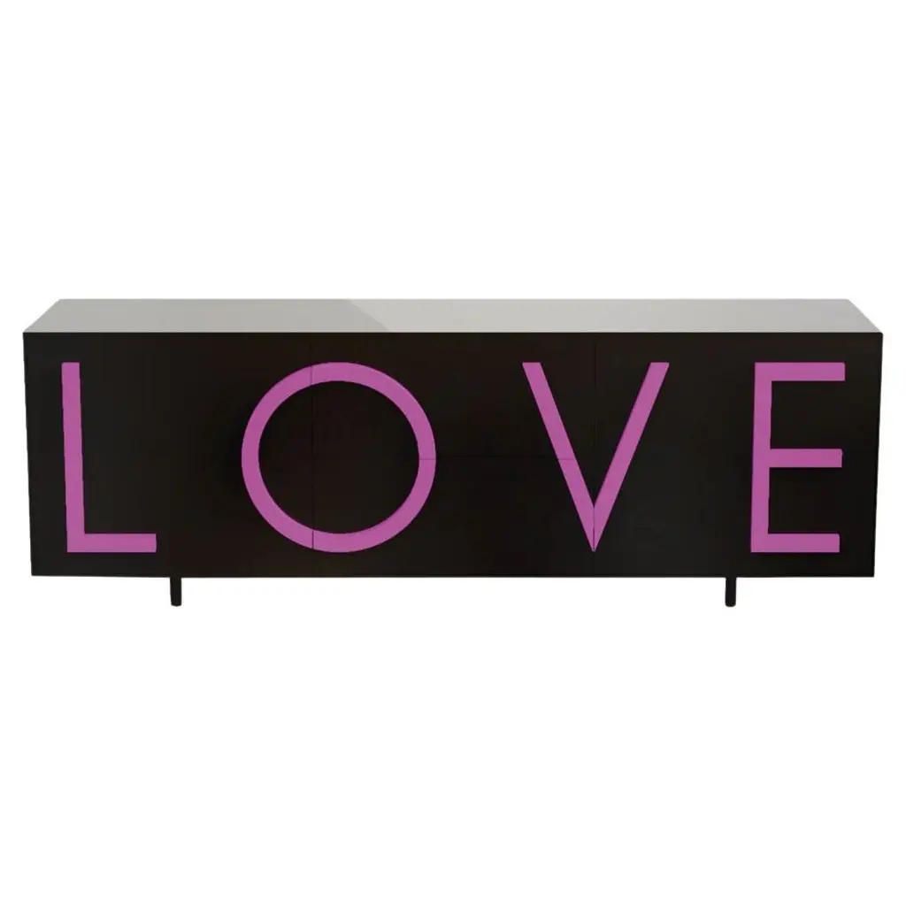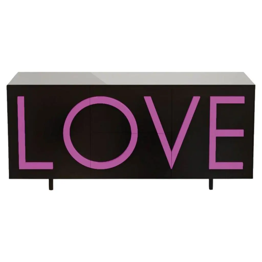 With its characterizing and intriguing shape, the LOVE cabinet is an expressive bill, a two-dimensional poster that speaks of love. The union between aesthetics and function makes the lines three-dimensional, extrudes the sheet that becomes a container and pulls letters out of the sheet generating handles, versatile elements, available in various colors.«Love is choosing oneself in a closed box, wrapped in an aura of mystery. Love is a faithful guardian of shared dreams, a container of possibilities» Fabio NovembreLOVE is a cabinet with two side hinged doors with a moveable internal shelf, with two central full-extension drawers. Structure made of MDF, lacquered both externally and internally. LOVE lettering in relief as a handle made of lacquered MDF, easily replaceable, thus personalising the storage unit. Adjustable cylindrical feet diameter 3.5 cm. and height 10 cm. in the same colour as the structure. Indoor use only.