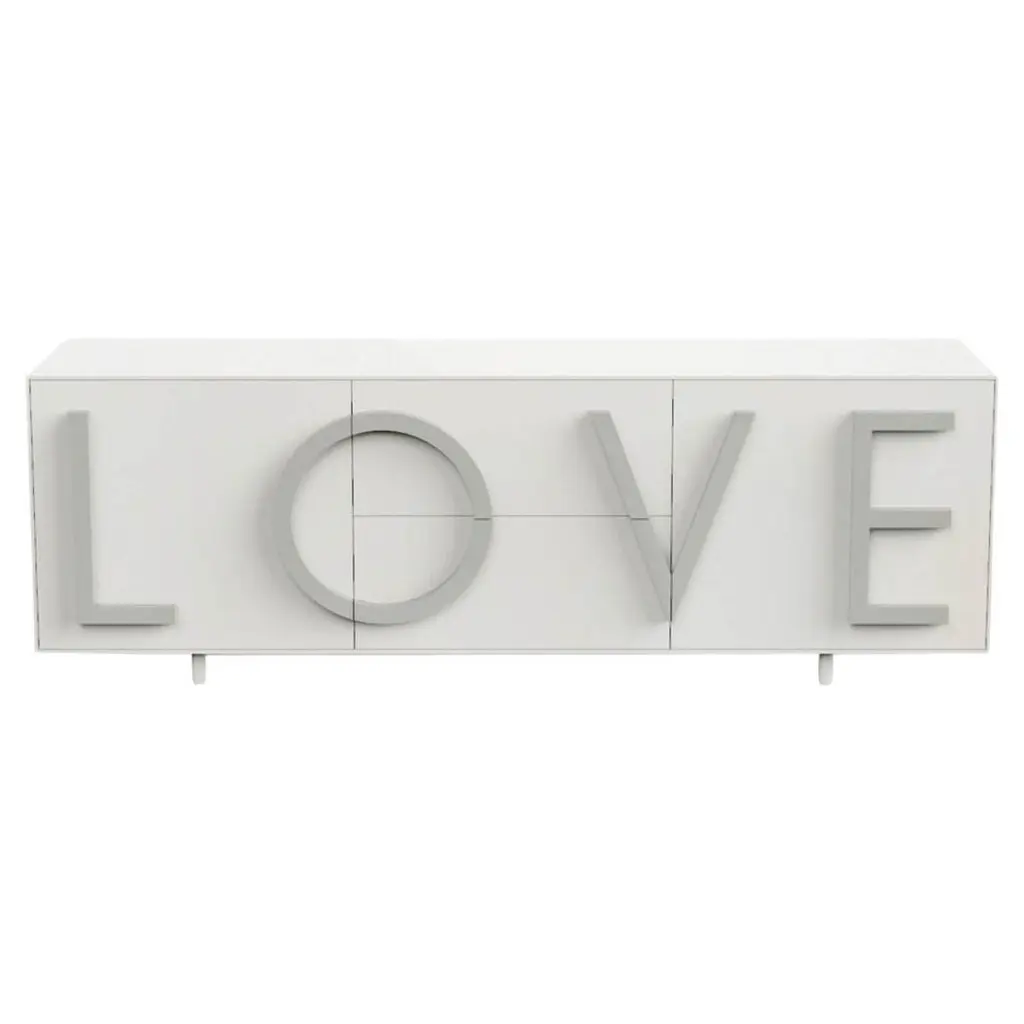 With its characterizing and intriguing shape, the LOVE cabinet is an expressive bill, a two-dimensional poster that speaks of love. The union between aesthetics and function makes the lines three-dimensional, extrudes the sheet that becomes a container and pulls letters out of the sheet generating handles, versatile elements, available in various colors.«Love is choosing oneself in a closed box, wrapped in an aura of mystery. Love is a faithful guardian of shared dreams, a container of possibilities» Fabio NovembreLOVE is a cabinet with two side hinged doors with a moveable internal shelf, with two central full-extension drawers. Structure made of MDF, lacquered both externally and internally. LOVE lettering in relief as a handle made of lacquered MDF, easily replaceable, thus personalising the storage unit. Adjustable cylindrical feet diameter 3.5 cm. and height 10 cm. in the same colour as the structure. Indoor use only.