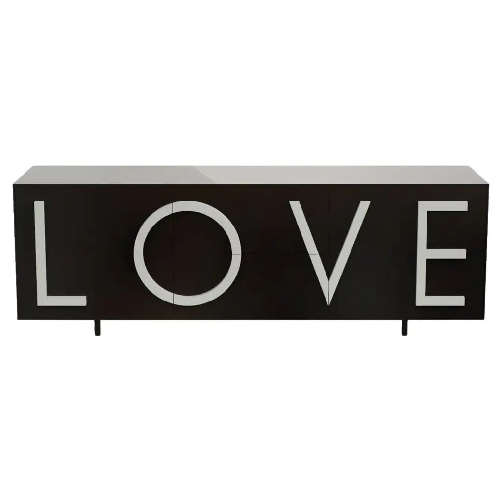 With its characterizing and intriguing shape, the LOVE cabinet is an expressive bill, a two-dimensional poster that speaks of love. The union between aesthetics and function makes the lines three-dimensional, extrudes the sheet that becomes a container and pulls letters out of the sheet generating handles, versatile elements, available in various colors.«Love is choosing oneself in a closed box, wrapped in an aura of mystery. Love is a faithful guardian of shared dreams, a container of possibilities» Fabio NovembreLOVE is a cabinet with two side hinged doors with a moveable internal shelf, with two central full-extension drawers. Structure made of MDF, lacquered both externally and internally. LOVE lettering in relief as a handle made of lacquered MDF, easily replaceable, thus personalising the storage unit. Adjustable cylindrical feet diameter 3.5 cm. and height 10 cm. in the same colour as the structure. Indoor use only.