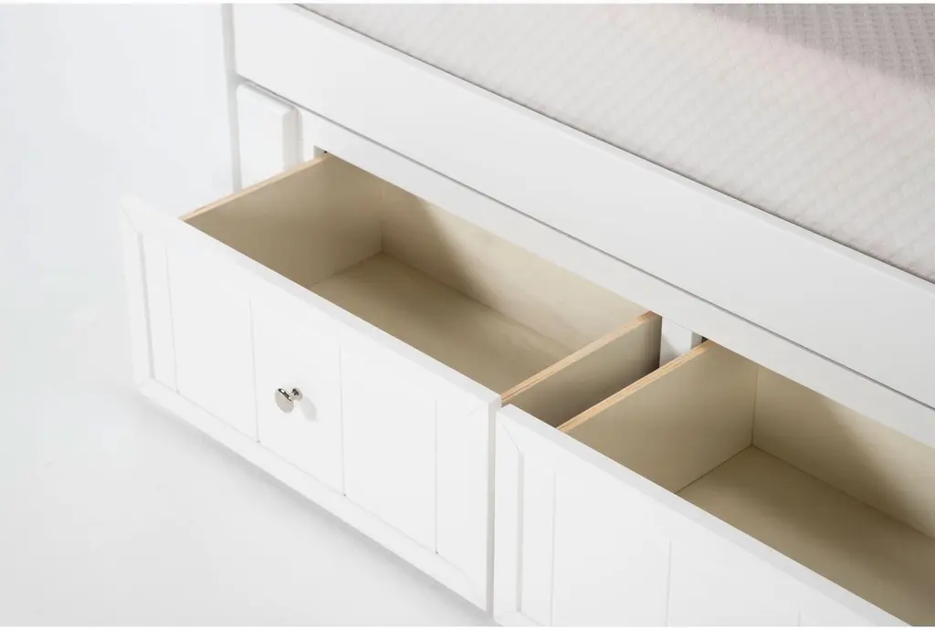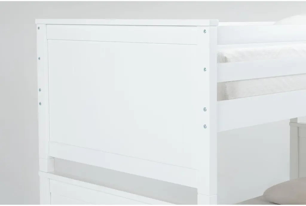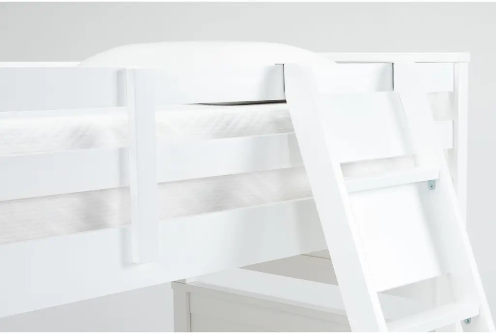 The Luca White Twin Over Twin Wood Bunk Bed with Ladder & 3-Drawer Storage Unit is a perfect addition to any kids' bedroom. This contemporary bunk bed is designed to maximize space while providing a stylish and functional sleeping solution. The solid pine and MDF construction ensures durability and stability for years to come.