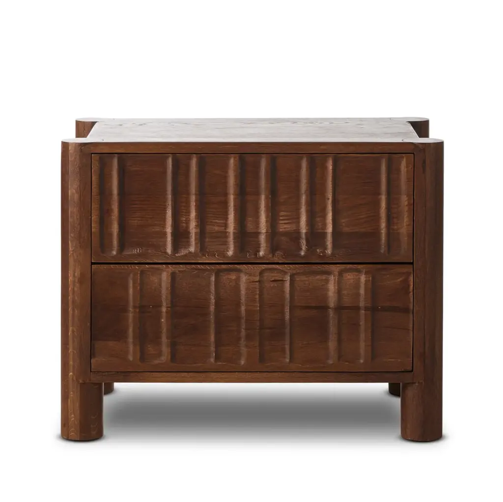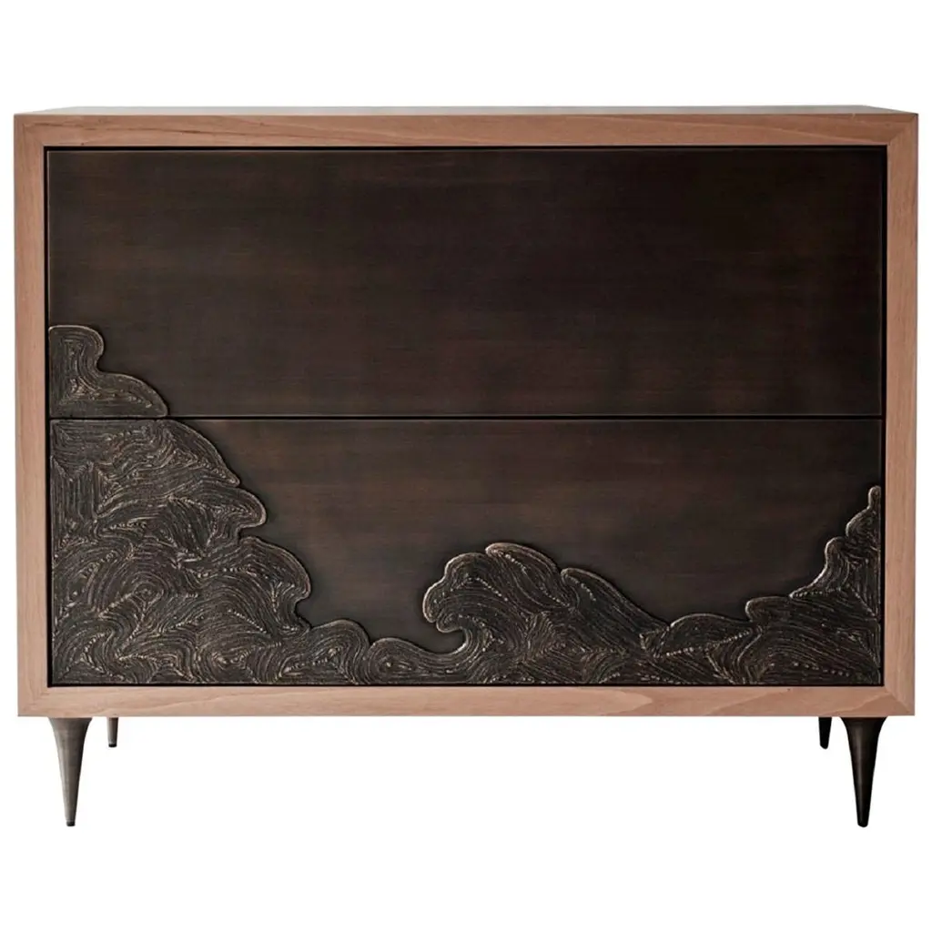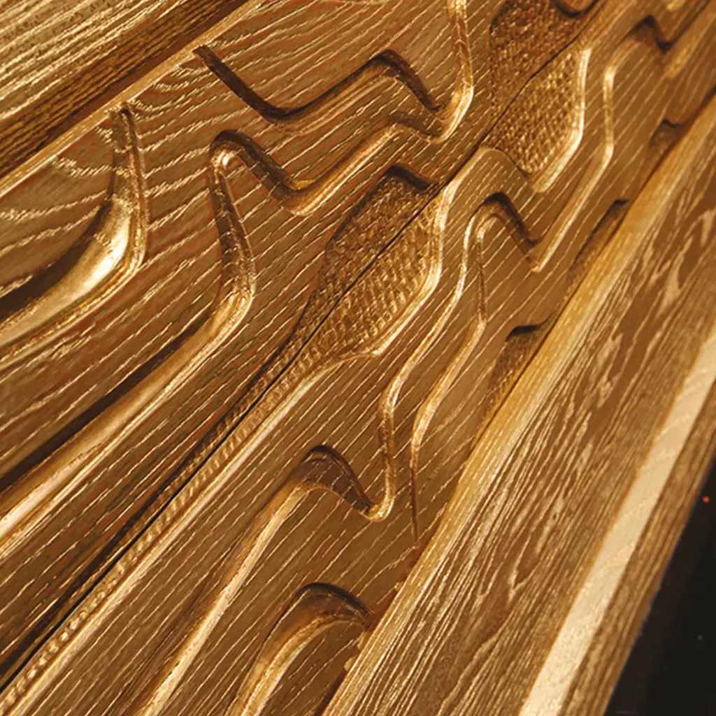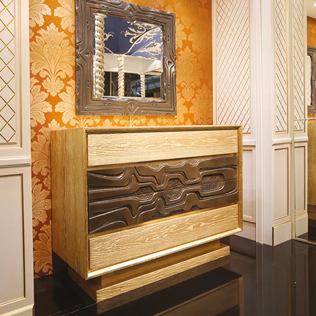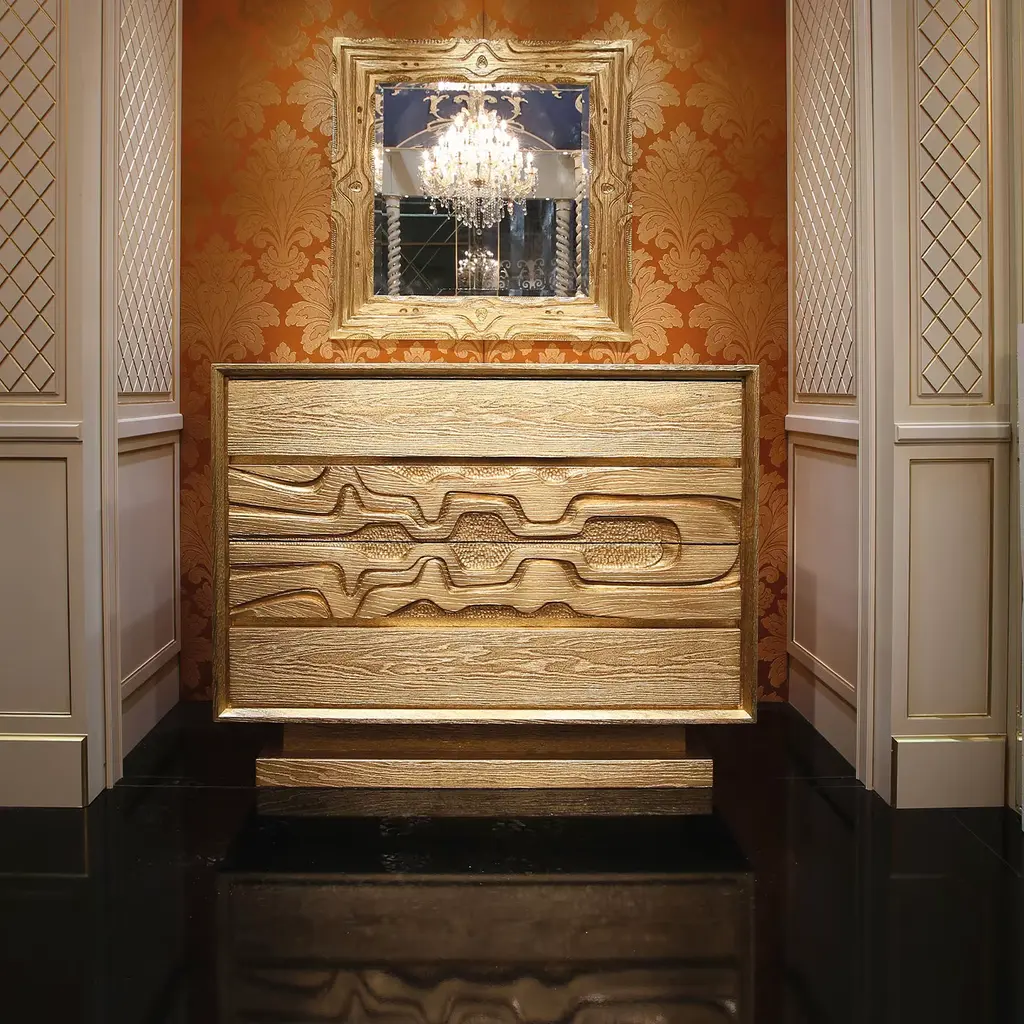 Rigorous wooden volumes made endlessly elegant by enveloping them with luminous, sand-blasted gold leaf mark the Art Deco-inspired design of this precious dresser crafted from intensely-grained oak. Seemingly suspended over a matching base, its storage unit is equipped with drawers minutely carved to obtain a sinuous and organic design that appears framed by the structure's sculpted edges. The front can also be painted with gold metallic paint upon request to the Concierge.