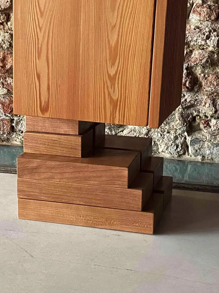 Maya Totem by Pietro Meccani for Meccani Design. Beautiful storage unit designed by Pietro Meccani in 1998 and re-proposed by Meccani Design in a limited edition of 20 pieces, all numbered and signed by the author. Made of solid European larch with parts in American cherry, measuring 30 x 30 x h 130 cm, it has one door and internal shelves. Symbolic, it is inspired by the Mayan Temples, the infinite steps recalled in the feet of the furniture, the vertical joints on the door. Signed by Maker,Labeled by Maker