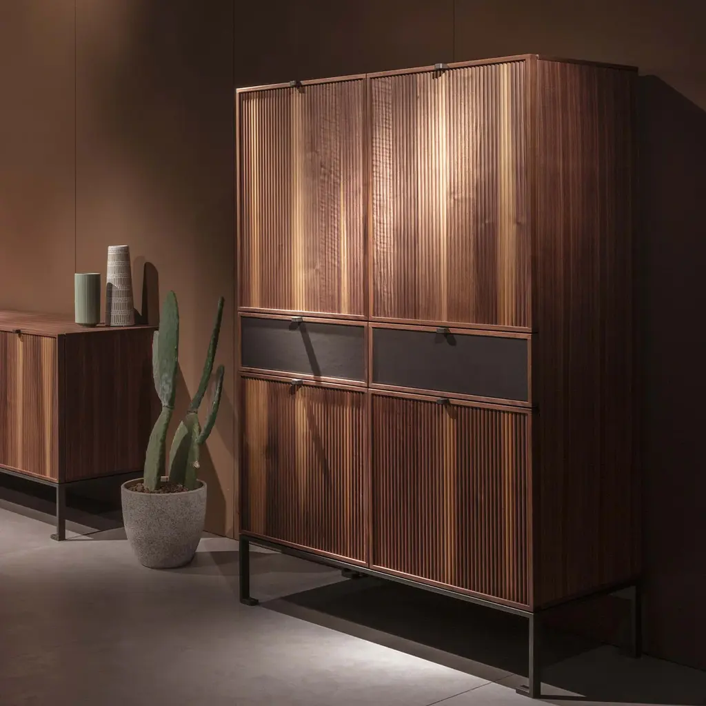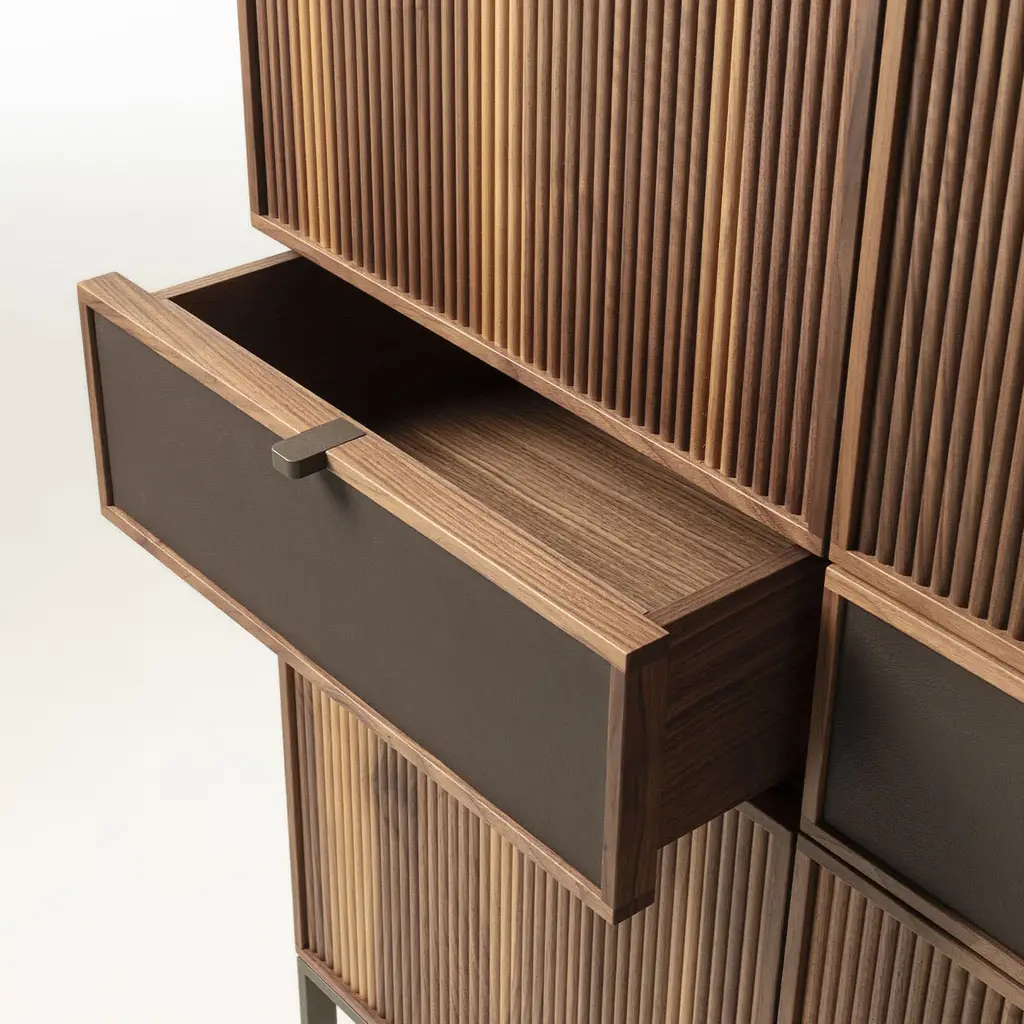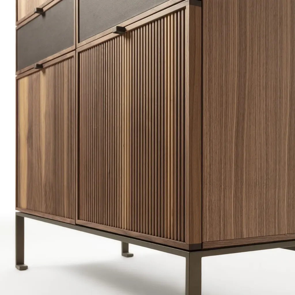 This exquisite storage unit, crafted from Canaletto walnut wood and supported by a sleek metal base, exemplifies refined craftsmanship and design. Featuring a wooden top, four fluted wood doors, and two leather-fronted drawers, every detail is designed to highlight artisanal excellence. It opens to reveal glass shelves and a mirrored back panel. Customizable in various wood options, this piece blends sophistication with functionality, making it a standout addition to any interior.