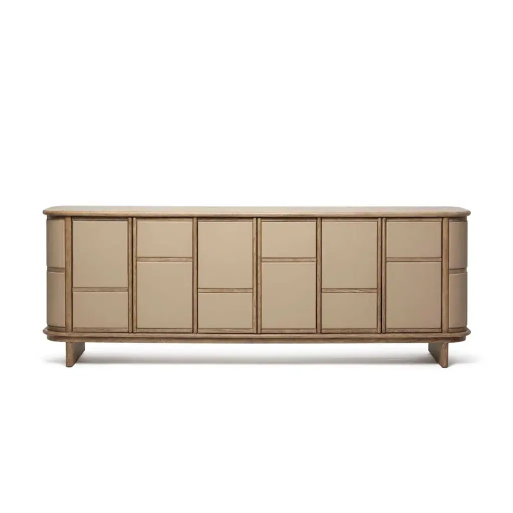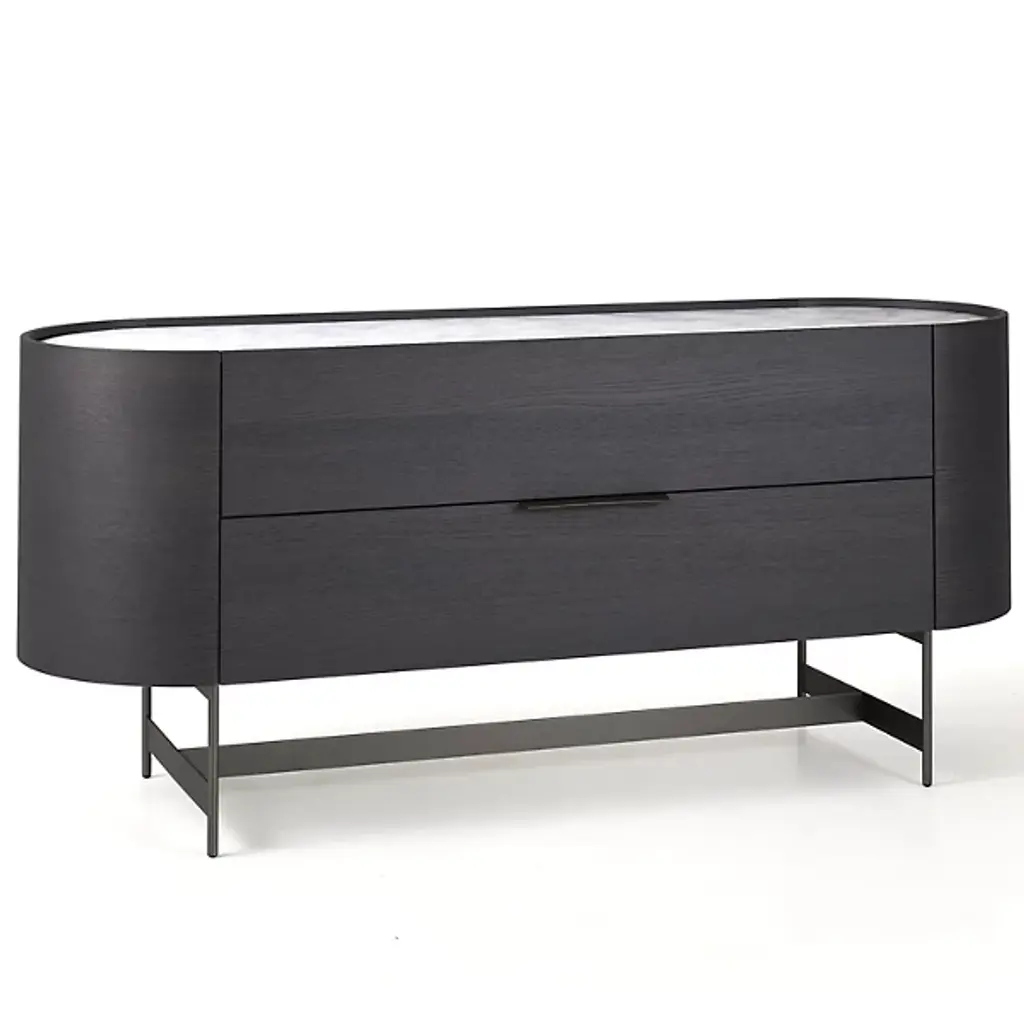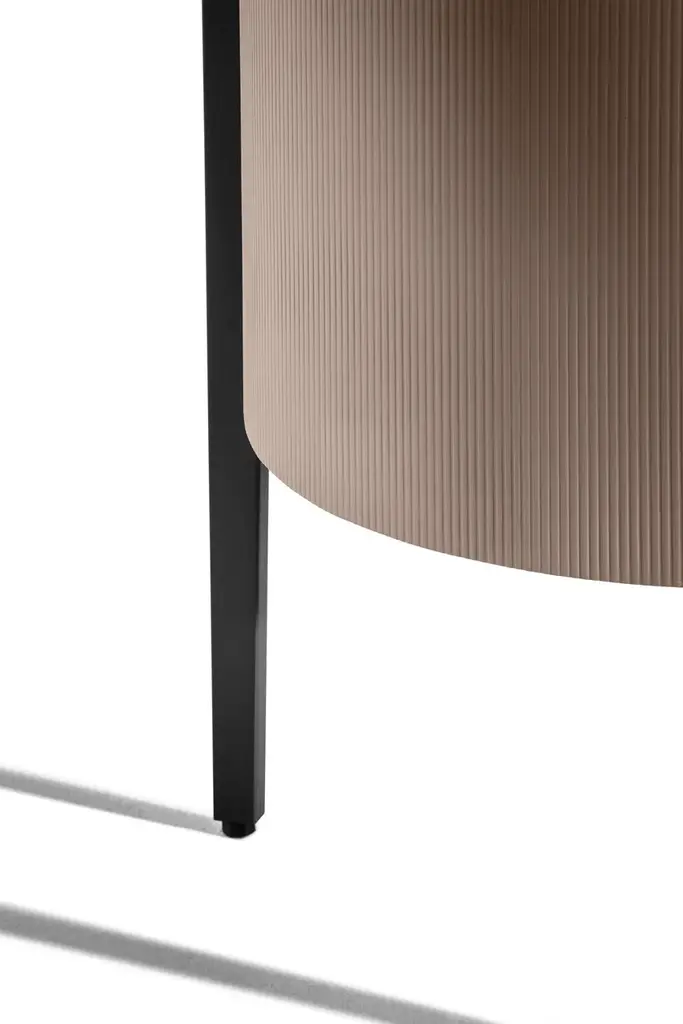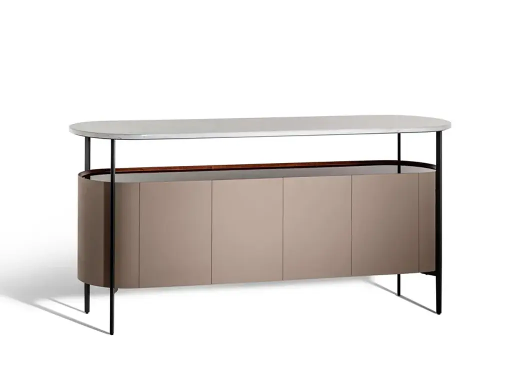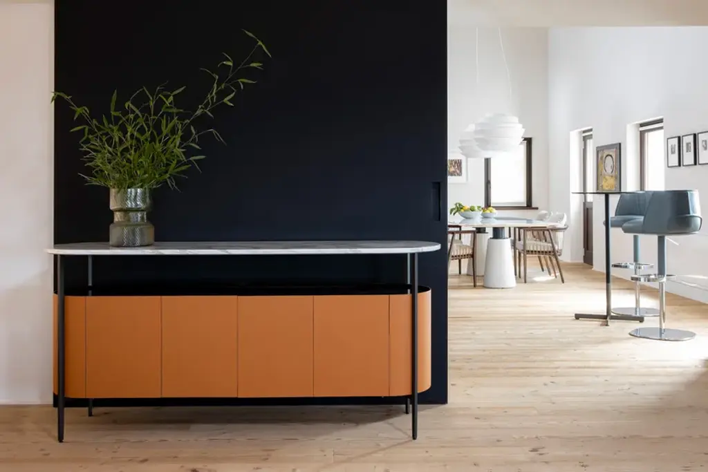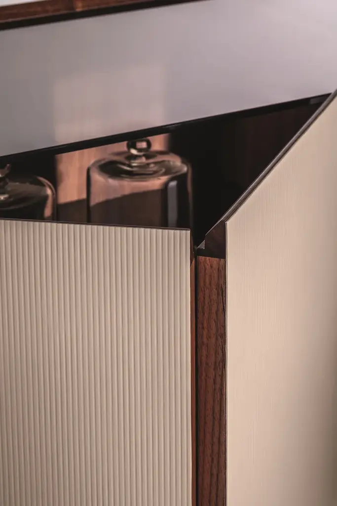 The Mi storage units designed by Neri & Hu for Poltrona Frau play around with light, shade and transparencies to conceal or reveal the objects they house.Mi is a Chinese pinyin word with a dual meaning used to express both the action of “looking” but also the word “secret”, which inspired this project. In fact, in the Mi storage units, rather than being displayed in full view the objects are hidden by the oblong external shell. You can only discover them by peeking through a layer of tempered glass which closes the space left by the shelves, raised and separated from the body of the unit.The external surface of the Mi storage units is upholstered in Saddle Extra leather, which is embellished with an original vertical striped canneté texture that gives the product a 3D effect. A thin but solid metal structure frames the body of the product and acts as a link with the raised top in Calacutta gold or Nero Marquinia marble.The Mi collection consists of three elements: a tall 2-door Mi cabinet, a low 4-door Mi cabinet with book opening, and a Mi trolley on wheels.The structure of the Mi storage units consists of a metal frame with burnished brushed steel finish which also acts as the base. The sides of the units consist of curved panels in poplar plywood while the bottoms and backs are made from birch plywood. To make them even lighter, the doors are made from honeycomb panels. The insides and bottom of the units are veneered in Canaletto walnut. The upper frame of the cabinet and the doors are made from solid Canaletto walnut. Both the two-door and the low four-door Mi cabinets contain shelves made of tempered glass with bronze finish while the top surface, also in tempered glass with bronze finish, offers a glimpse of the inside, like a display cabinet. The Mi High Cabinet has two doors which can be opened. Meanwhile, in the Mi Low Cabinet the 4 doors can be opened two by two like a book. Magnets maintain the doors securely shut. The structure has adjustable feet. The frame of the Mi trolley is fitted with 4 black plastic and steel swivel castors. In the upper part of the trolley the frame finishes with a tube in burnished brushed steel which follows the shape of the product and acts as a handle. One side of the grip is covered with Cuoio Saddle Extra leather matching the upholstery of the trolley, with hand stitching. The internal space is fitted with a tempered glass shelf which can be set at 3 different heights. The top is raised from the wooden body and can be made from Calacatta gold marble or Nero Marquinia marble. Both are available with a glossy finish to which a transparent polyester paint is applied to increase its surface resistance, or a semi-glossy finish for a more natural result.The exterior of the Mi storage units is upholstered in Saddle Extra leather printed with a canneté texture. There are four possible colours: Carbone, Cammello, Polvere and Corda.