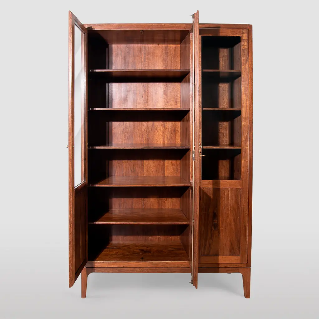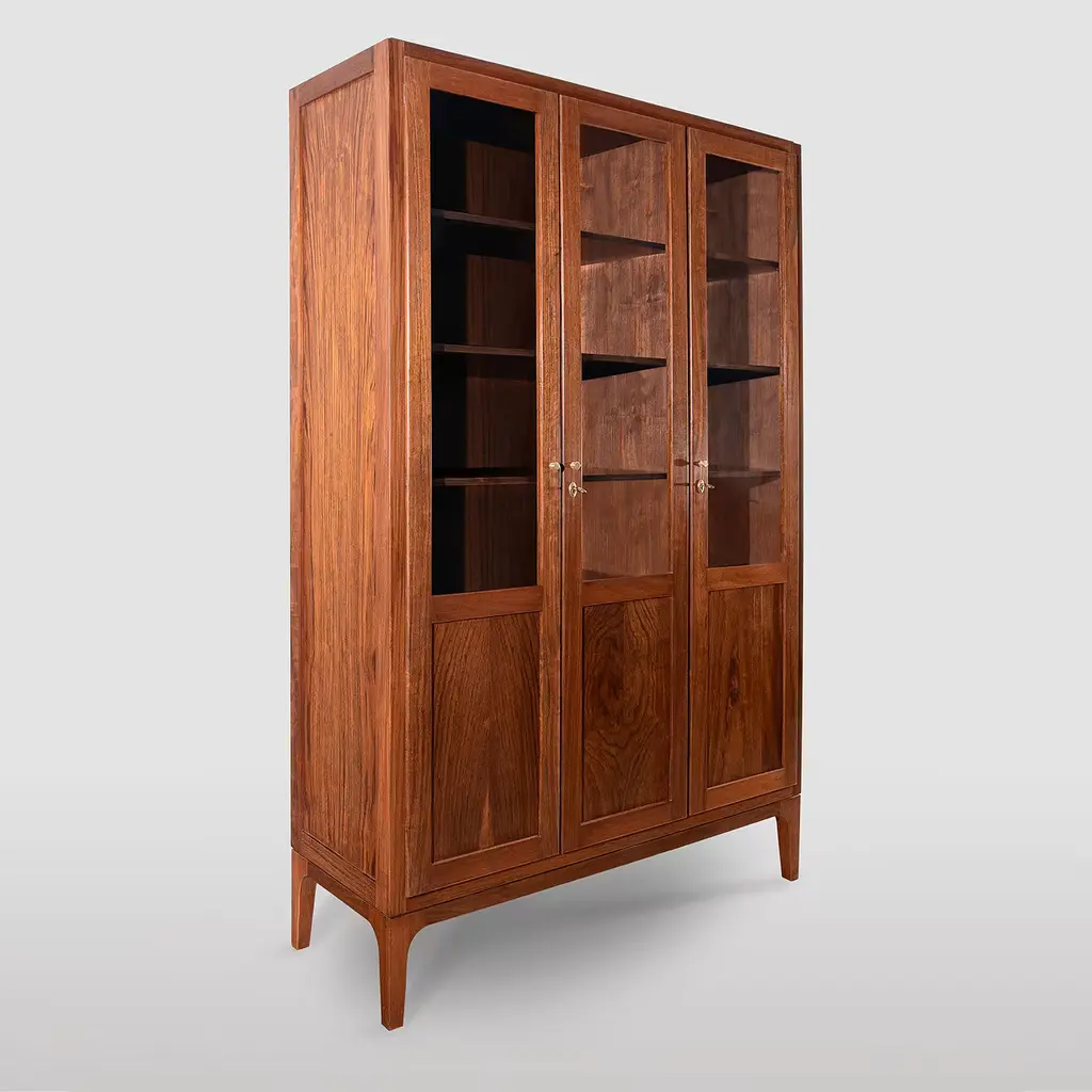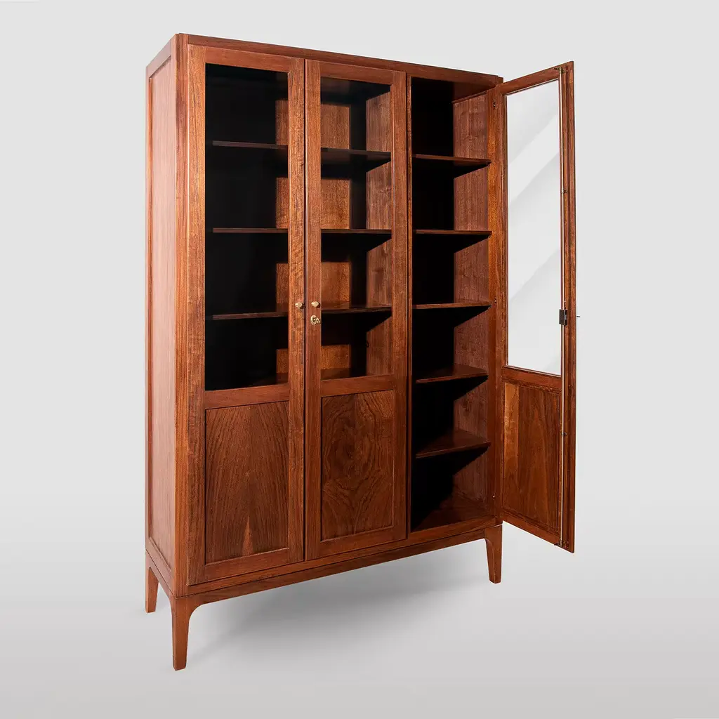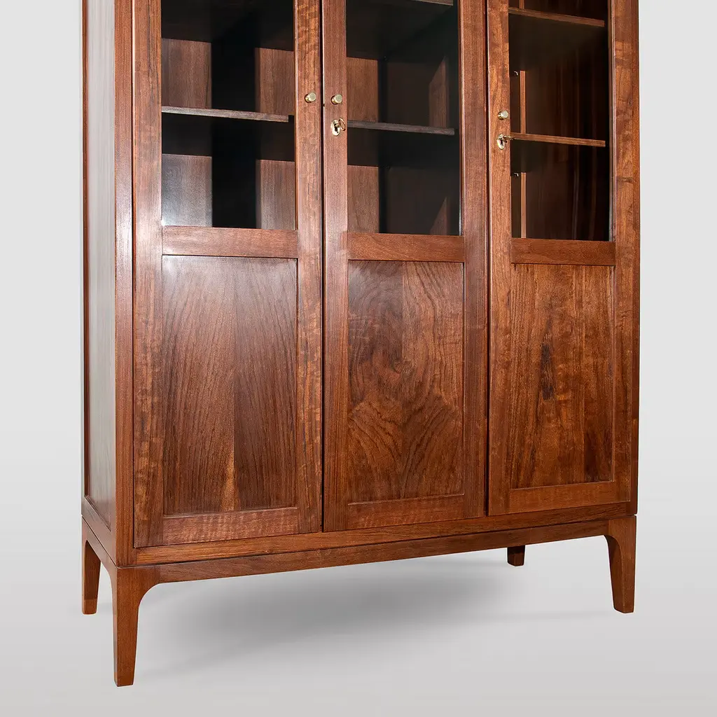 Handcrafted of solid Daniela walnut, this remarkable bookcase is the epitome of artisan cabinetry. The linear silhouette and minimal details allow the rich wood grain to take center stage. Equipped with ten shelves and an inner divider, the storage unit is closed by three glass doors with metal knobs and double-anchor closures. The piece is stained with nontoxic products and hand-finished with beeswax. Fully customizable upon request. Assembly required, instructions included.