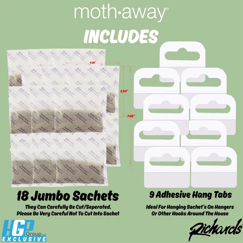 Get rid of moths without having to smell those hardcore scents that give you headaches! Moth Away is 100% Non Toxic as its made of an All Natural Herbal Formula! Use Moth Away in all types of enclosed storage units where you store your clothes, such as: Drawers, Garment Bags, Storage Chests, Linen Closets, Blanket Bags, Wardrobes, & More! Moth Away is not deisgned for use in open air spaces such as Shelves and Closets. Directions for use: Apply Moth Away at the rate of 4 grams per cubic foot of storage space. Two of the enclosed sachets of 2 grams is good for a container of 1 cubic foot. Before storing for the first time, always dry clean articles to ensure there are no moth larva present in the fibers. An occasional squeeze of the sachet will renew the fresh minty scent. Moth Away should be replaced every few monthsm, or once the herbal aroma weakens. Disposal: When sachets are finished, place in a plastic bag and dispose of in trash can. Keep out of reach of children.