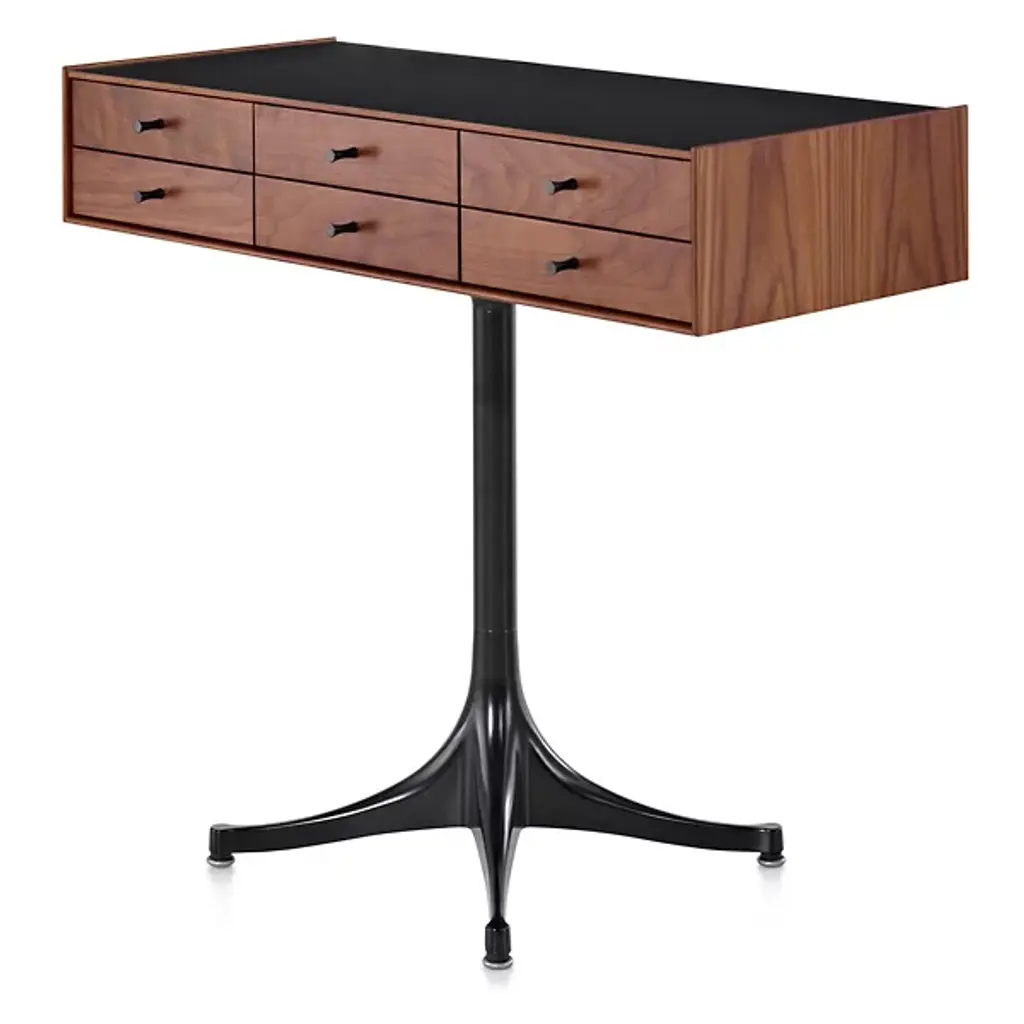 Beautiful and symmetrical. The Nelson 6-Drawer Miniature Chest with Base from Herman Miller offers both function and beauty to any room you put it in. It is made from solid wood and features hand-fitted drawers, providing the kind of quality craftsmanship designer George Nelson is known for. The drawers can be arranged either vertically or horizontally in two rows of three, and you can use it without the pedestal if you so desire. The smooth glides—made of brass for added protection—offer easy use, and each one comes with a small jewelry drawer and dividers to keep small items organized. The design was inspired by Japanese mobile storage units, known as tansu. Nelson has been fascinated by Japan and Japanese culture since his first trip to Tokyo in 1951, and he intended these drawers to embody what he loved most about Japanese design: “a sense of fitness in the relationship between, hand, material, and shape.”