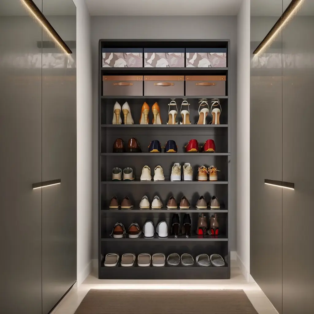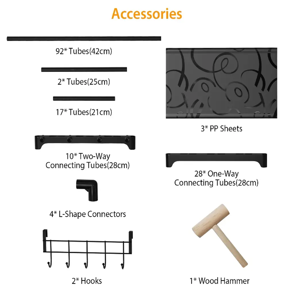 Organize your shoes and accessories with this versatile 9-Tier 3-Row Metal Shoe Rack. Measuring 49.6 x 62.2 x 10.8 inches, this spacious storage unit offers ample space to store up to 50 pairs of shoes, including boots, high heels, and slippers. The unique 3-row design features 9 tiers, with two side rows and a middle row, providing plenty of room for your entire shoe collection. This rack also includes two hooks, perfect for hanging bags, ties, keys, purses, scarves, belts, and other accessories. Additionally, three PP sheets are included to place on the top, offering extra storage for small items like books, toys, or hats. Key Features: Expandable & Dividable: The 9-tier rack can be easily divided into smaller units to suit your needs. Whether it's used for shoes, books, toys, or more, this rack is perfect for any space, from entryways and closets to dorm rooms and garages. Durable & Stable: Constructed with high-quality iron tubes and plastic connectors, this shoe rack is both sturdy and long-lasting. It can hold up to 55lbs, providing strong support for all your items. Space-Saving: Keep your home neat and tidy by organizing shoes and accessories in one convenient place. This rack maximizes your storage space and helps reduce clutter in any room. Easy Assembly: This shoe rack comes with all the necessary components, including tubes, connectors, hooks, PP sheets, and a wooden hammer. A user manual is included for quick and easy assembly. Specifications: Brand: NewHome Material: Iron, Plastic, PP Weight Capacity: 55lbs (25kg) Dimensions: 49.6 x 62.2 x 10.8 inches (L x H x W) Weight: 8.49lbs (3.85kg) Package Size: 23.62 x 15.35 x 4.33 inches (60 x 39 x 11 cm) Package Weight: 9.15lbs (4.15kg) Package Includes: 1 x 9-Tier Shoe Rack 3 x PP Sheets 2 x Hooks 1 x Wood Hammer 1 x User Manual