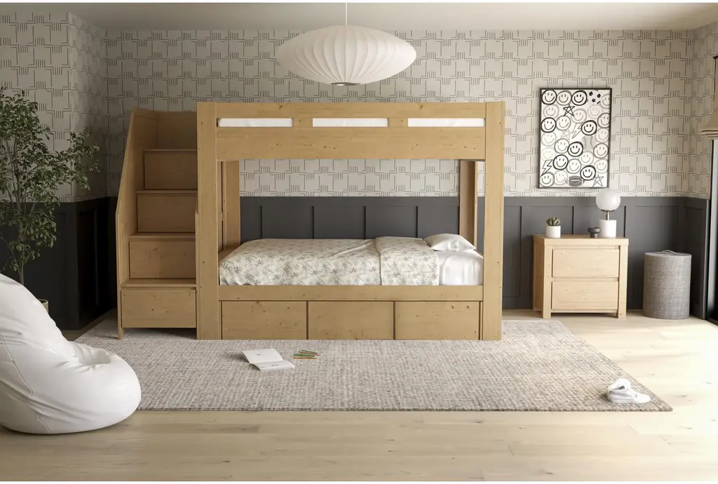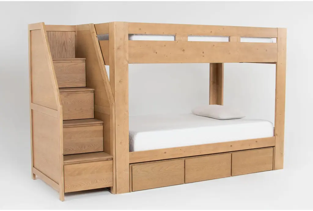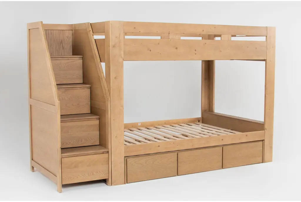 The Nora Natural Wood Full Over Full Bunk Bed with Stairway Chest & 3-Drawer Storage Unit is perfect for maximizing space in any kids' room. Constructed from oak veneers and solid pine, this bunk bed offers both durability and functionality. Featuring a stairway chest and additional storage drawers, it provides ample space for organizing belongings.