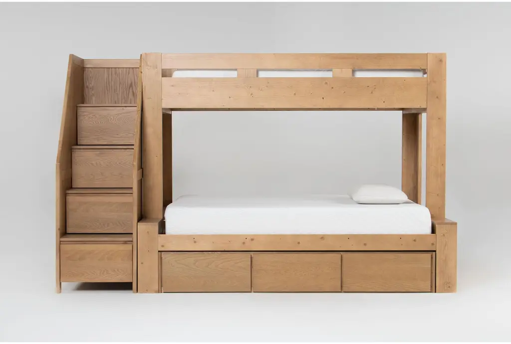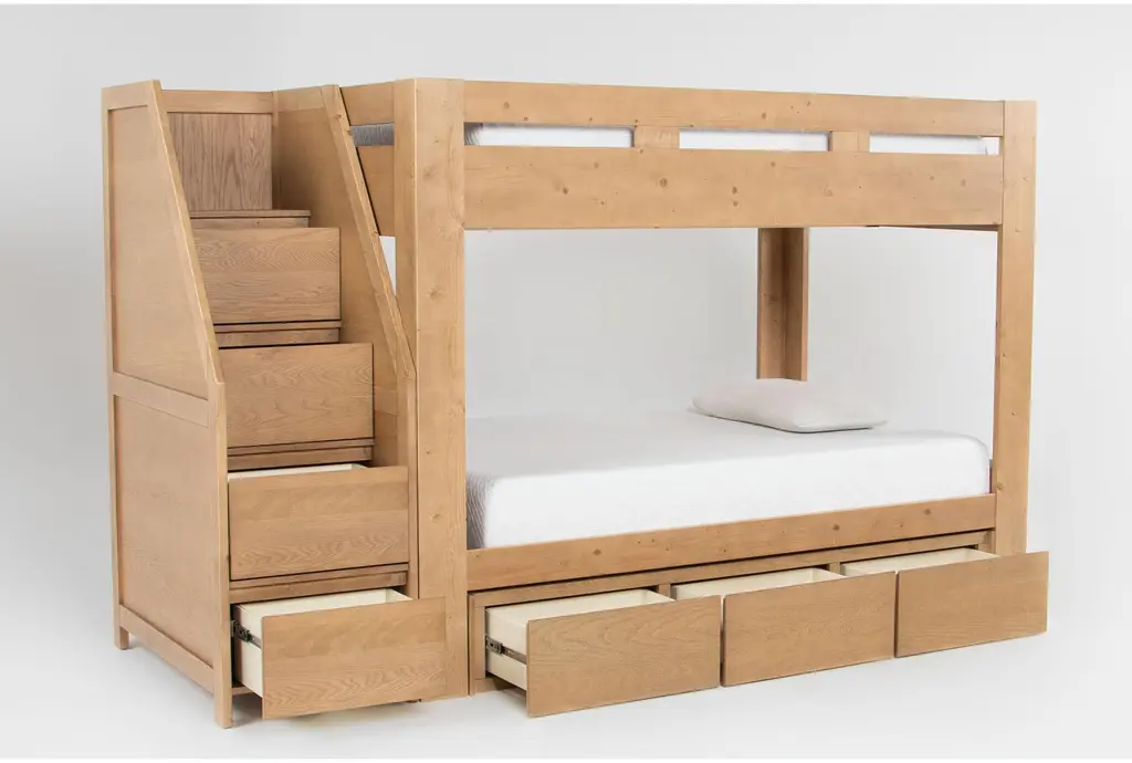 Nora Natural Wood Full Over Full Bunk Bed With Stairway Chest & 3-Drawer Storage Unit