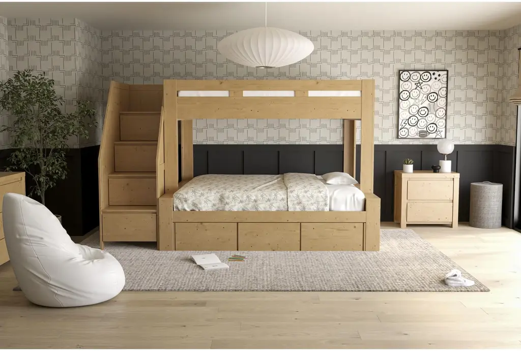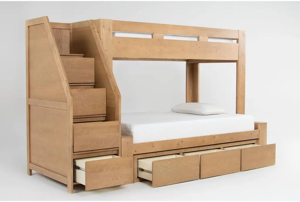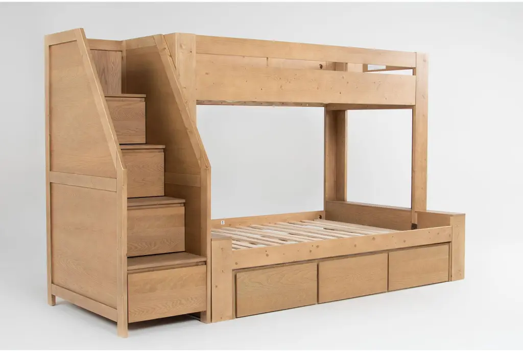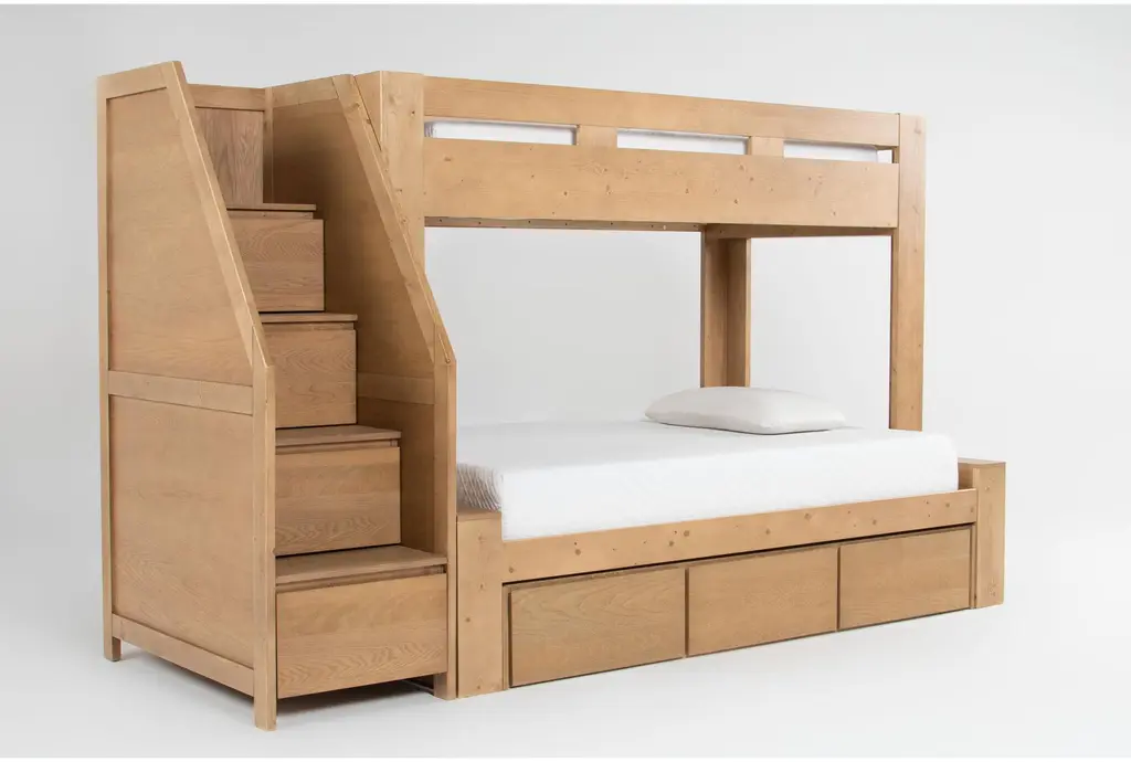 Nora Natural Wood Twin Over Full Bunk Bed With Stairway Chest & 3-Drawer Storage Unit