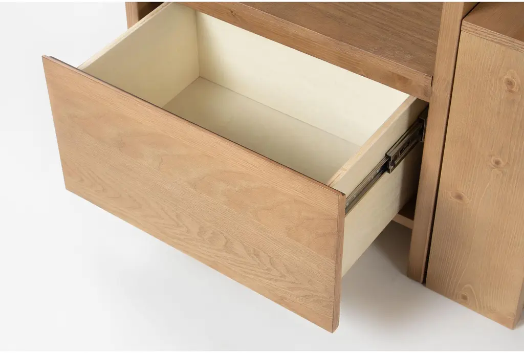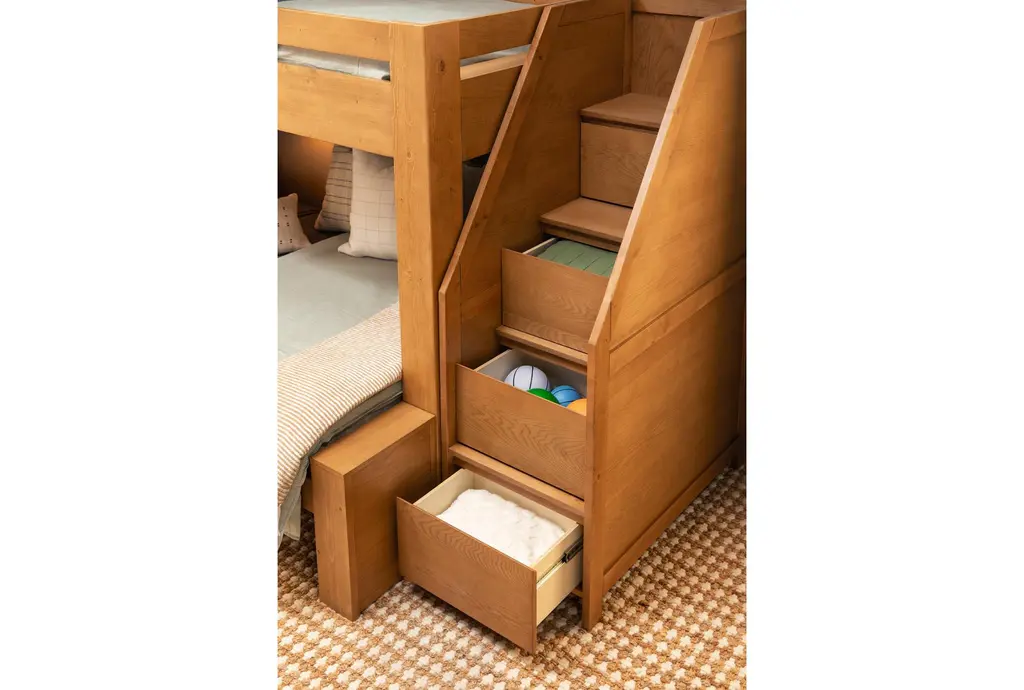 Designed to meet the needs of your family, our Nora bedroom collection invites you to create a space where your kids can relax, learn, play and grow. Each piece is constructed to ensure the utmost safety and durability with solid pine and cathedral oak veneers. Versatile, functional and streamlined, they boast features like drawers with dovetail joinery and full extension ball-bearing glides for smooth operation. With multiple finishes and items to choose from, you can get everything you need. A switchable stairway chest can be used on either side of the bed.
