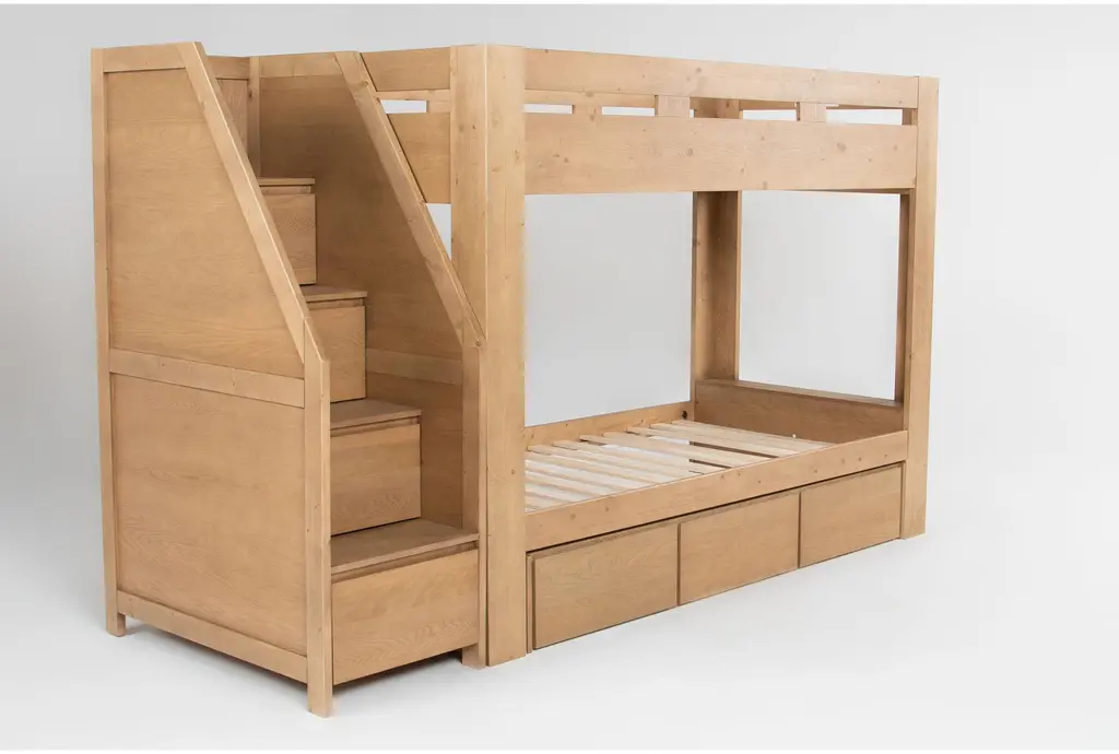 The Nora Natural Wood Twin Over Twin Bunk Bed with Stairway Chest & 3-Drawer Storage Unit is a perfect addition to any kids' room. Designed in a casual style, this bunk bed offers both functionality and aesthetic appeal. The natural wood finish and sturdy construction ensure durability and a timeless look.