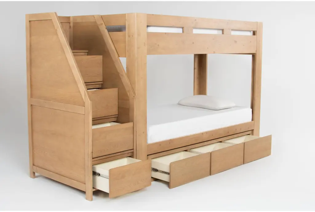 Nora Natural Wood Twin Over Twin Bunk Bed With Stairway Chest & 3-Drawer Storage Unit