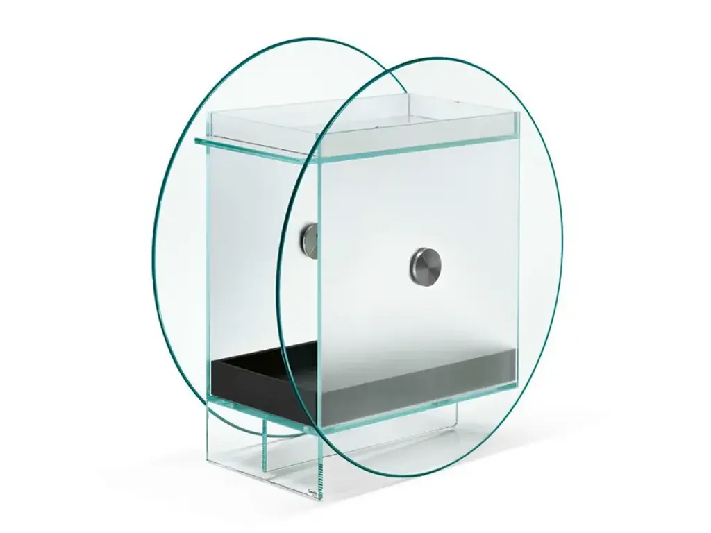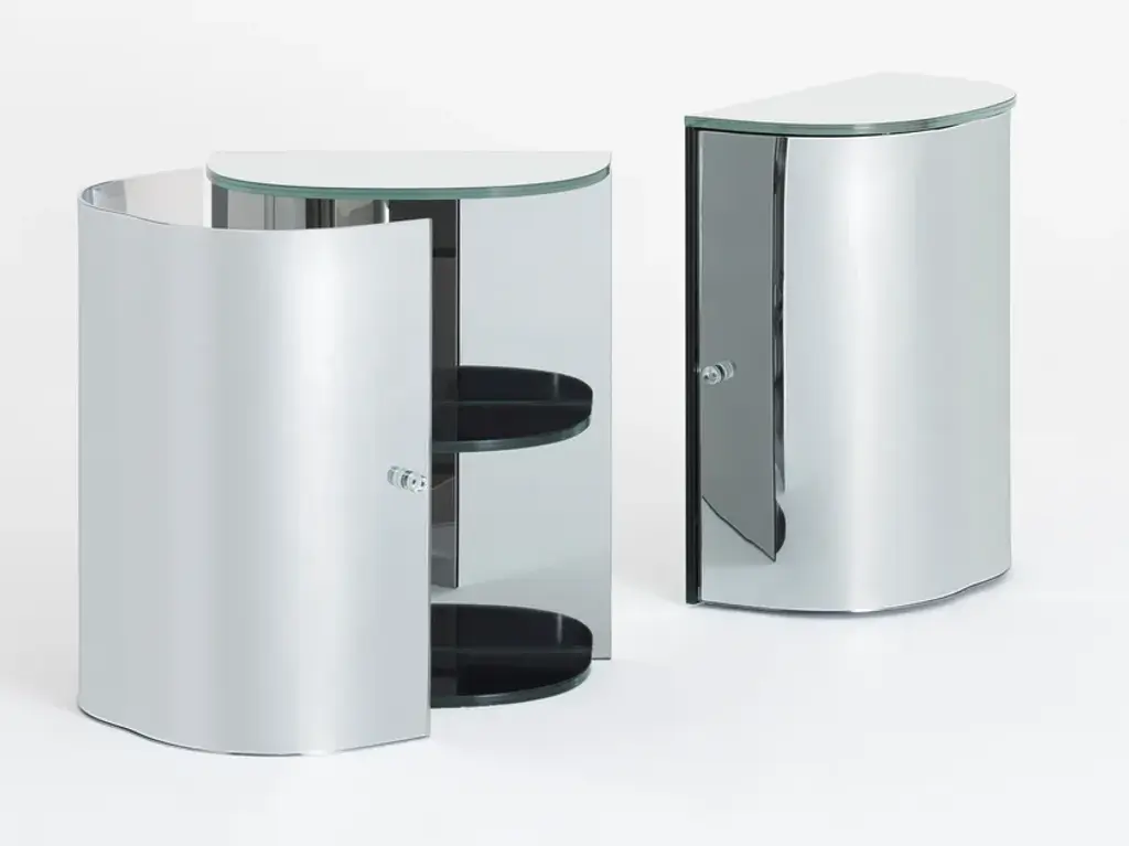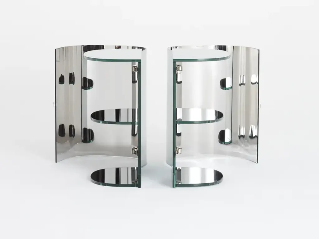 Storage units in a special mirrored glass with soft curved shapes.The structure is in 6+6 mm laminated glass fully mirrored, both inside and outside.The doors are in 6 mm curved and tempered double-sided mirrored glass, characterized by distorted and undefined reflections, which allow the material to be elusive and optically fluid. The doors have a blue-motion soft closure and are opened with cylindrical glass handles.