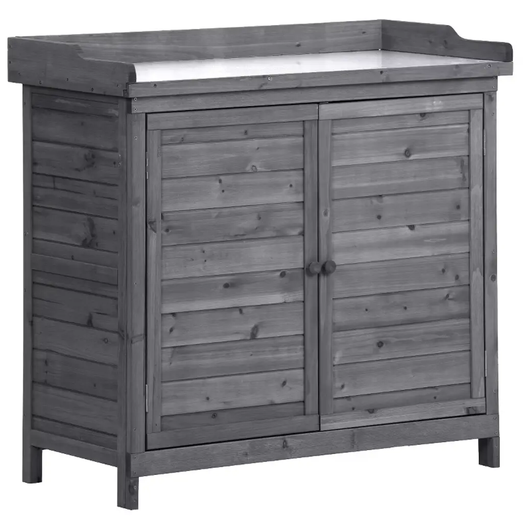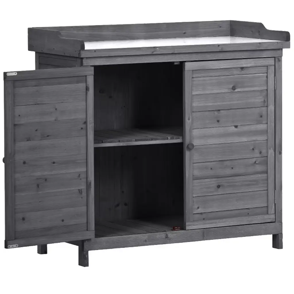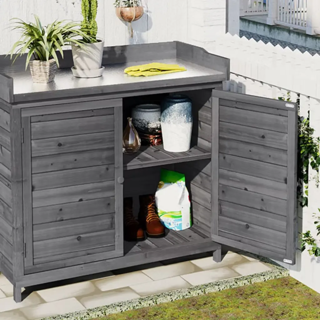 Designed to enhance gardening efficiency and organization, this rustic potting bench provides a functional and stylish workspace for outdoor and garden tasks. Constructed from solid fir wood, it offers a balance of durability and natural charm, making it a suitable addition to any garden or patio setting. The stable structure supports up to 44 lbs on the tabletop and 22 lbs on each storage shelf, offering ample space for potting plants, organizing tools, or even serving as a decorative outdoor workstation. The galvanized zinc tabletop is designed for easy maintenance and water resistance, allowing for a clean and convenient surface for gardening activities. This feature also enhances the bench’s versatility, making it usable as an outdoor buffet table for gatherings on a patio or deck. The spacious two-tier storage cabinet provides room for extra soil, pots, and gardening supplies, while the removable shelf allows for accommodating various tool sizes. For added convenience, the bench includes three side hooks, which can be positioned as needed to keep essential tools like gloves, towels, or hand tools within reach. This thoughtful design ensures that gardening accessories remain organized and easily accessible. The compact yet practical layout makes it an efficient workstation, reducing the need to bend or squat while working on plants. Assembly is straightforward with included tools and clear instructions, ensuring a smooth setup process. Whether used for gardening projects, plant care, or even as an unconventional outdoor storage unit, this potting bench blends functionality with rustic appeal, making it a practical and decorative addition to any outdoor space.