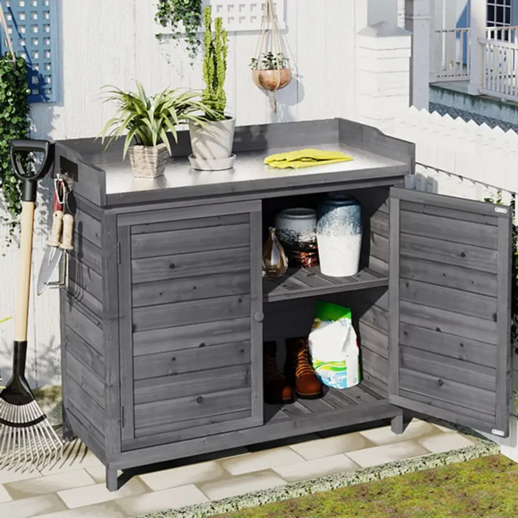 Outdoor 39" Potting Bench, Storage Cabinet Garden Shed With 2-tier Shelves And Side Hook, Garden Workstation With Gray Wood Frame-coolbibila