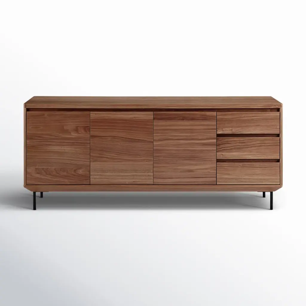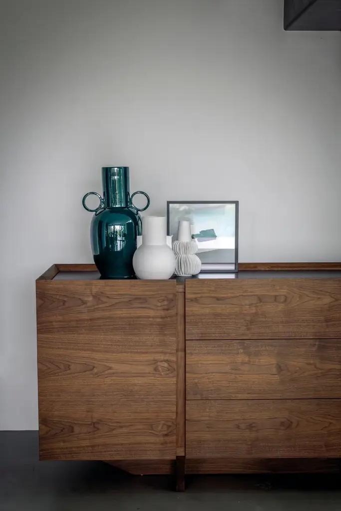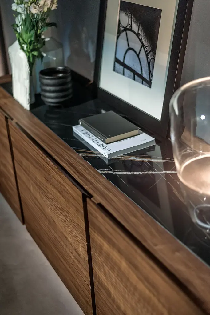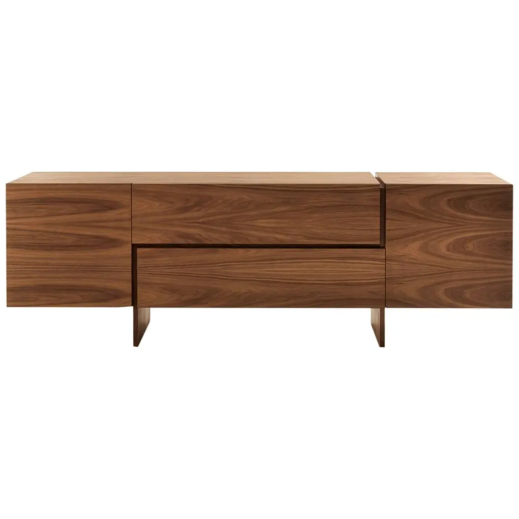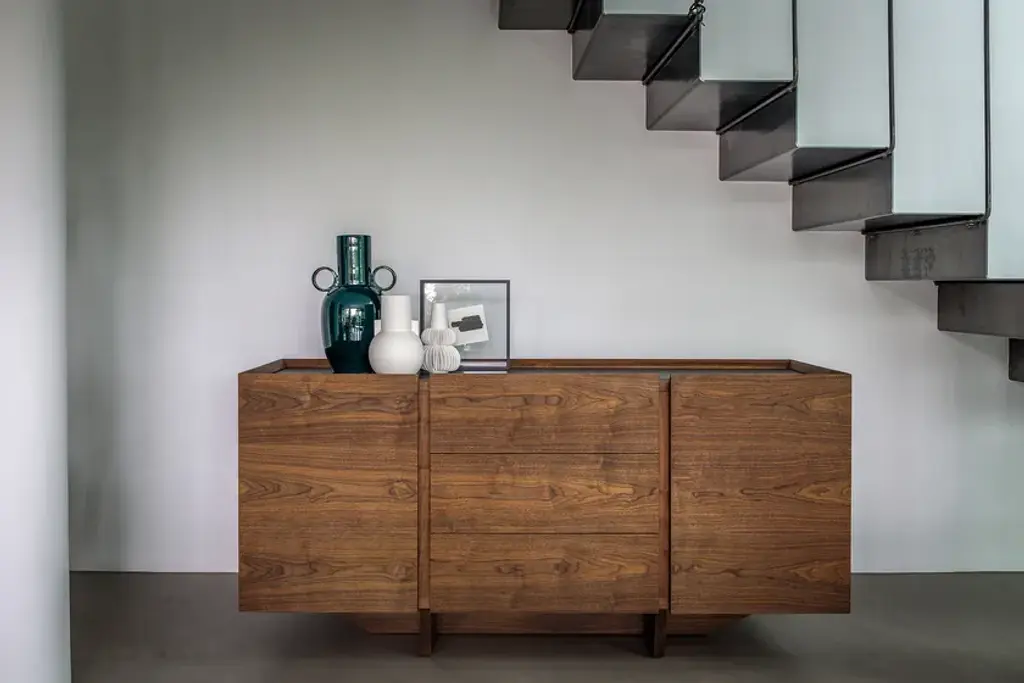 Pandora Up Small is a multifunctional storage unit in blockboard with two lateral doors, available also with metal, marble or glass insert on the top. Restyling of the original version, it has an iron base characterized by two U-shaped legs. The doors contain small shelves to store glasses. The central compartment has a series of drawers assembled with dovetail joints. The two lateral spaces are illuminated by LED strips along the inner sides, activated automatically via sensors when the doors are opened.STANDARD COMPOSITION: SEE TECHNICAL DRAWINGSSTANDARD VERSION: TOP AND INTERNAL SHELVES IN WOOD, IRON LEGS LACQUERED IRONDUST COLOUR (B2); DRAWERS ON METAL RUNNERSAVAILABLE FINISHES:A1: walnut without knots, walnut with knotsA2: oak without knots, oak with knots, cherryA4: oak without knots pigmented: milk white, total blackoak with knots pigmented: milk white, total blackN.B.: pigmented surfaces only outside, oak insideAVAILABLE FINISHES - TOPB2: lacquered iron: irondust, RAL (selected colours only)B3: lacquered iron with matt brushed effect: antique bronze, steel, titaniumE1: glass: satinE2: glass: smoked, bronzedE3: RAL lacquered glass (selected colours only)E4: glass + fabric, glass 130, moulded glassF1: stoneware Sahara noir, marble emperador dark, marble verde alpi,N.B.: dekton: feasibility on requestF2: calacatta marbleAVAILABLE FINISHES - SHELVESE1: glass: satinE2: glass: smoked, bronzedE3: RAL lacquered glass (selected colours only)E4: glass + fabric, glass 130, moulded glass