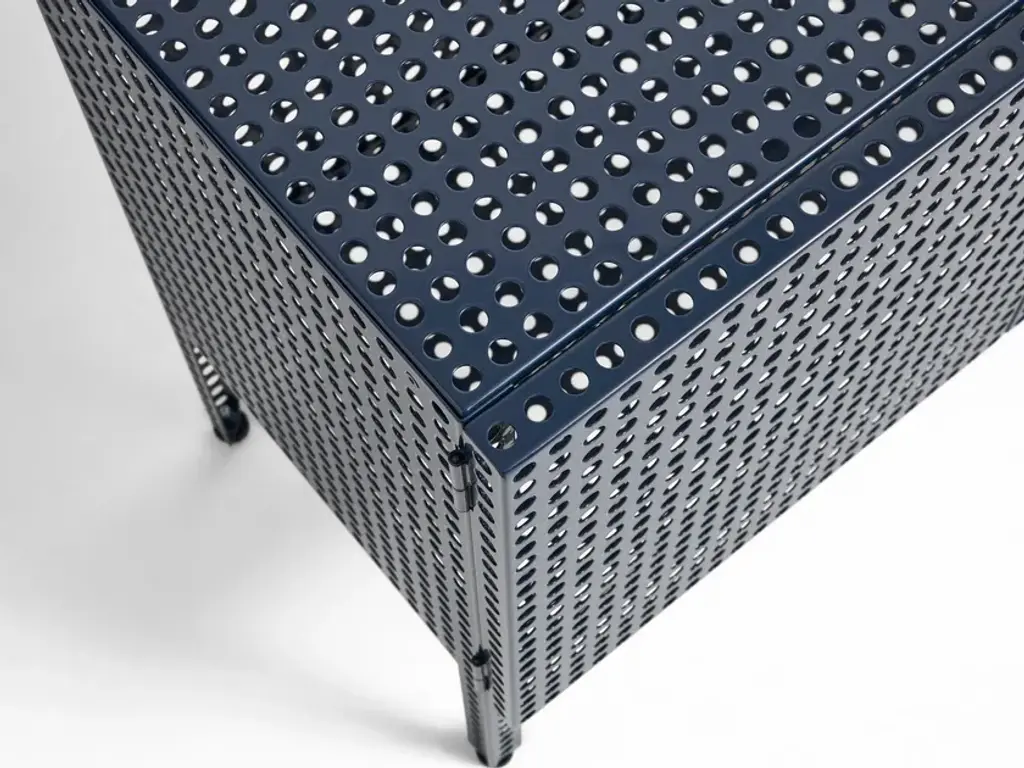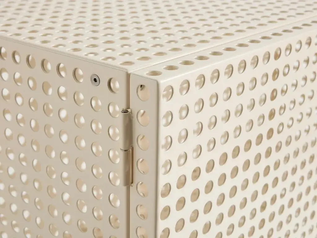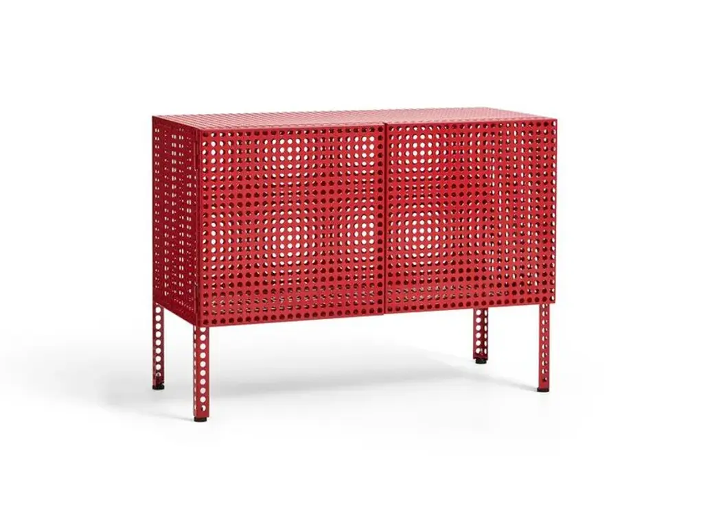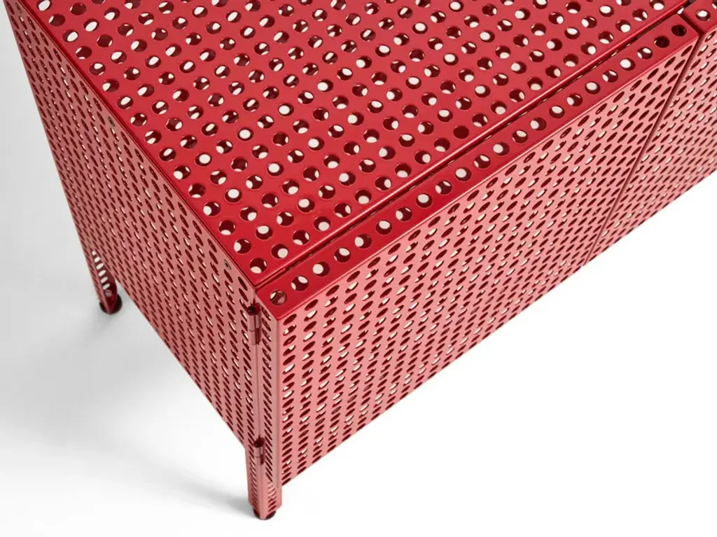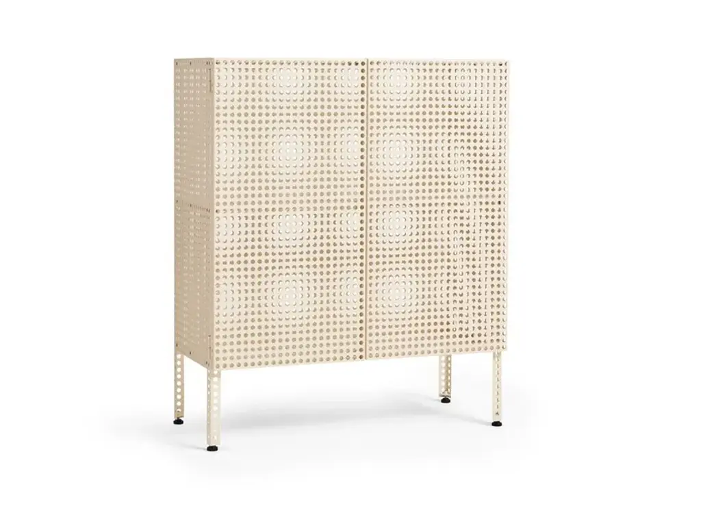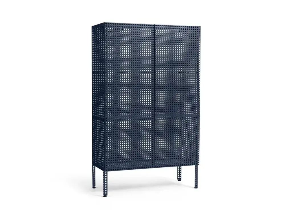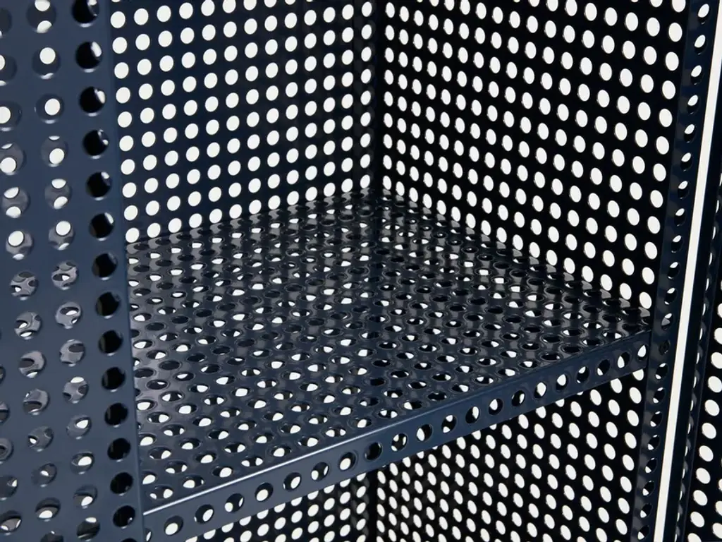 Perforated cabinet Floor is a cabinet with hinged doors in powder-coated steel.Defined by Muller Van Severen’s characteristic use of colour, form, and function, the Perforated Cabinet is a series of storage units that blend utility with bold aesthetics. The semi-transparent holes subtly conceal the contents while maintaining a sense of organisation. Available as wall-hanging and floor-standing variants, both featuring a magnetic door closure, they offer a practical and visually appealing solution for arranging and storing objects. Crafted in powder-coated steel, the cabinets come in different sizes and colours, providing a versatile storage solution for a wide range of domestic and public environments.