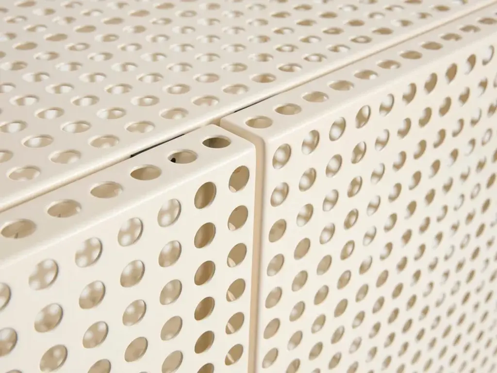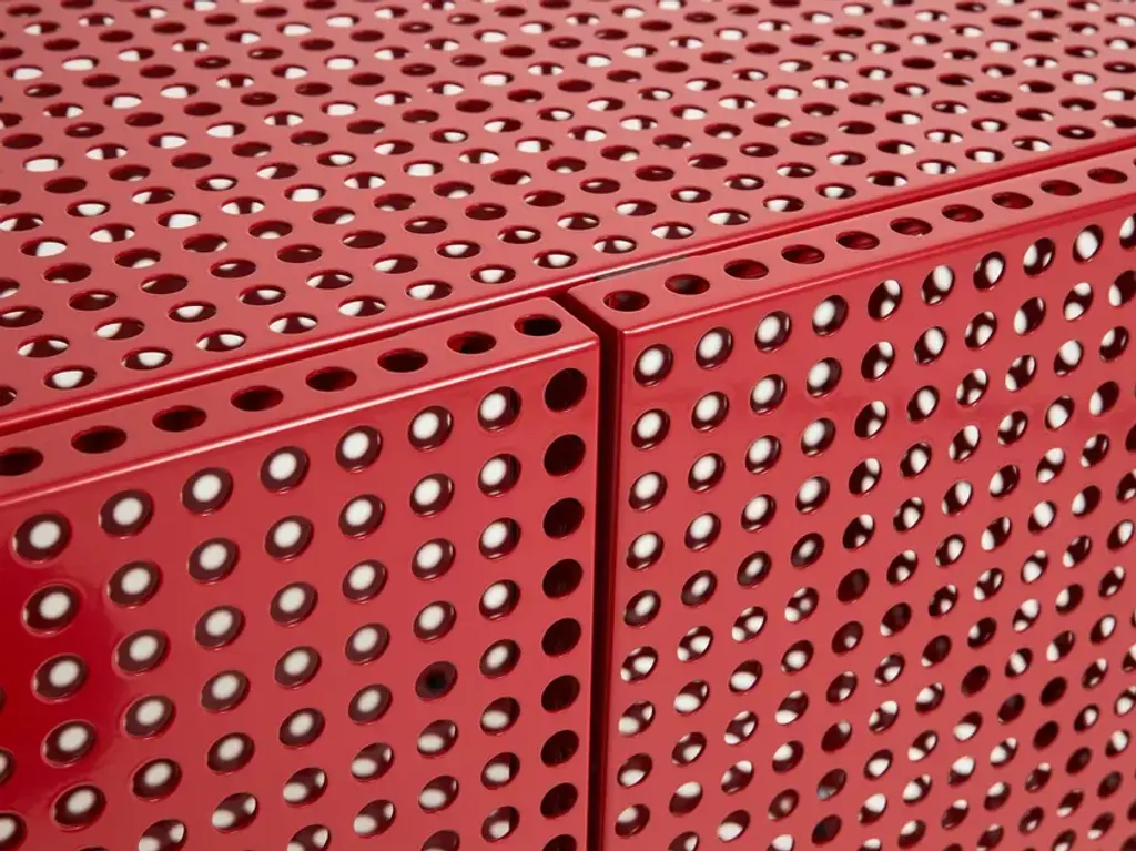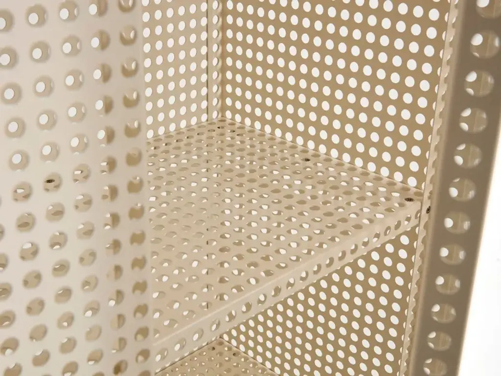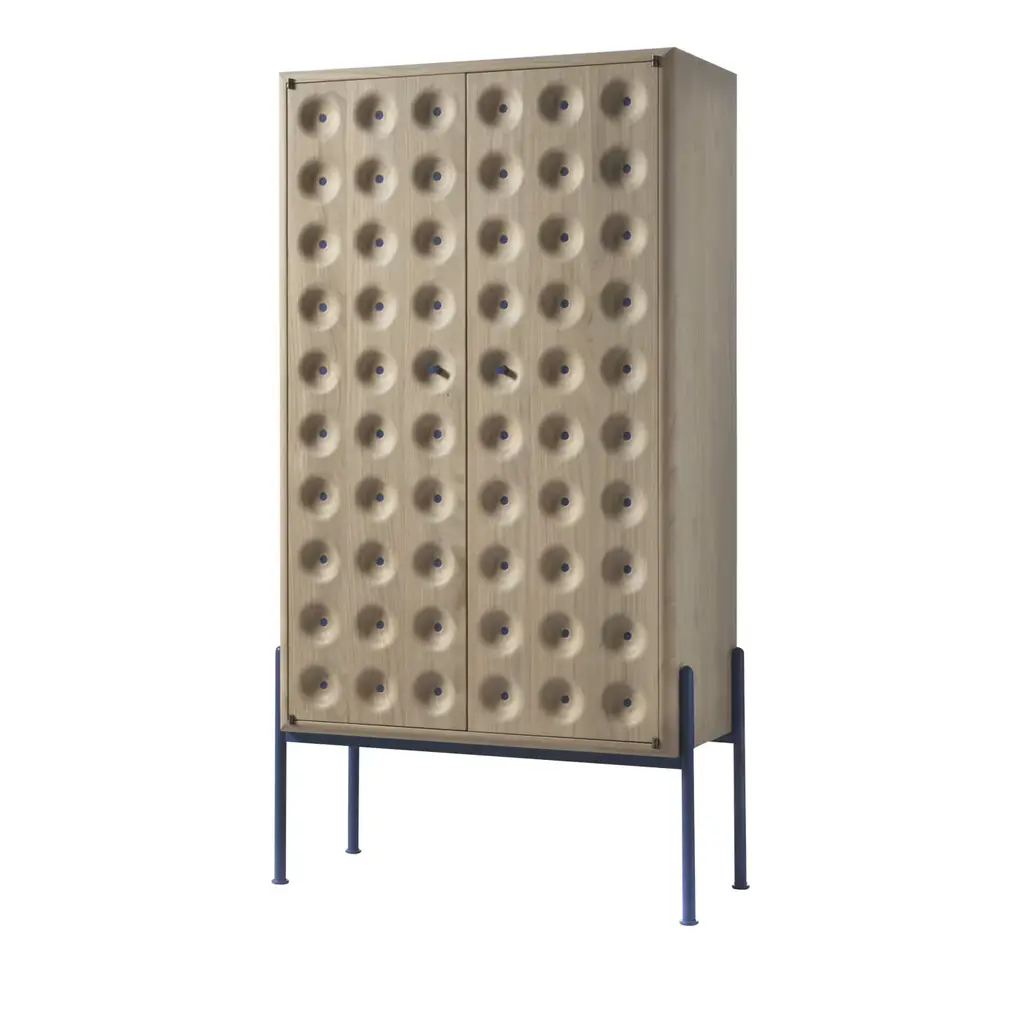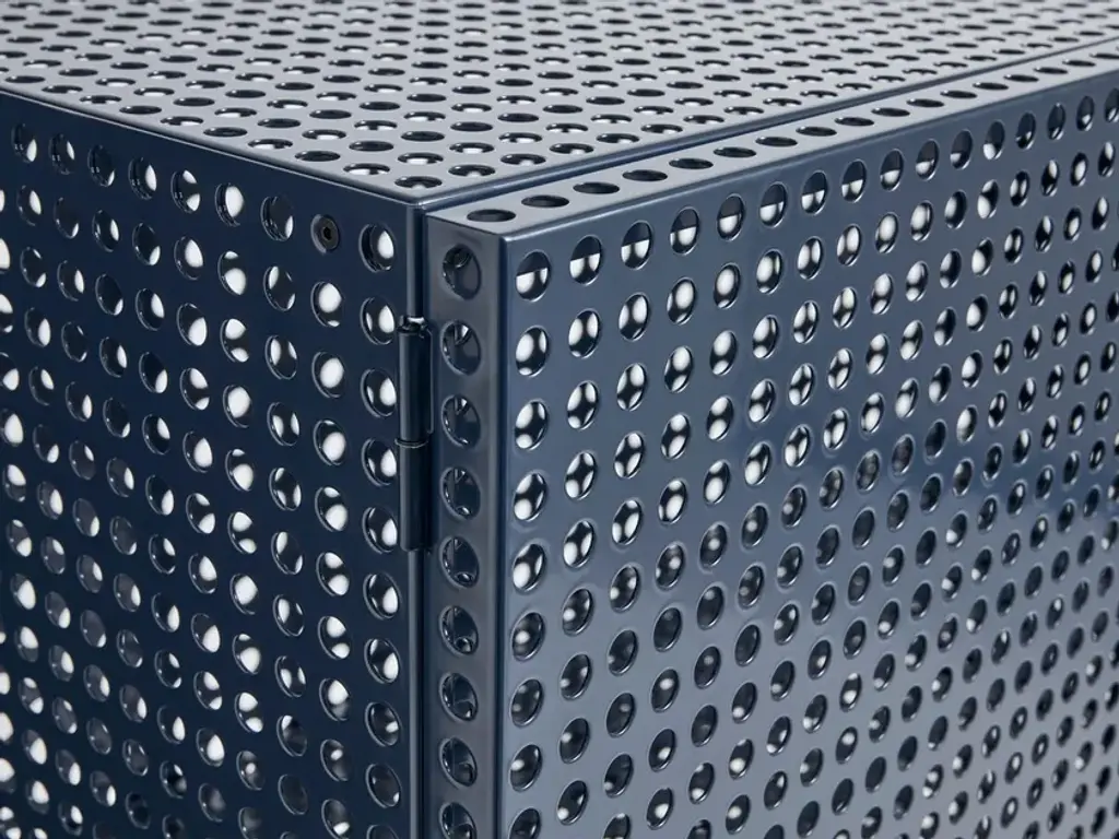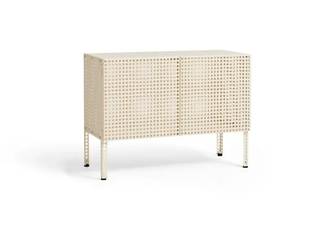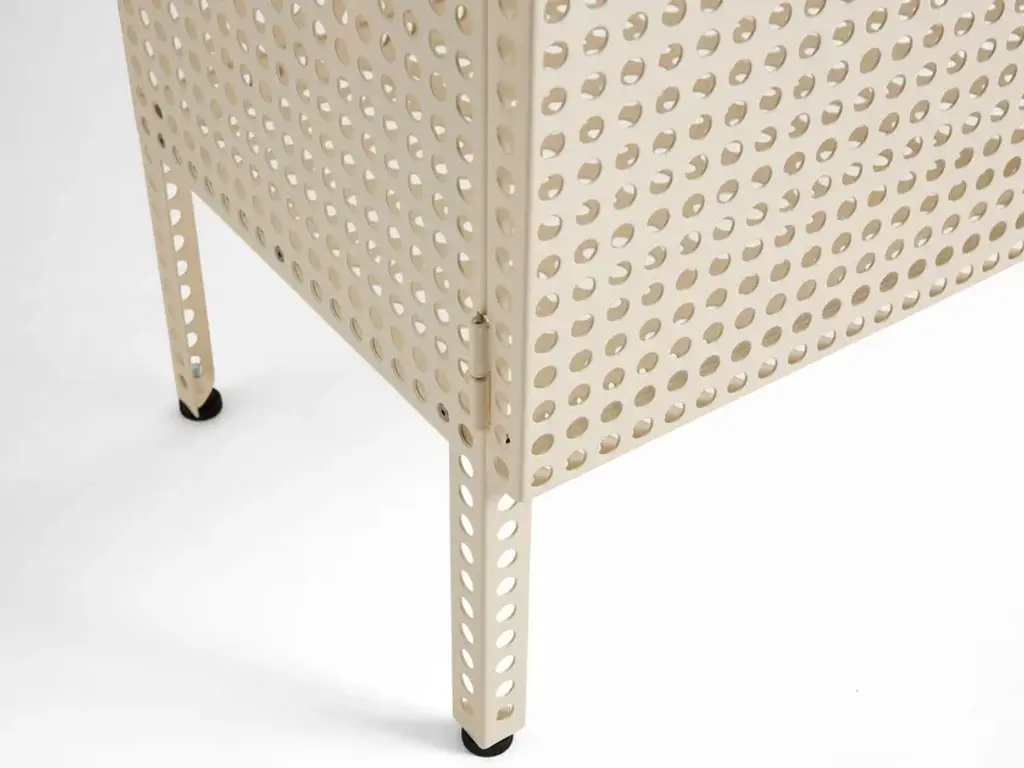 Perforated cabinet Floor is a cabinet with hinged doors in powder-coated steel.Defined by Muller Van Severen’s characteristic use of colour, form, and function, the Perforated Cabinet is a series of storage units that blend utility with bold aesthetics. The semi-transparent holes subtly conceal the contents while maintaining a sense of organisation. Available as wall-hanging and floor-standing variants, both featuring a magnetic door closure, they offer a practical and visually appealing solution for arranging and storing objects. Crafted in powder-coated steel, the cabinets come in different sizes and colours, providing a versatile storage solution for a wide range of domestic and public environments.
