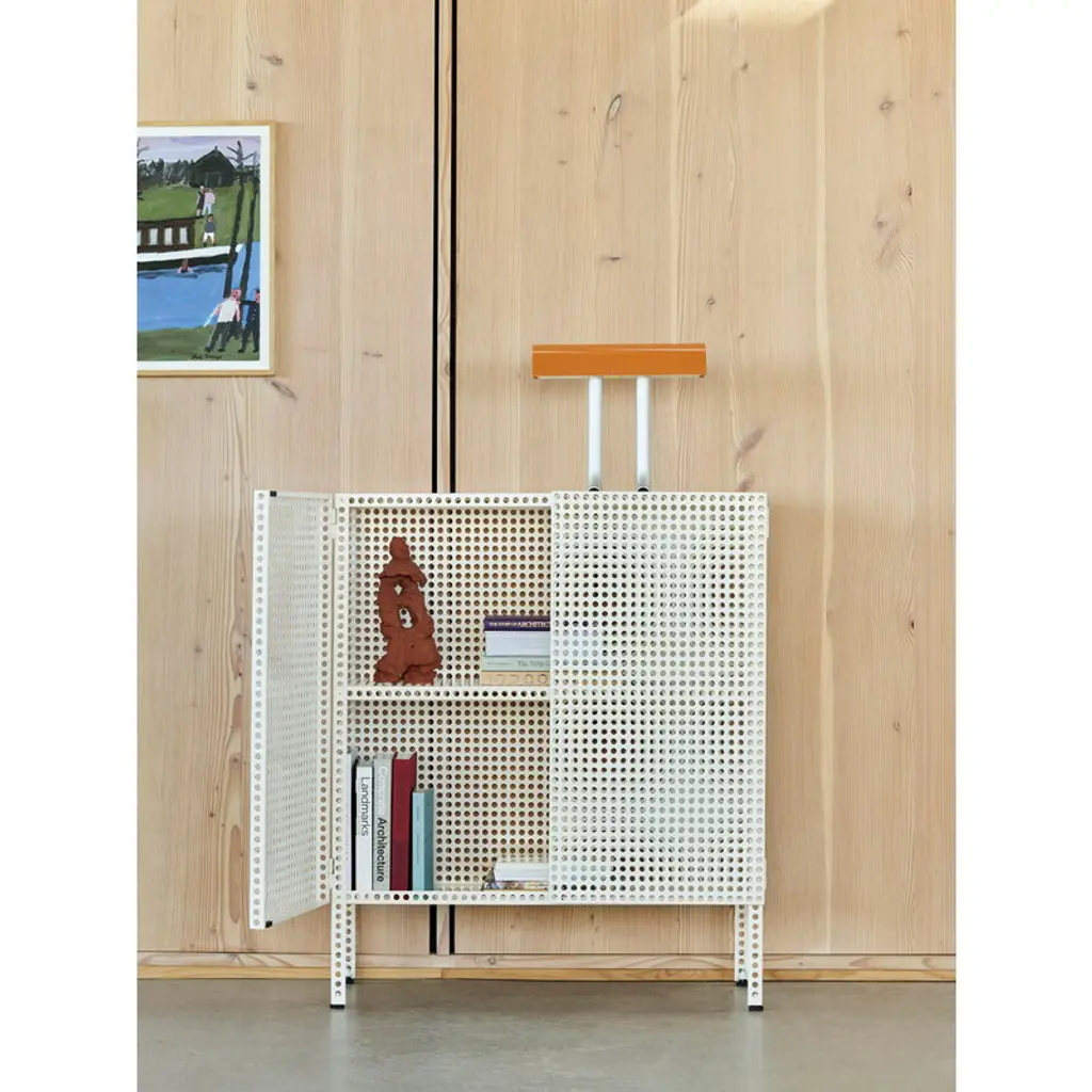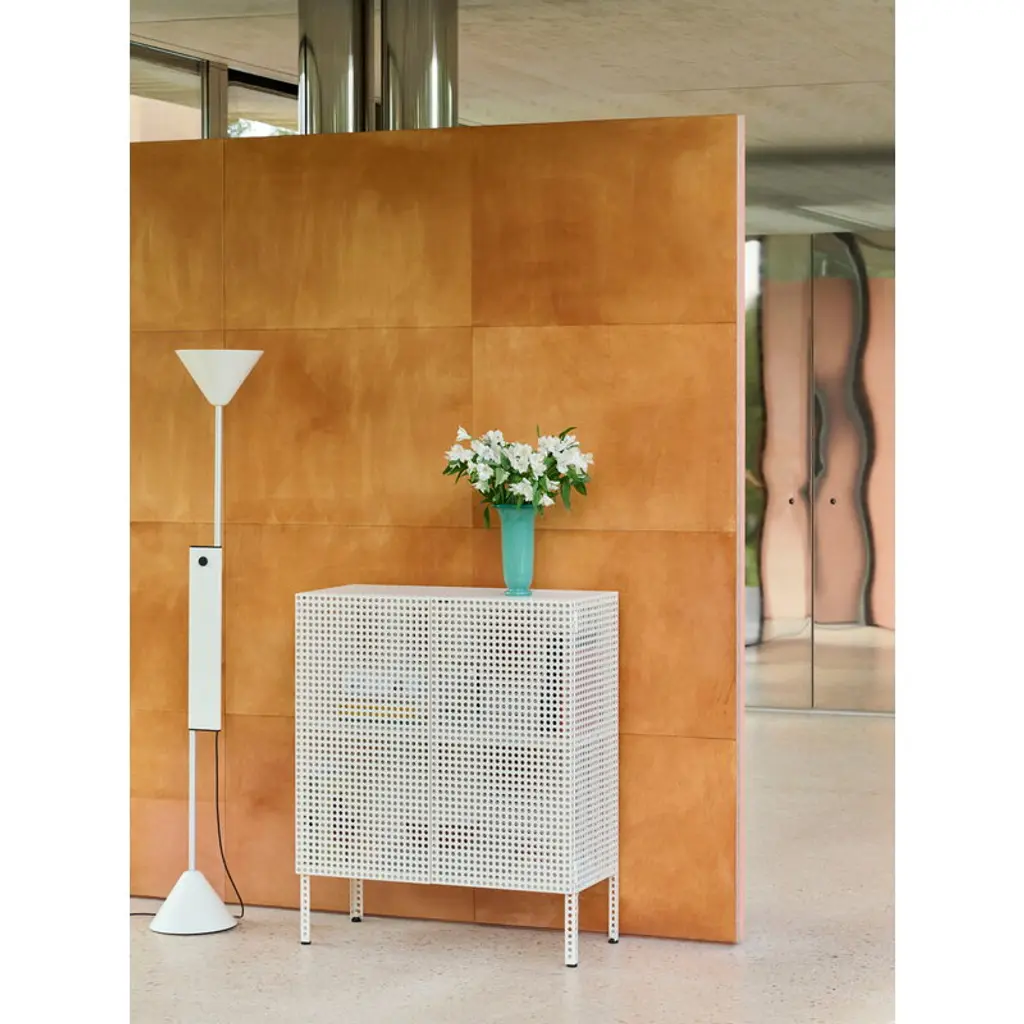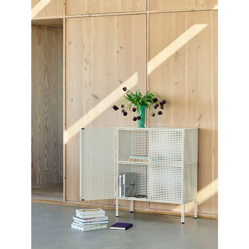 HAY’s Perforated cabinet is a minimalist storage unit that reflects Muller Van Severen’s playful industrial esthetic. The perforated surface protects the contents from dust while offering a subtle, semi-transparent glimpse inside. Made of powder-coated steel, the floor cabinet stands on sturdy legs and features doors that close softly with a magnetic mechanism. The Perforated series includes modern metal cabinets in various sizes and colors, designed to mix and match effortlessly – both with each other and with different styles of furniture. The perforated cabinets are ideal for organizing items in the hallway, office or kitchen, and also work beautifully as eye-catching storage in the living room. Their durable construction makes them suitable for public spaces as well.