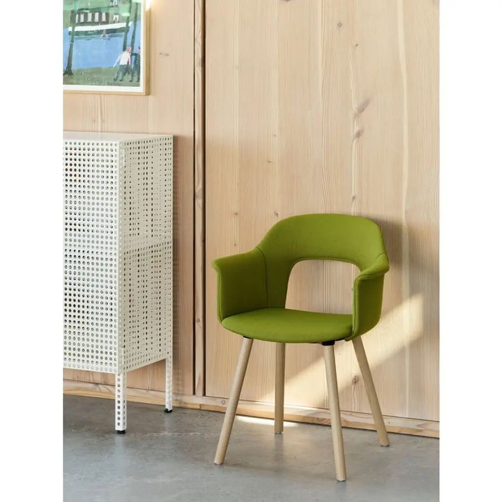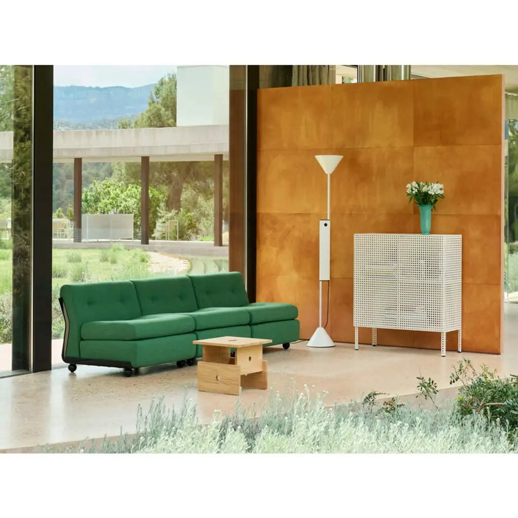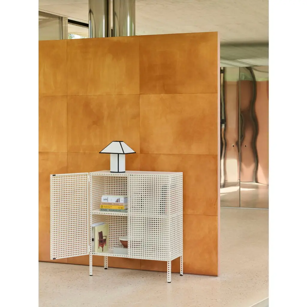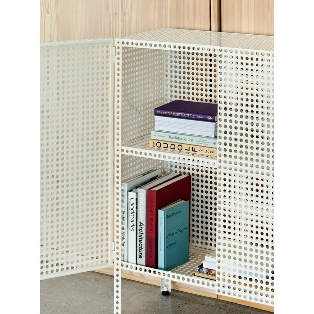 HAY’s Perforated cabinet is a minimalist storage unit that reflects Muller Van Severen’s playful industrial esthetic. The perforated surface protects the contents from dust while offering a subtle, semi-transparent glimpse inside. Made of powder-coated steel, the floor cabinet stands on sturdy legs and features doors that close softly with a magnetic mechanism. The Perforated series includes modern metal cabinets in various sizes and colors, designed to mix and match effortlessly – both with each other and with different styles of furniture. The perforated cabinets are ideal for organizing items in the hallway, office or kitchen, and also work beautifully as eye-catching storage in the living room. Their durable construction makes them suitable for public spaces as well.