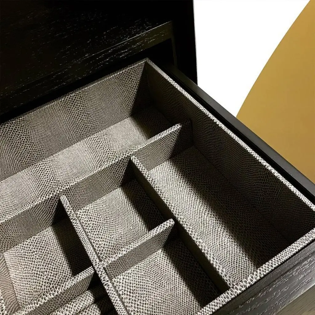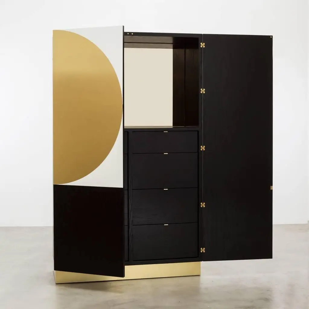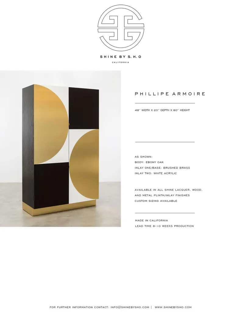 PHILIPPE CABINET - Modern Geometric Brass Inlay on an Oak and Acrylic Body.The Philippe Storage Cabinet features a modern geometric brass inlay detail on a mixed oak and acrylic body. The interior is shown as a storage cabinet with six drawers, two jewelry trays, and a bronze mirror. It can be customized to any interior needed, whether it be a wardrobe, bar, jewelry, or storage interior. Fully custom and made to order in California. The Philippe Storage Cabinet is a customizable storage unit that features a modern and stylish design. The cabinet's body is made of mixed oak and acrylic, with a unique geometric brass inlay detail that adds an elegant touch to the piece. The interior is designed as a storage cabinet with six drawers, two jewelry trays, and a bronze mirror, providing ample space to organize and store your belongings.The Philippe Storage Cabinet can be customized to suit your specific needs and preferences, whether you need it as a wardrobe, bar, jewelry, or storage interior. The cabinet is fully custom and made to order in California, ensuring that it's built to the highest standards of craftsmanship and quality.The Philippe Storage Cabinet starts at $22,470 and can be customized to include additional features or finishes that suit your style and requirements. The Ebony Oak Body version, as shown, is priced at $27,230. Regardless of the configuration you choose, the Philippe Storage Cabinet is a premium storage solution that is both functional and beautiful.