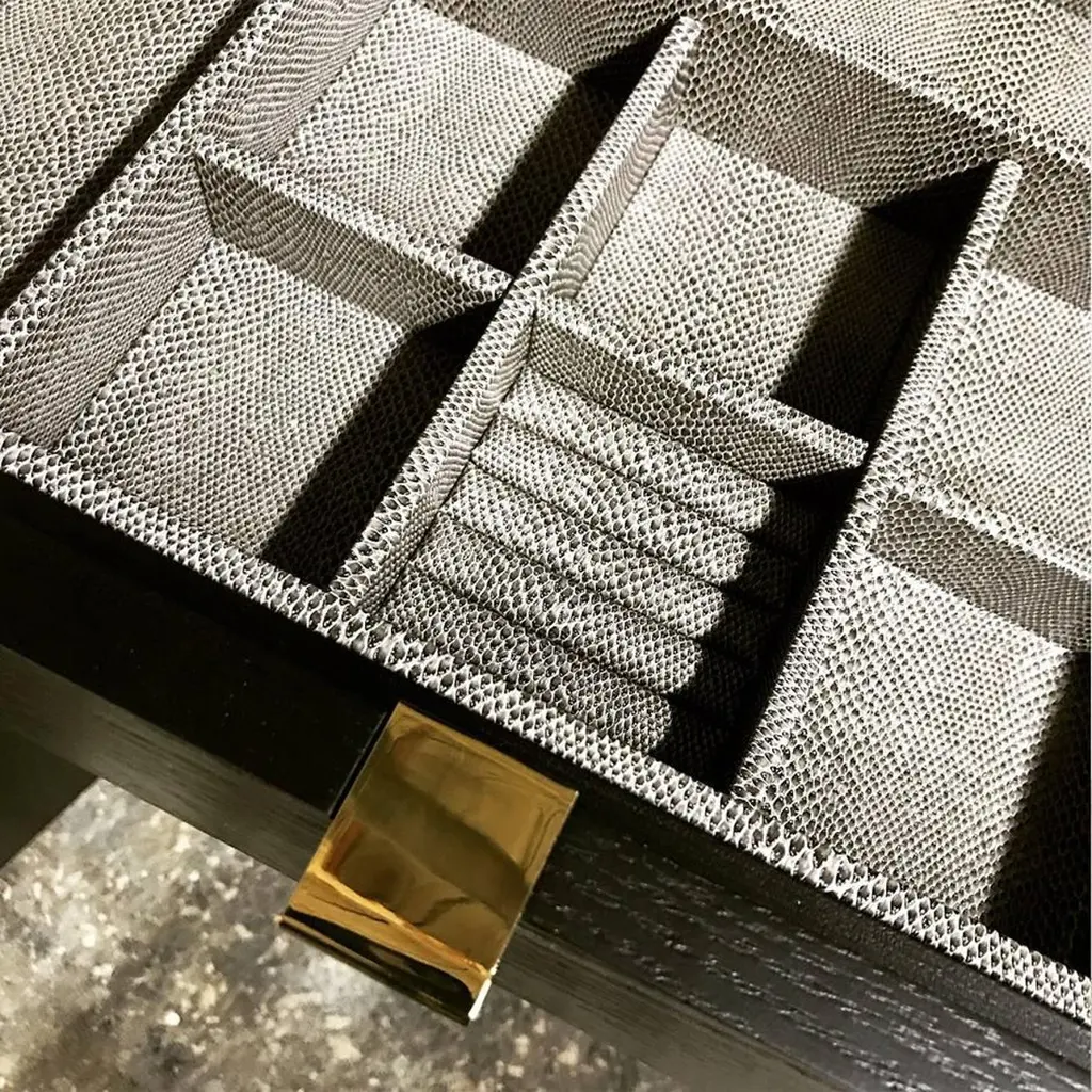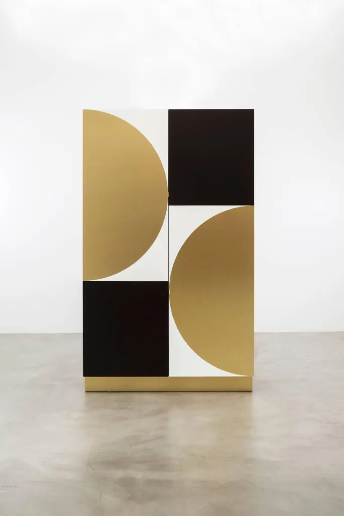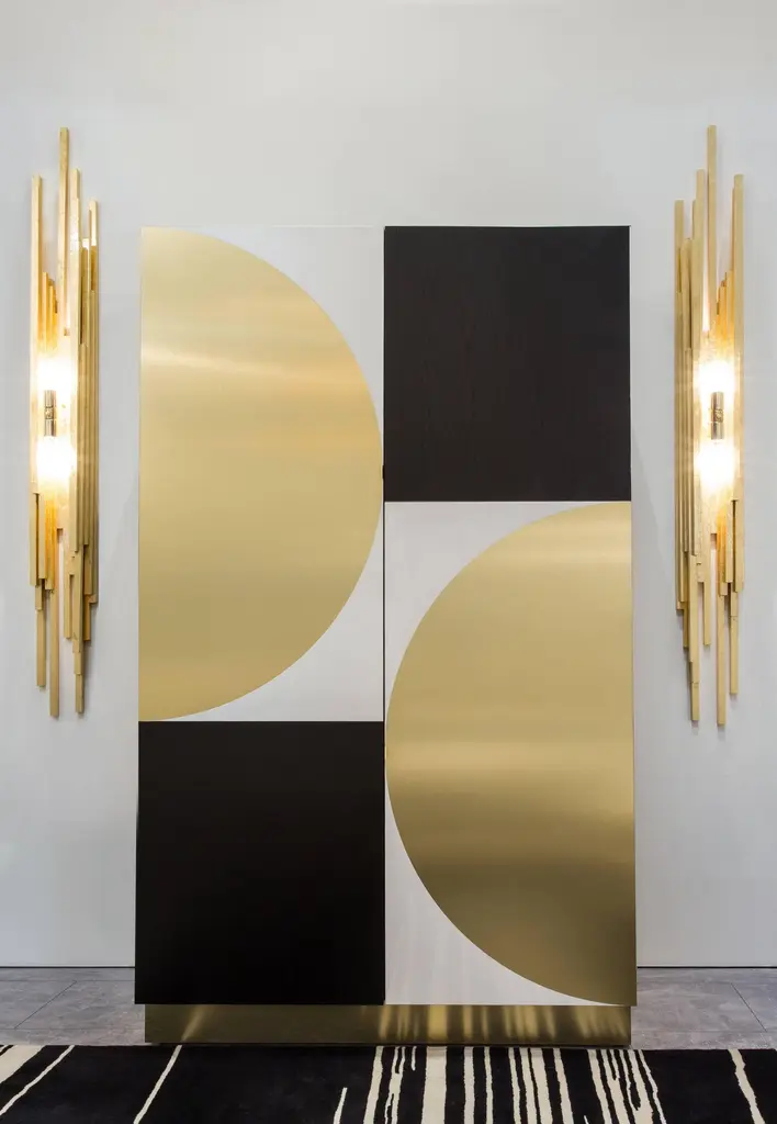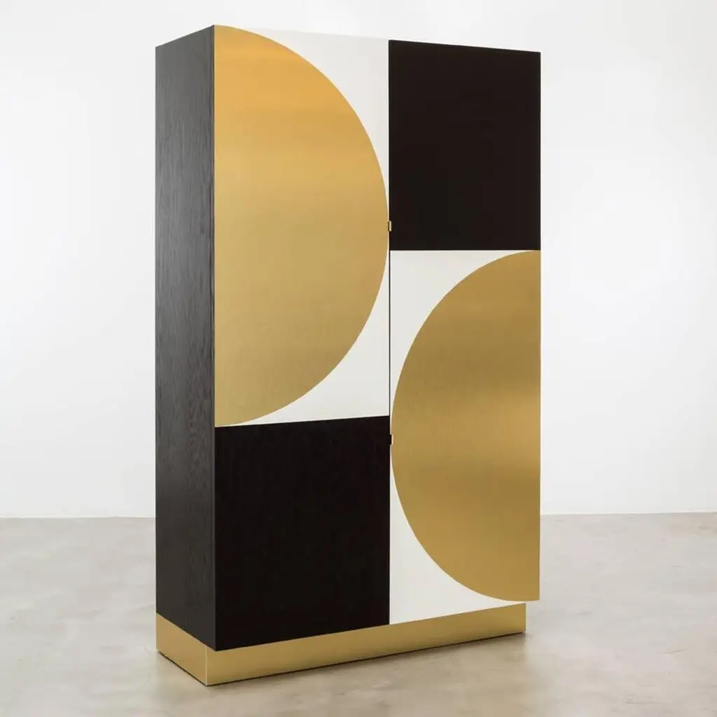 PHILIPPE CABINET - Modern Geometric Brass Inlay on an Oak and Acrylic Body.The Philippe Storage Cabinet features a modern geometric brass inlay detail on a mixed oak and acrylic body. The interior is shown as a storage cabinet with six drawers, two jewelry trays, and a bronze mirror. It can be customized to any interior needed, whether it be a wardrobe, bar, jewelry, or storage interior. Fully custom and made to order in California. The Philippe Storage Cabinet is a customizable storage unit that features a modern and stylish design. The cabinet's body is made of mixed oak and acrylic, with a unique geometric brass inlay detail that adds an elegant touch to the piece. The interior is designed as a storage cabinet with six drawers, two jewelry trays, and a bronze mirror, providing ample space to organize and store your belongings.The Philippe Storage Cabinet can be customized to suit your specific needs and preferences, whether you need it as a wardrobe, bar, jewelry, or storage interior. The cabinet is fully custom and made to order in California, ensuring that it's built to the highest standards of craftsmanship and quality.The Philippe Storage Cabinet starts at $22,470 and can be customized to include additional features or finishes that suit your style and requirements. The Ebony Oak Body version, as shown, is priced at $27,230. Regardless of the configuration you choose, the Philippe Storage Cabinet is a premium storage solution that is both functional and beautiful.