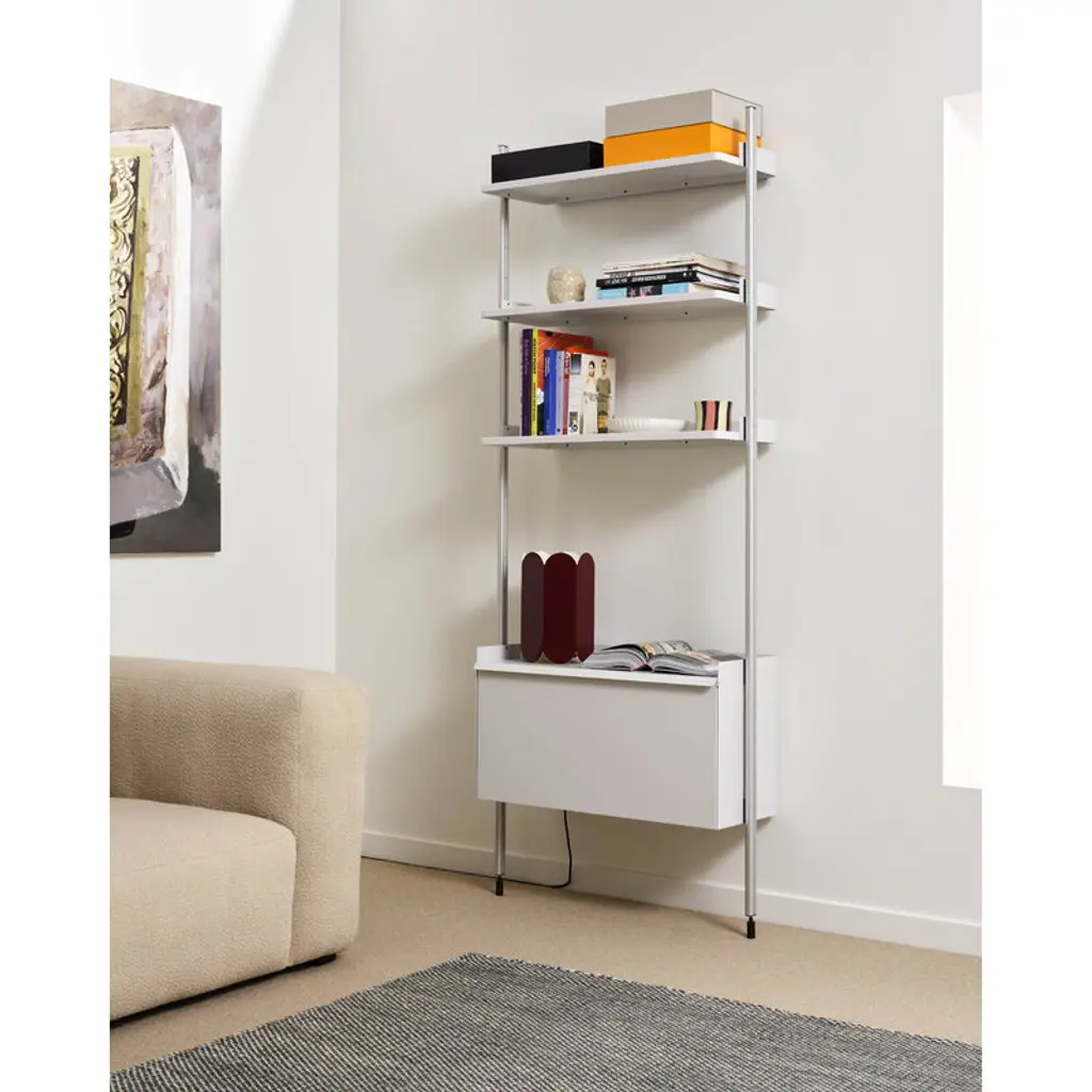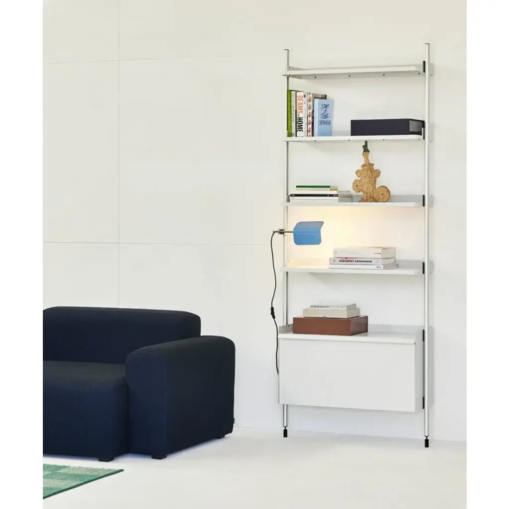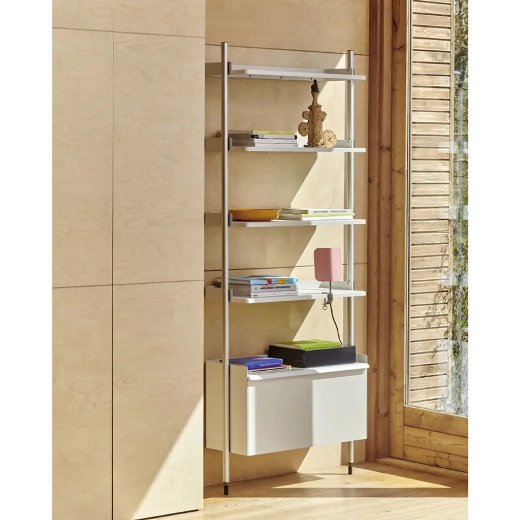 HAY's Pier System, designed by Ronan & Erwan Bouroullec, is a versatile storage solution that adapts seamlessly to the ever-changing needs of modern living. Pier System's simple structure can be easily adjusted to fit any space or requirement – whether you need to expand or downsize your storage, the modular shelf has got you covered! This Pier System 131 storage combination consists of three levels and a cabinet with a door. The steel shelves can hold up to 33.07 lbs (15 kg) each and feature a white finish with a slightly darker back edge, adding a gentle contrast to the shelf's clean and minimalist design. The lightweight yet durable aluminum frame ensures both functionality and timeless style.