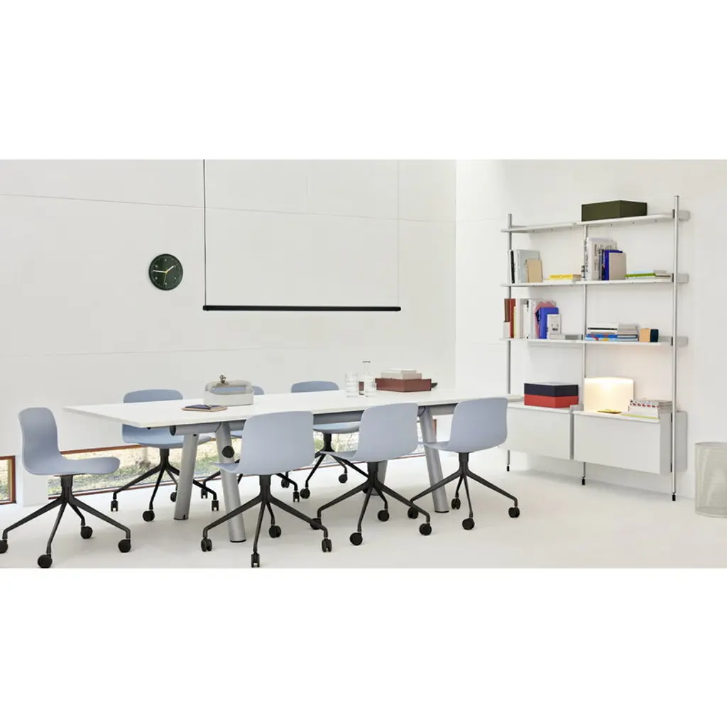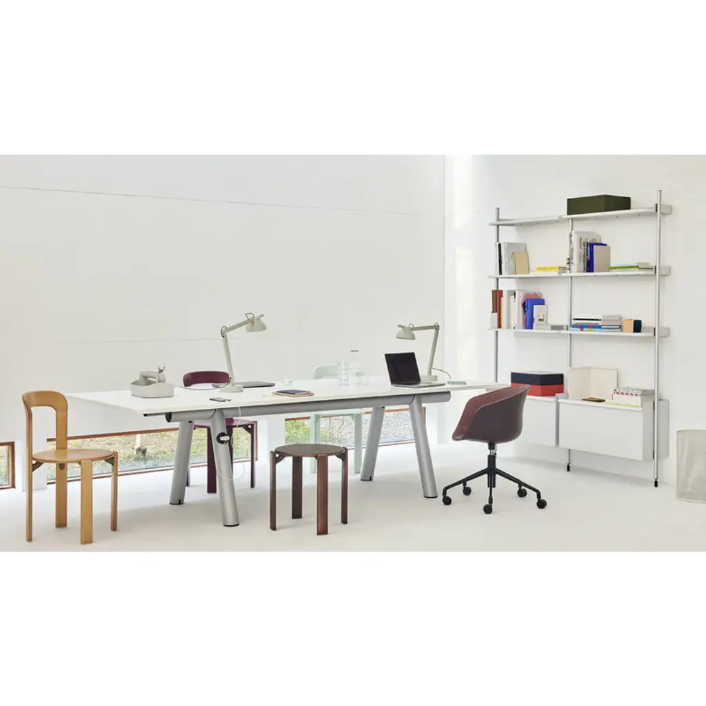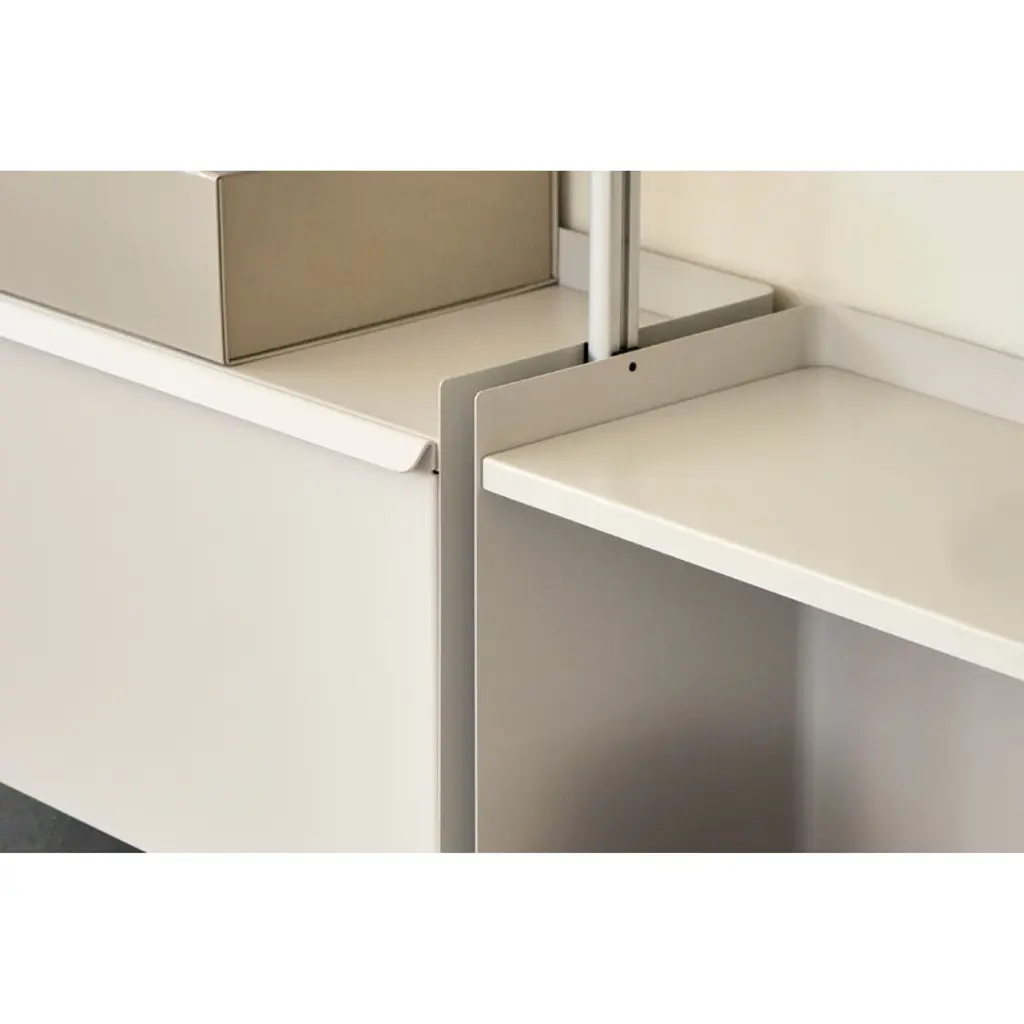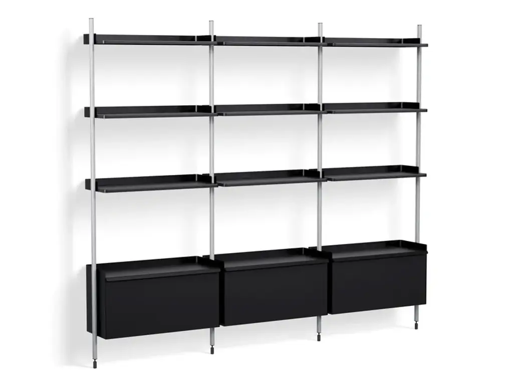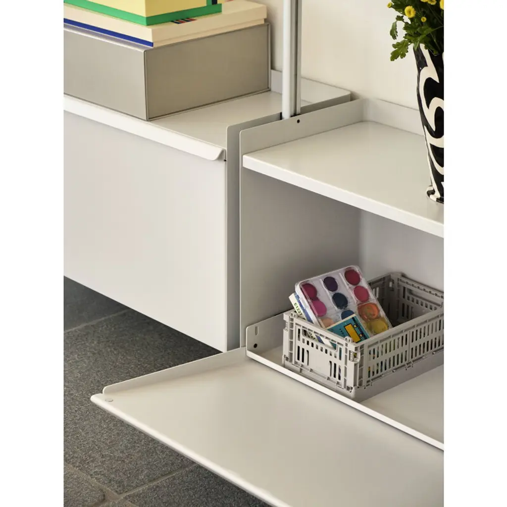 HAY's Pier System, designed by Ronan & Erwan Bouroullec, is a versatile storage solution that adapts seamlessly to the ever-changing needs of modern living. Pier System's simple structure can be easily adjusted to fit any space or requirement – whether you need to expand or downsize your storage, the modular shelf has got you covered! This two-part Pier System 132 storage combination consists of three levels and a cabinet with a door in each part. The steel shelves can hold up to 33.07 lbs (15 kg) each and feature a white finish with a slightly darker back edge, adding a gentle contrast to the shelf's clean and minimalist design. The lightweight yet durable aluminum frame ensures both functionality and timeless style.
