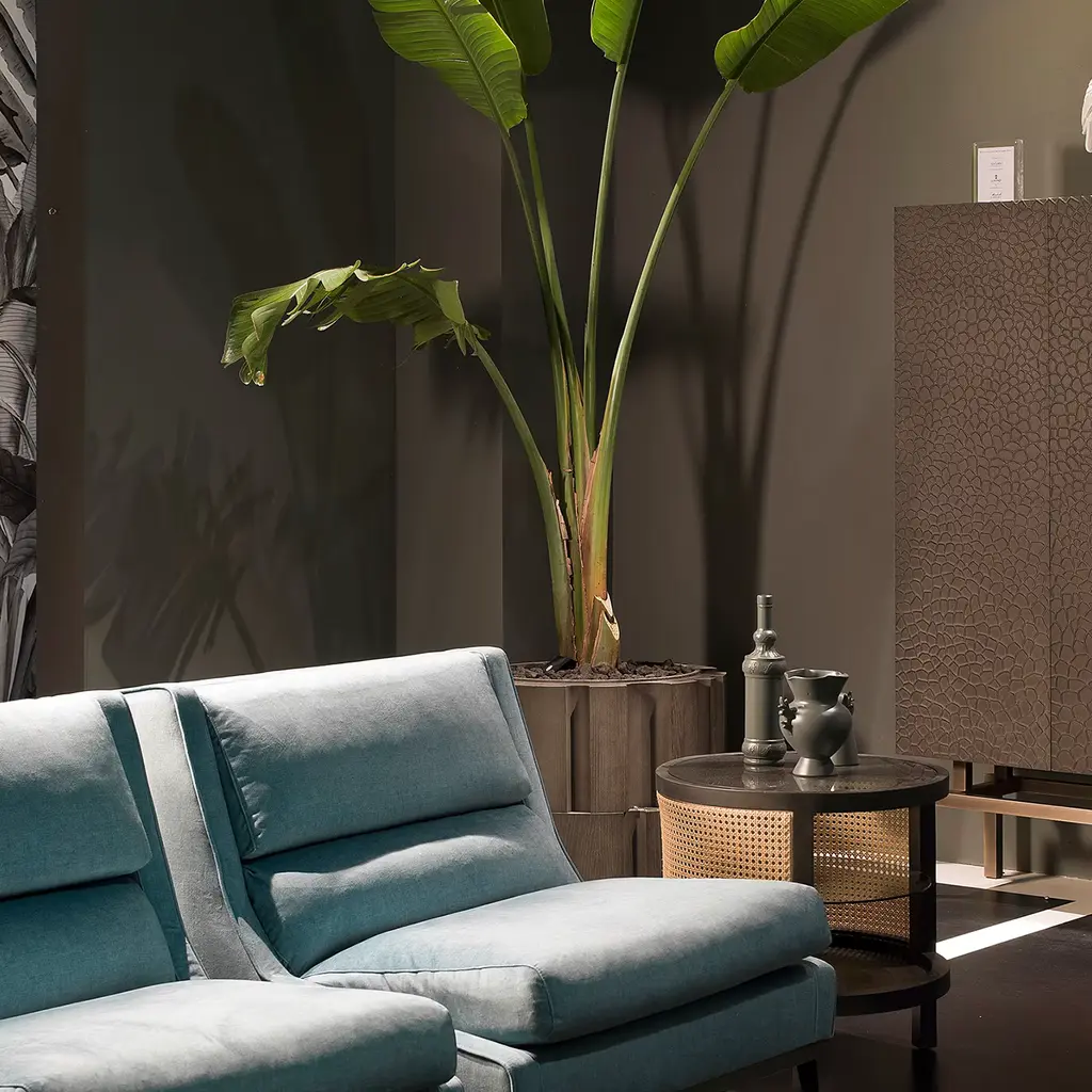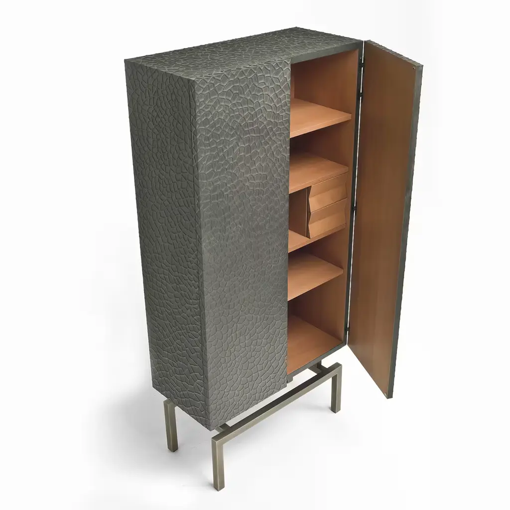 The Potters high container unit, designed by Fratelli Boffi is a storage unit with a squared-off shape composed of a case in coal-stained ash supported by a square tubular metal base with a burnished brass finish. The unusual aspect of Potters is the treatment of the wood, inspired by the container units by Jean-Michel Frank and produced with the latest digitally controlled machines. This unusual treatment results in an extremely natural tortoiseshell surface.