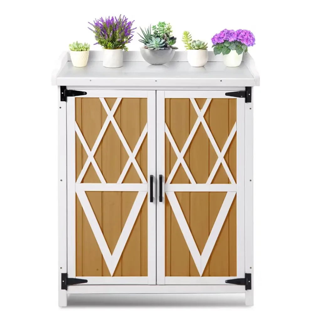 Potting Bench Outdoor Cabinet With Metal Tabletop, Workbenches With Adjustable Shelf, Wooden Storage Cabinets Waterproof For Garden Patio Lawn