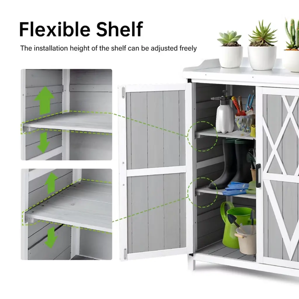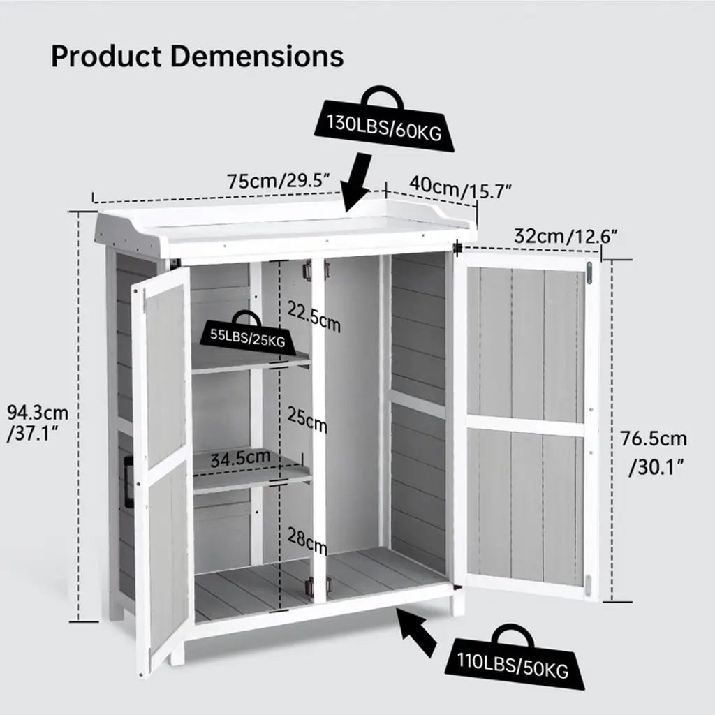 Galvanized Metal Tabletop: Our potting workbench with storage features a spacious working area measuring 29.5"L x 15.7"W. The metal surface is easy to clean, waterproof, and the material ensures reliable use of this outdoor storage unit in various weather conditions.
