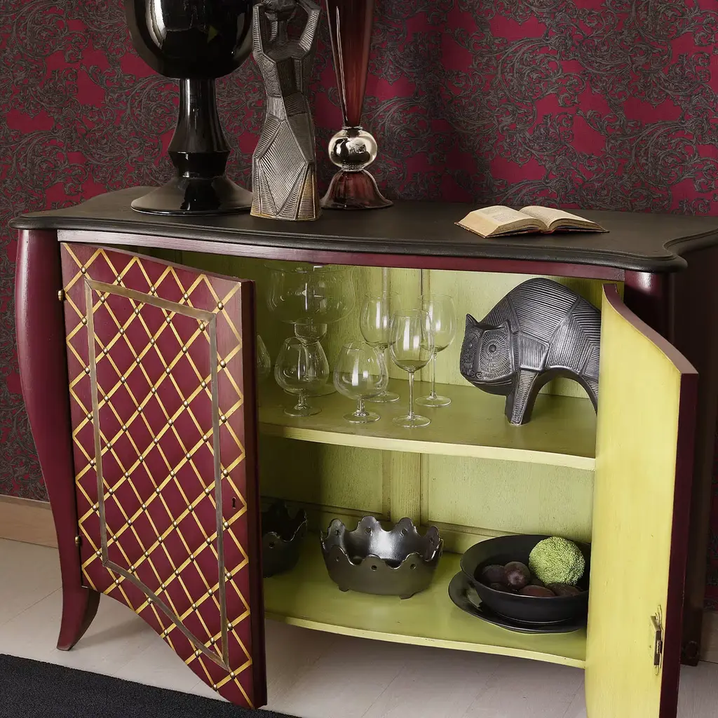 Marked by a yellow diamond pattern accented with studs, this sideboard boasts a wooden frame traced by sinuous and harmonious lines and finished in a glamorous tone of purple. Brass frames accent the two doors, which open to reveal a wide storage unit lacquered in a vibrant apple-green color for adding a dash of freshness to the piece. A quiet black-finished top seals the design.
