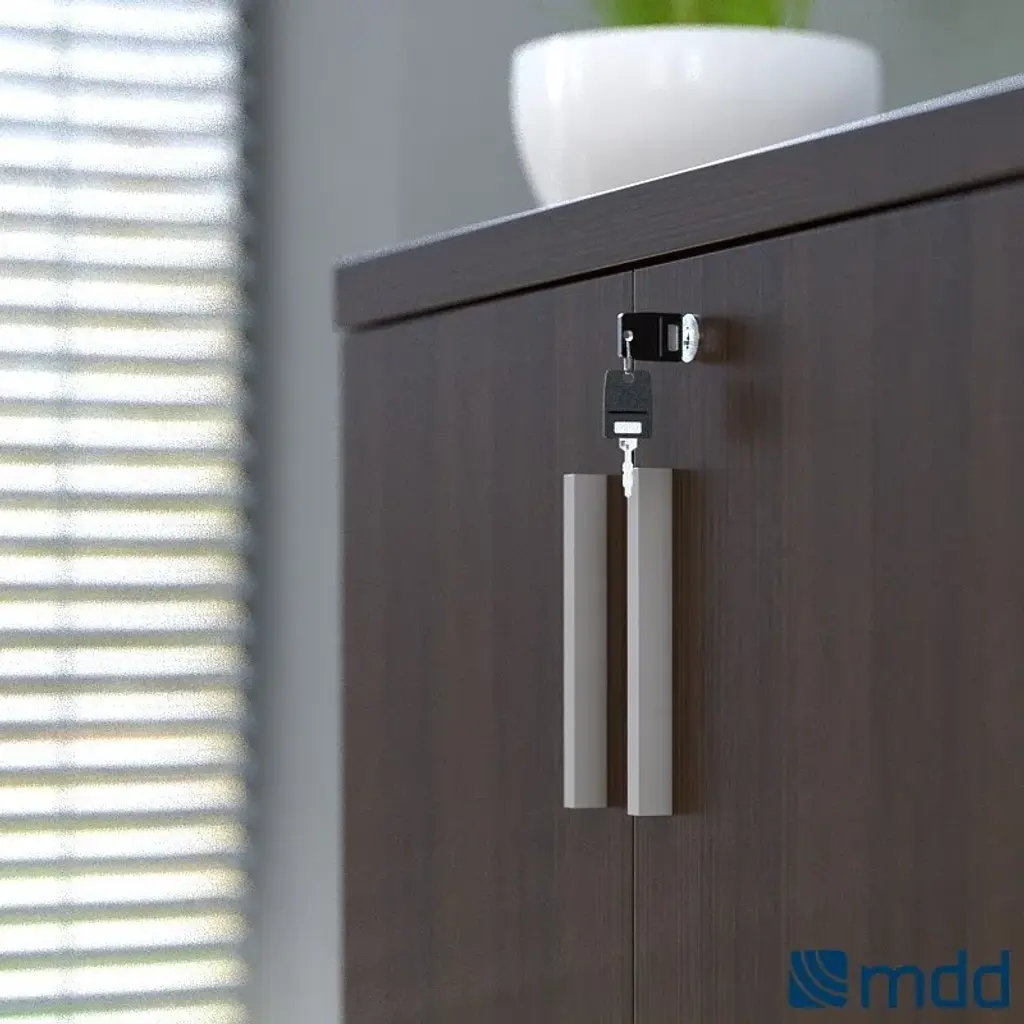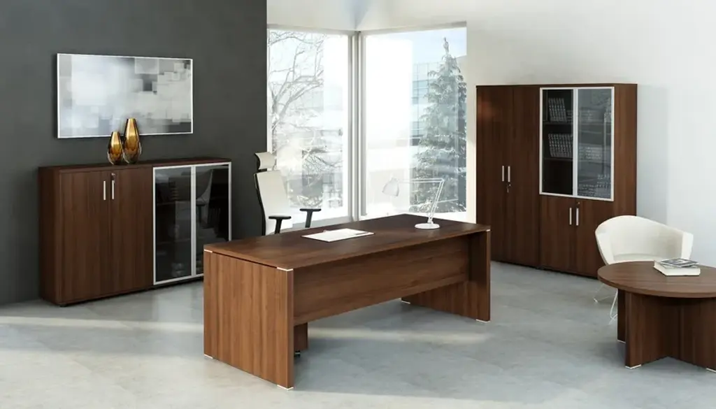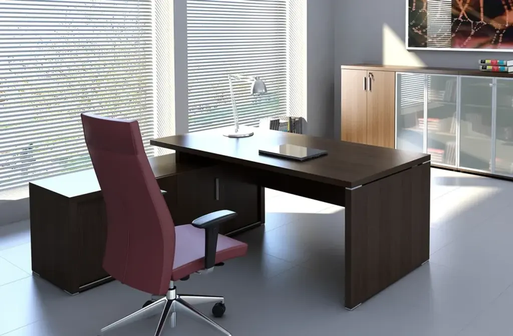 Quando is an office cabinet with sliding doors made of melamine material.Solutions that make your workplace more comfortable. This collection perfectly fits to modern minimalistic interiors thanks to its simple streamlined desks available in three different colours, Lowland nut, Chestnut and Canadian Oak, ornamented with noble decorative aluminium details, which also are the distinctive trends of this collection. Despite its plainness, Quando is extremely elegant and most of all, functional. QUANDO - solutions that make your workplace more comfortable. This collection perfectly fits to modern minimalistic interiors, simple streamlined desks and distinct aluminum details.