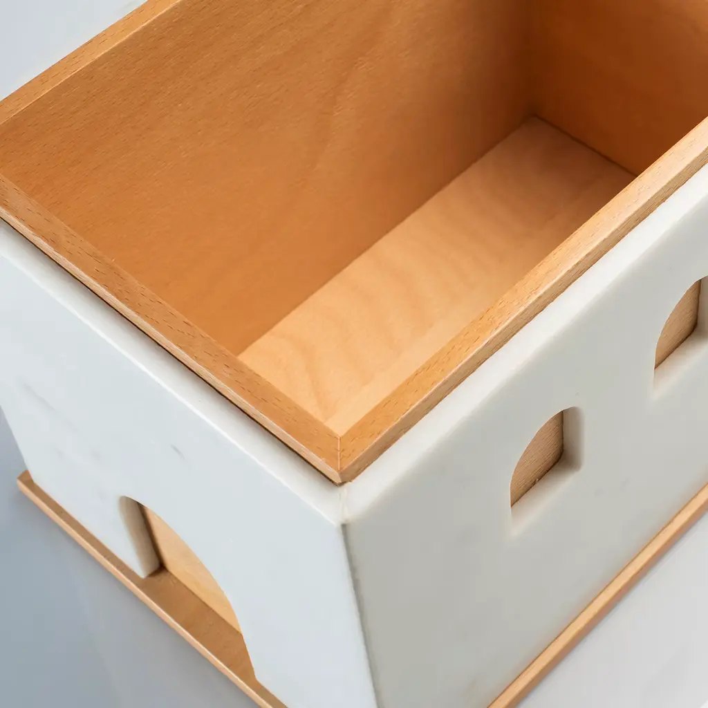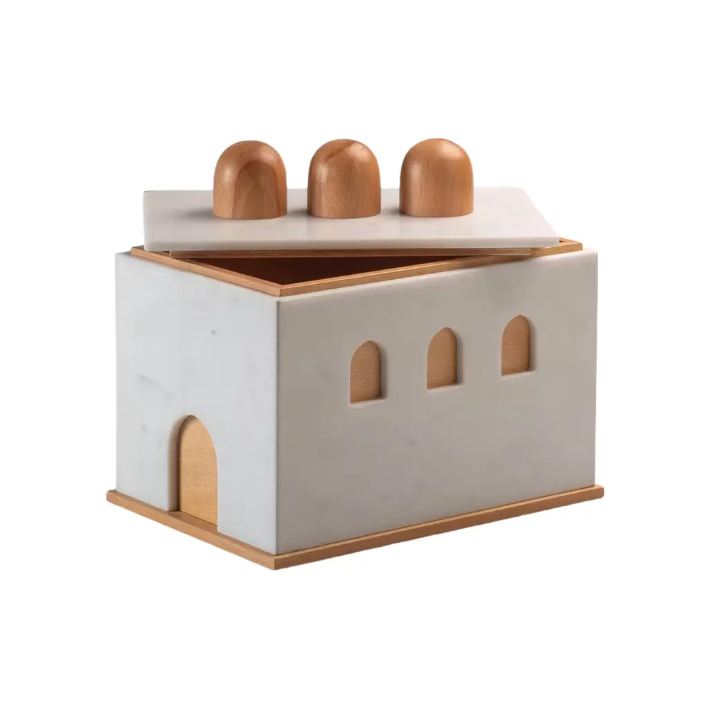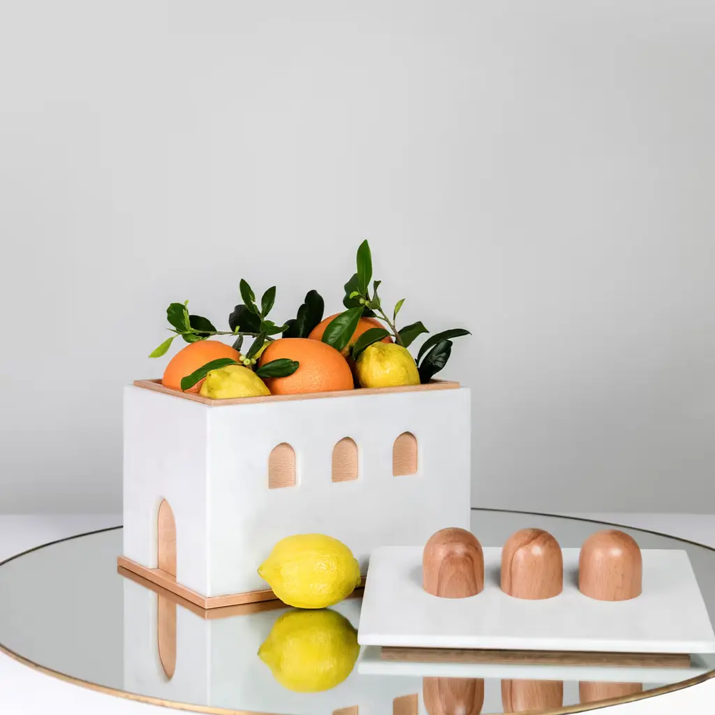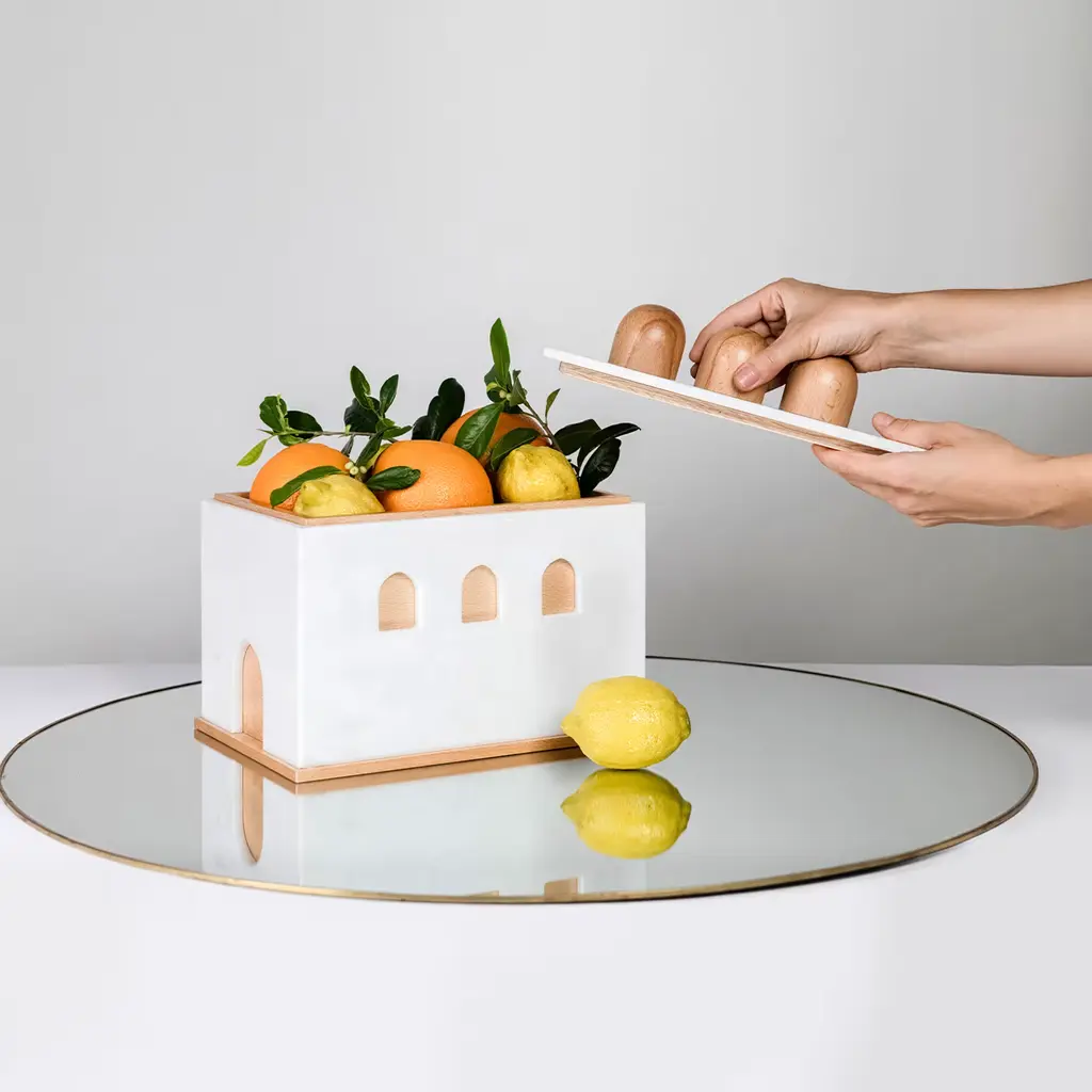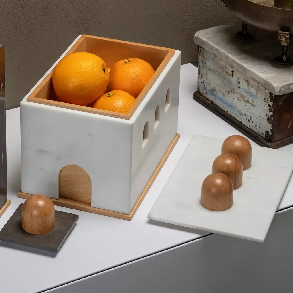 Suitable for a variety of uses from the kitchen to the bathroom, this sculptural box by Gabriele D'Angelo is a tribute to Arab-Norman architecture. The wooden domes equipping the flat lid in white marble serve as handles, revealing the ample storage unit with wooden shell and external frame in white marble for a perfectly coherent look. Two other pieces belong to the same series, please check the artisan's online catalog for more details.
