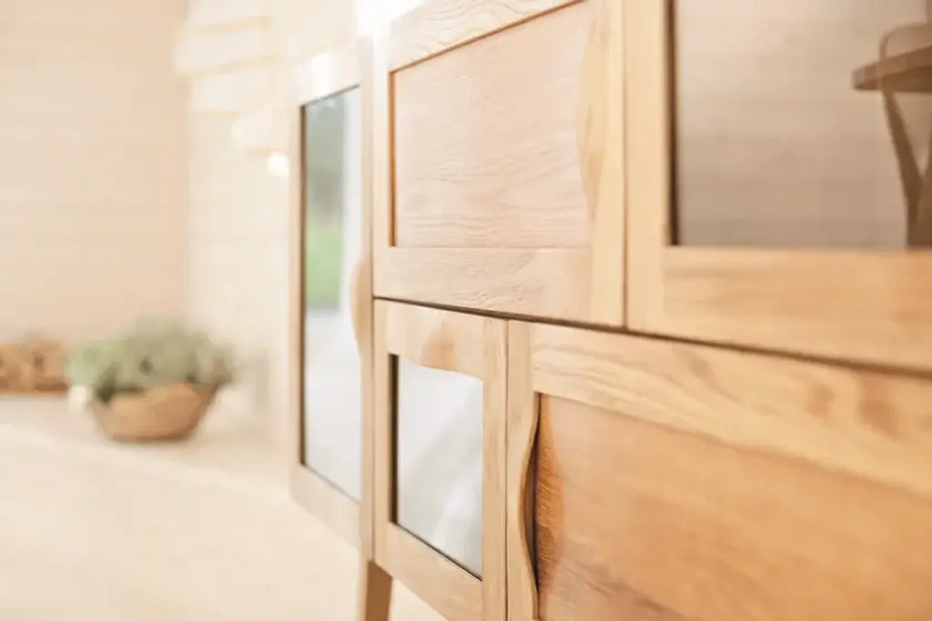 As in reality, Rainbow furniture gives us a lot of reasons to feel happy. You have the possibility to choose and mix wooden or glass doors and shelves. Designer Markus Johansson translated nature into the product this time. Perfect storage units for your hallway, dining or living room area.Rainbow is a sideboard available in solid oak, ash or birch with doors in wood and glass.