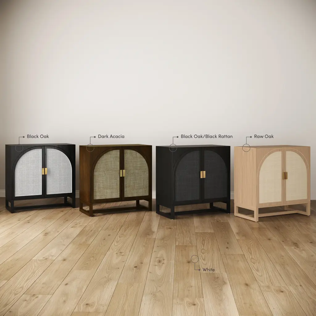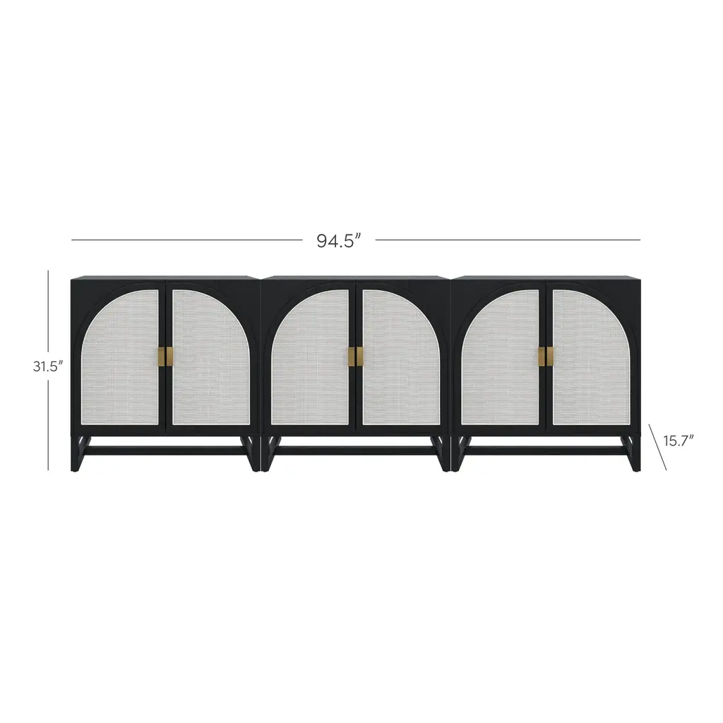Create a cohesive, mid-century inspired storage wall with this set of Paxton Storage Cabinets. Featuring arched faux rattan doors, light brushed brass accents, and a rich midnight charcoal wood veneer, each piece adds sculptural warmth and contrast to your space. Adjustable shelves offer flexible storage, while solid wood legs and leveling protectors provide lasting support. Designed to sit flush side by side, these cabinets work beautifully as a large sideboard, media console, or modular bar setup.