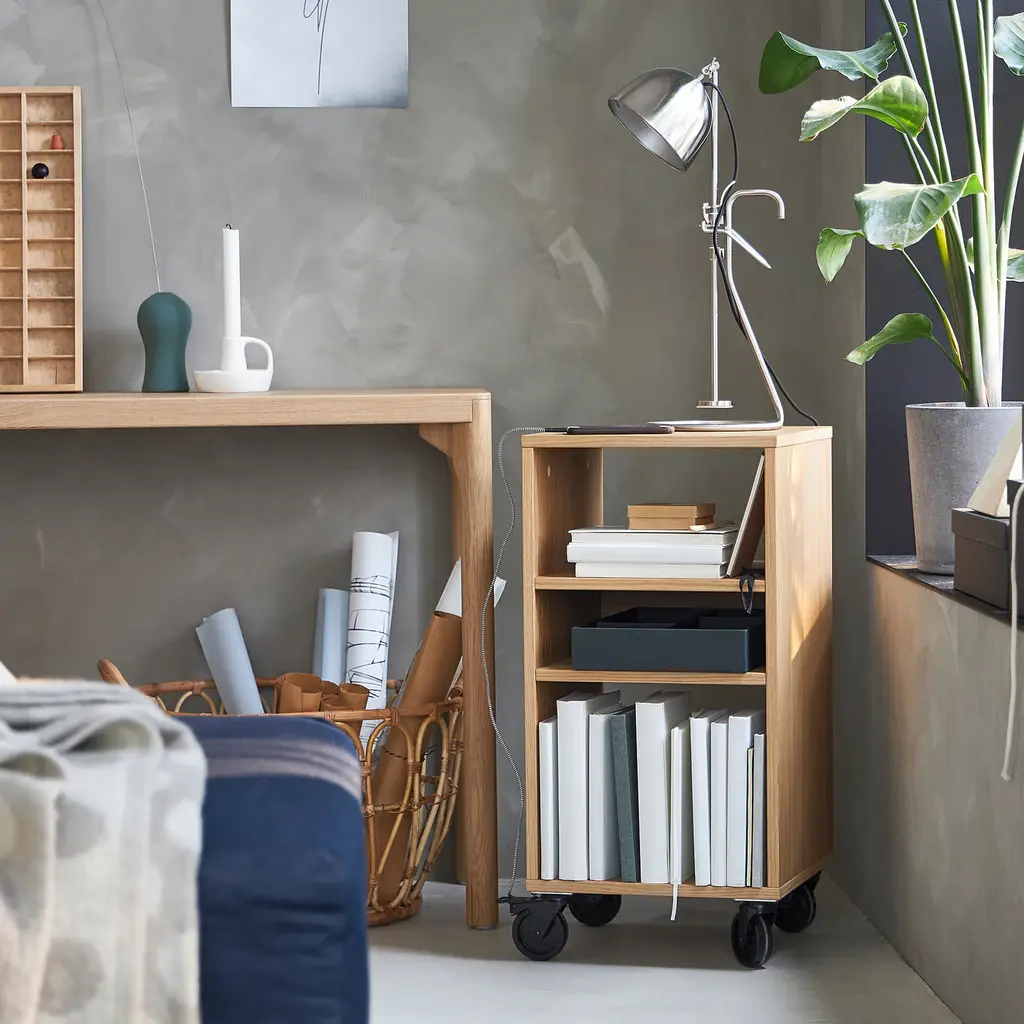 RÅVAROR Open storage unit on casters - oak veneer 13 3/8x27 1/8 ". The casters make it easy to move, and since 2 of the casters can be locked, it stays in one place. Wood veneer gives you the same look, feel and beauty as solid wood with unique variations in grain, color and texture.